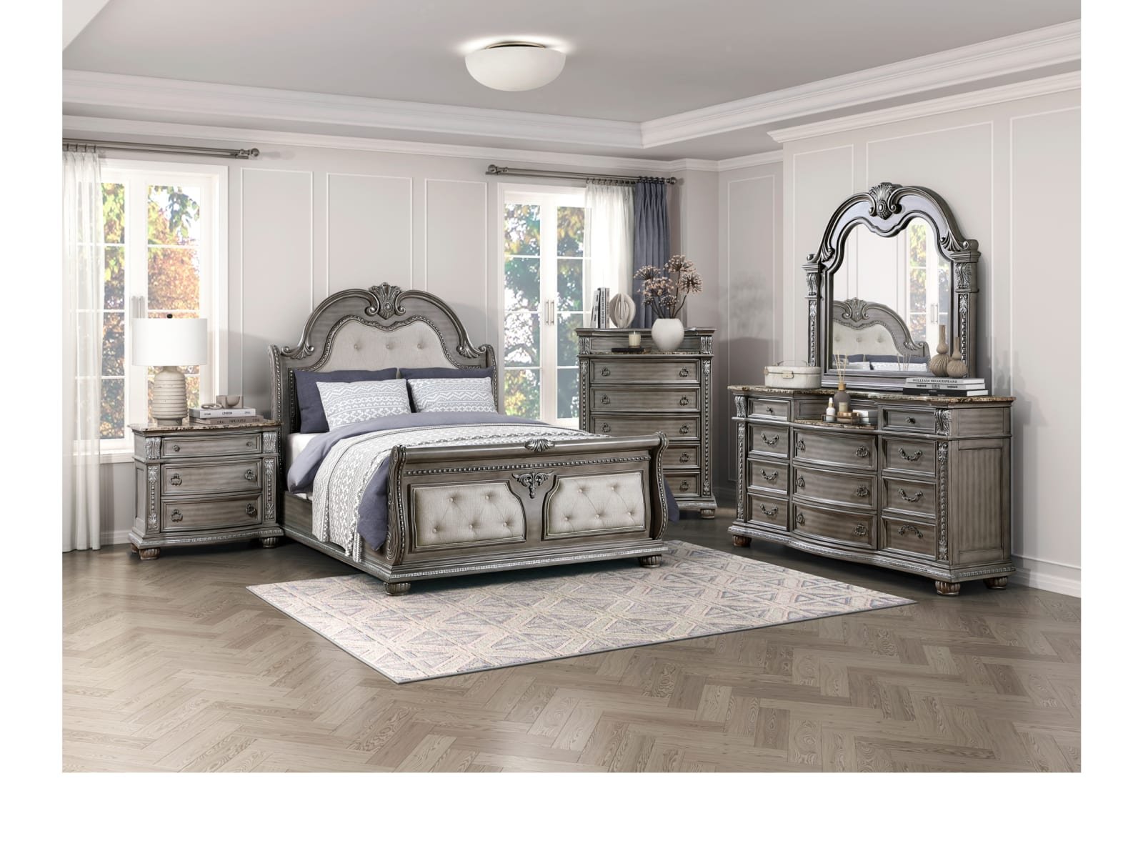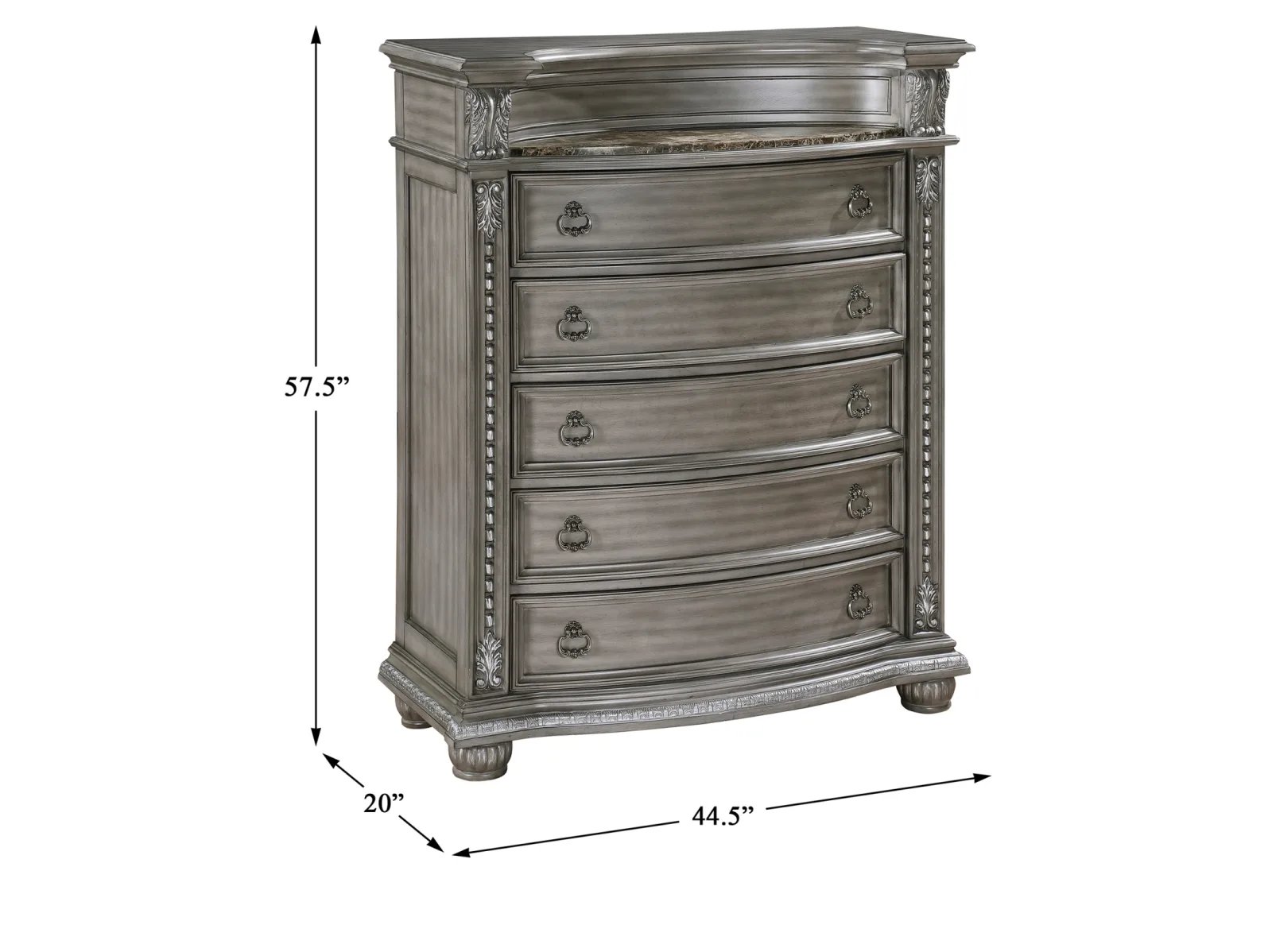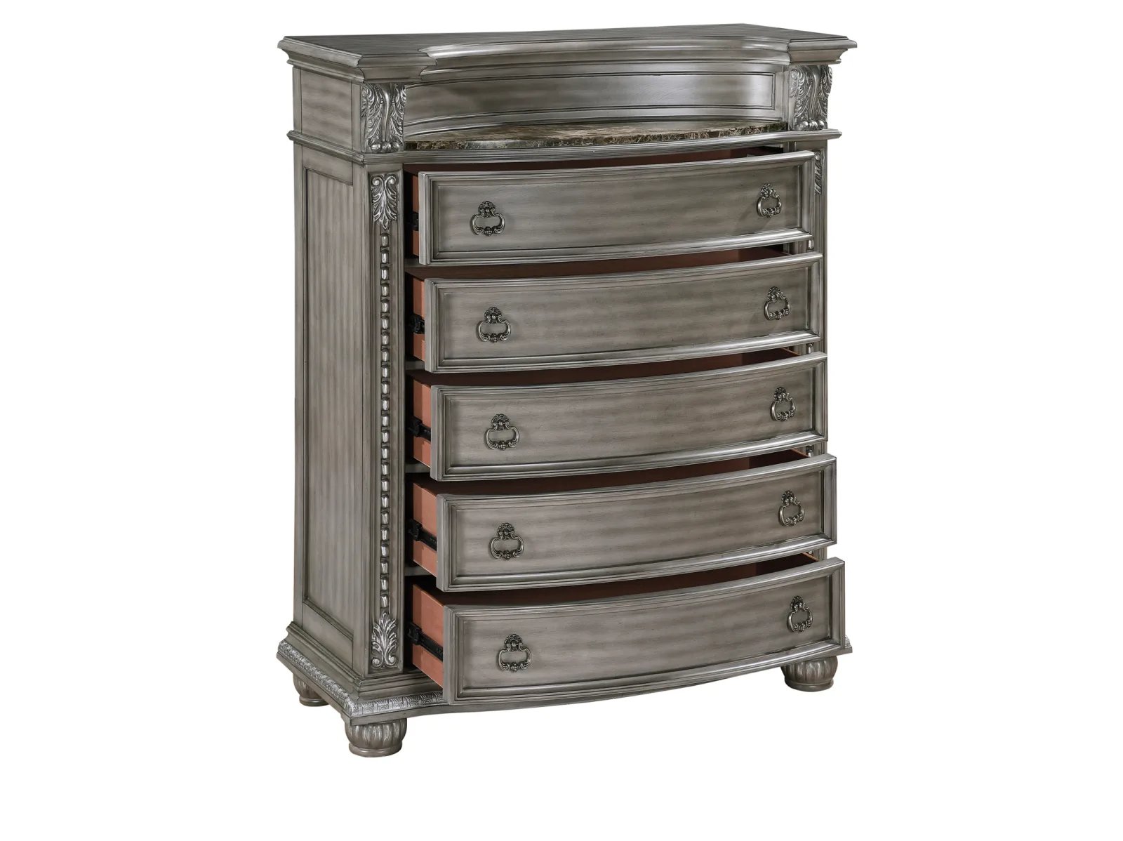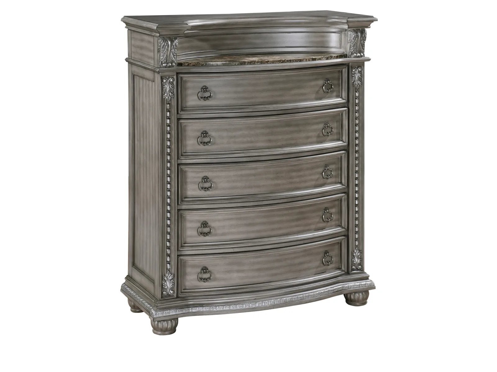 & Free ShippingThe luxurious grandeur that permeates the design of the Ackworth Collection is an amalgamation of classic accenting and traditional lines. Carved bun feet, acanthus leaf carving, bead molding, and elegant framing account for the beautiful profile that defines the chest’s design. Antique pewter-finished knob and ring pull hardware fronts the drawers, and marble tops the piece. The gray finish, over acacia veneer, features subtle silver tipping for final luxurious accent.