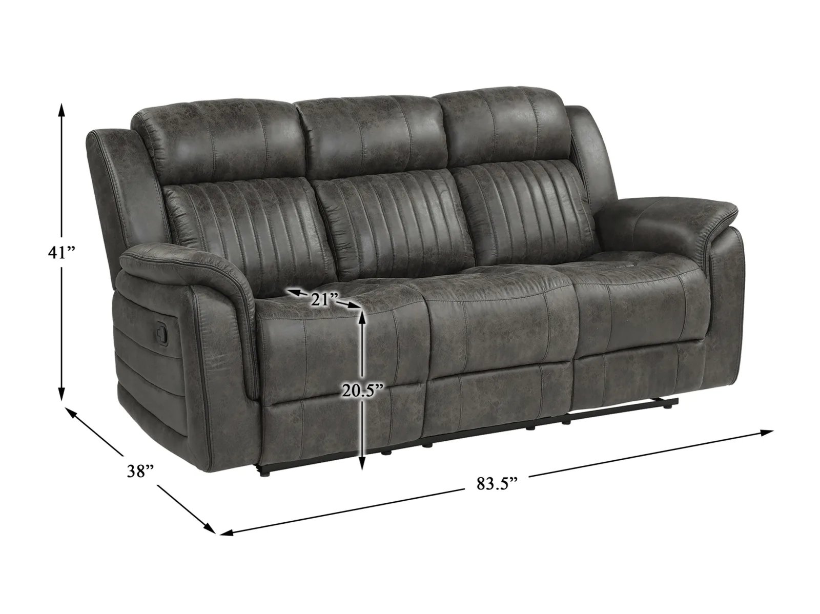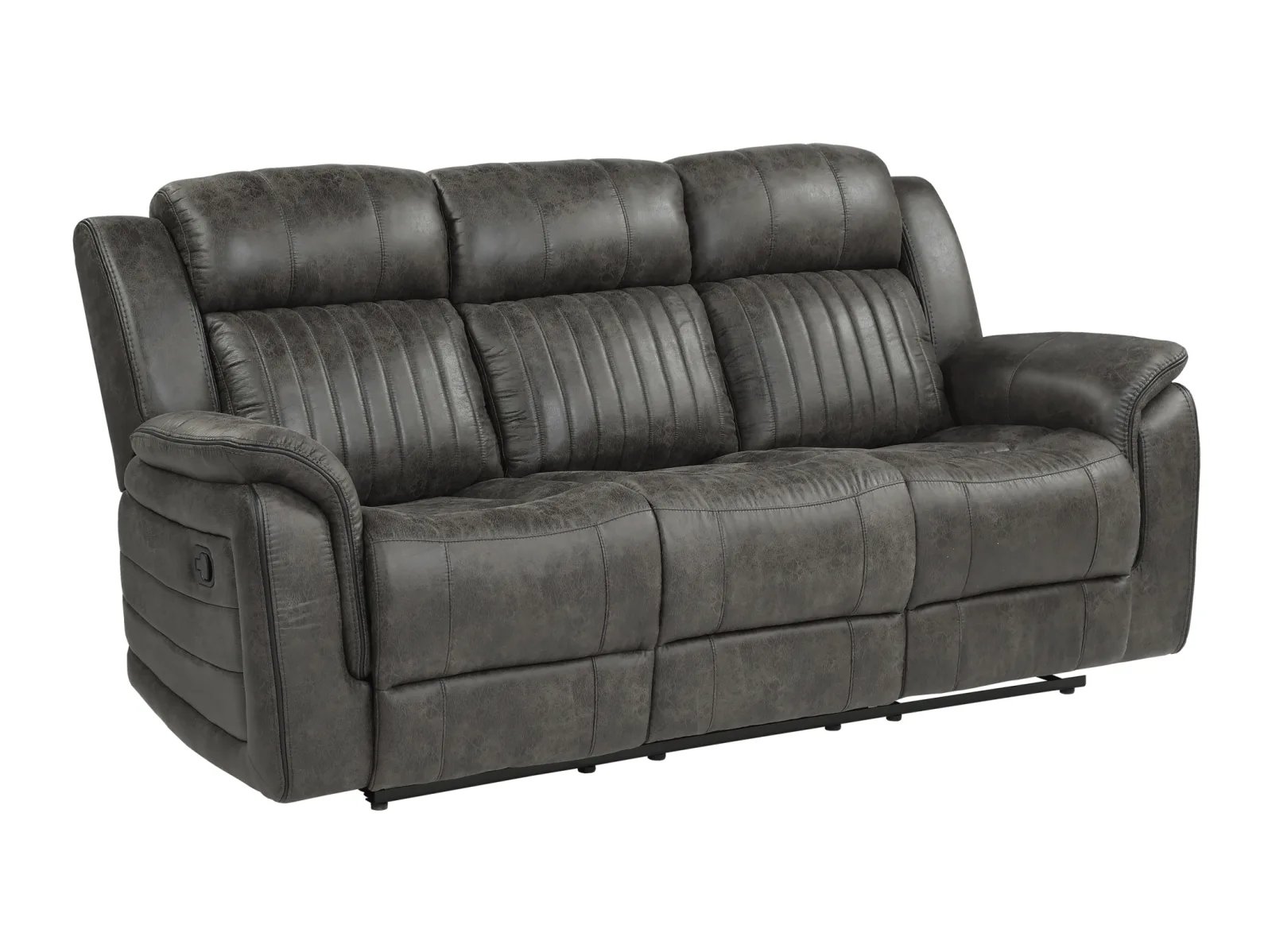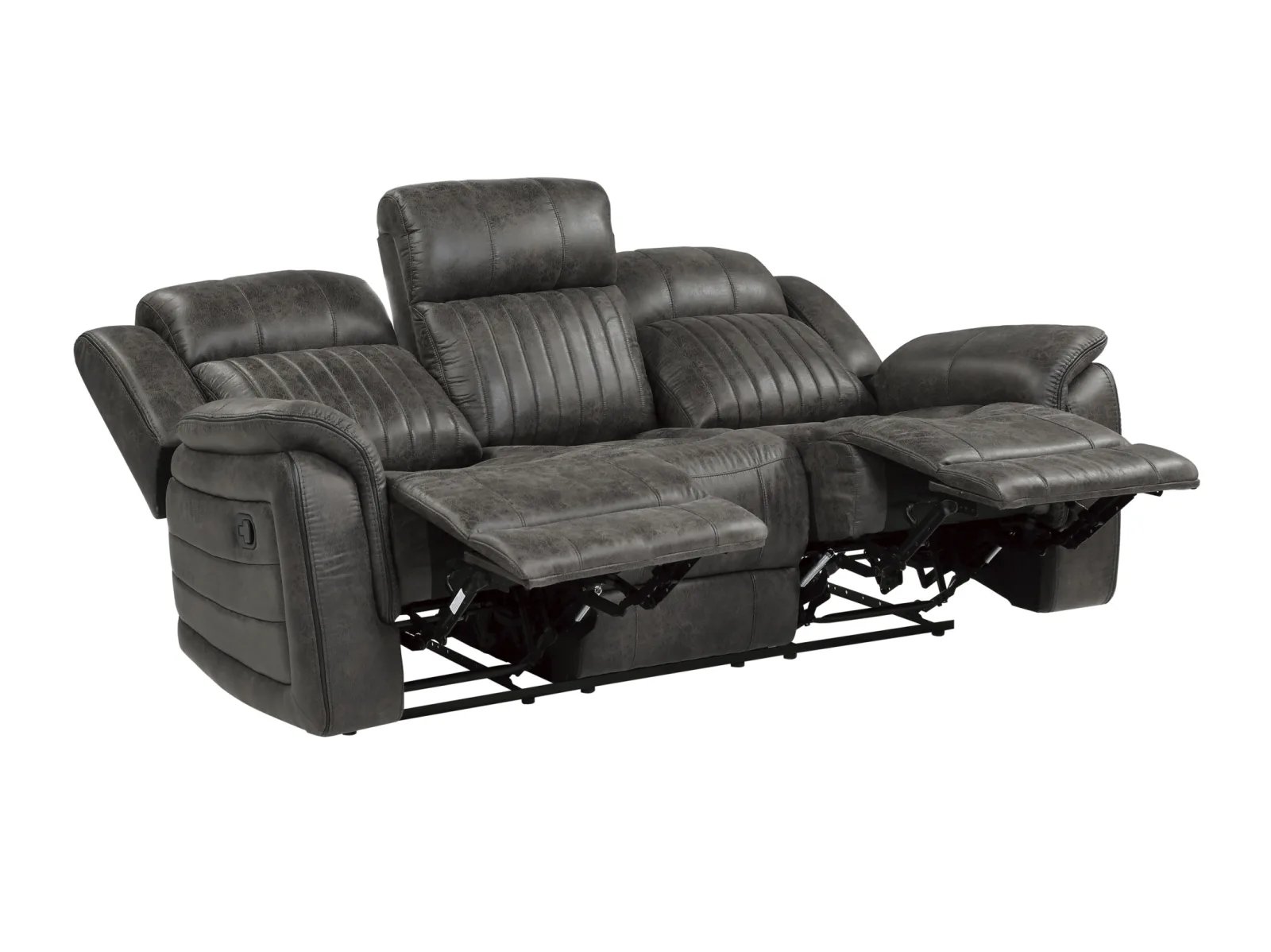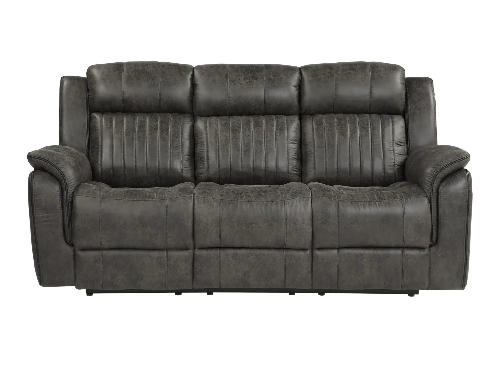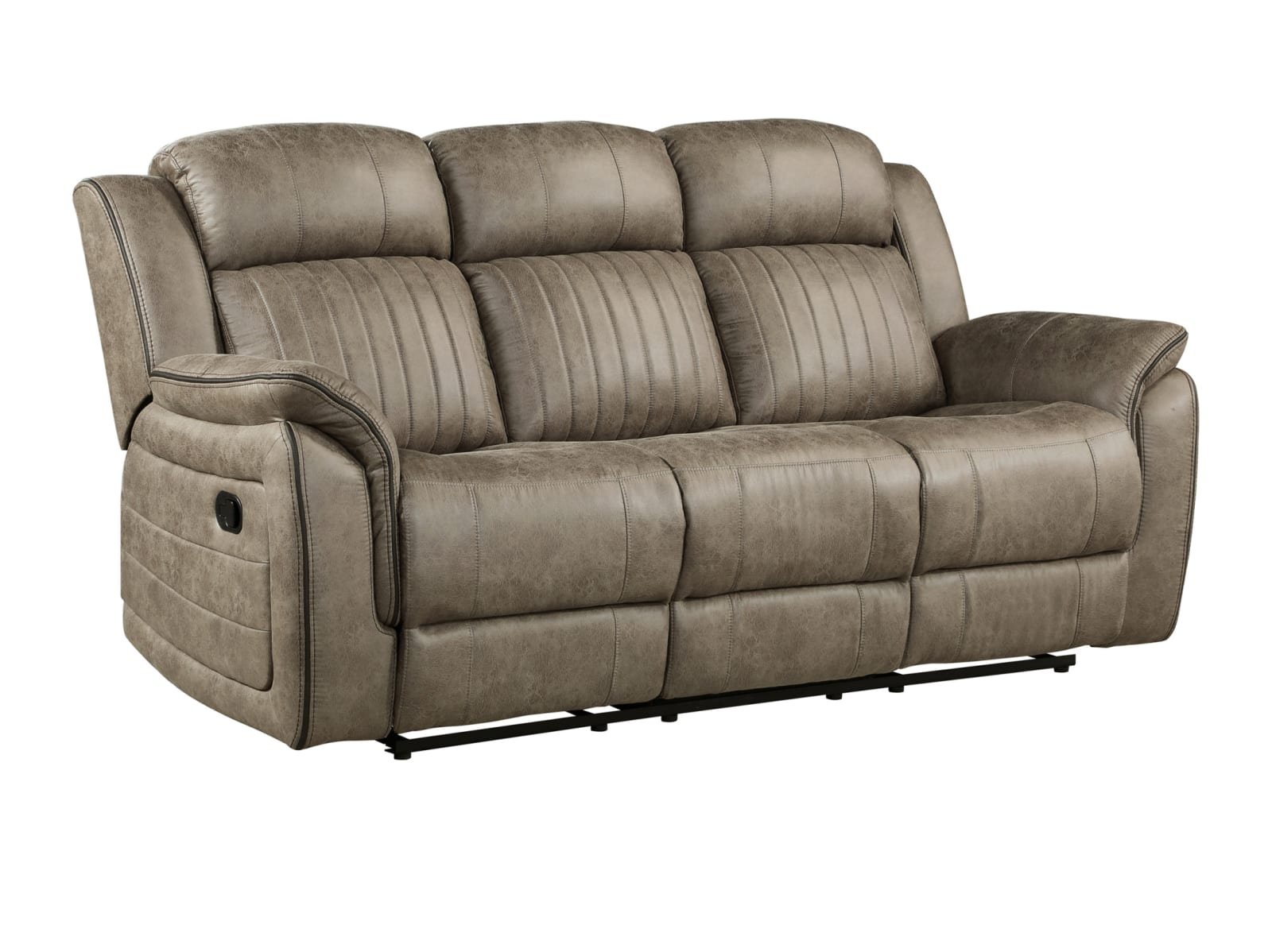 The design of the Adelia Collection provides a platform for your relaxing downtime. From the classic transitional style to the versatile neutral color of the brown-ish gray faux suede fabric covering, this sofa is the perfect addition to your living room. Plush seating features vertical tufting, pillow-top arms, enhanced by the dual end recliners of the sofa. Creating additional function is the center console providing secure placement of beverages and lift top hidden storage. The reclining mechanism is engaged with a pull of the side mounted tabs, taking you from seated to prone in an easy motion.