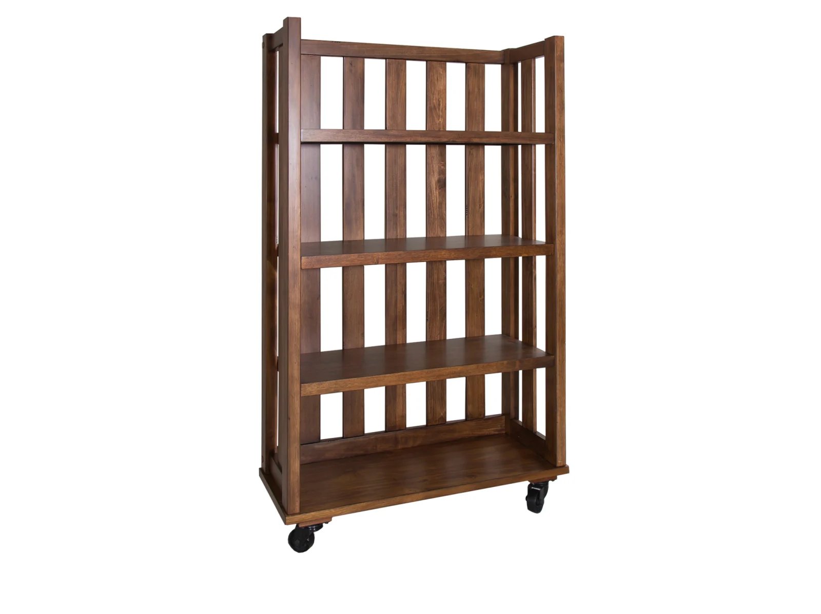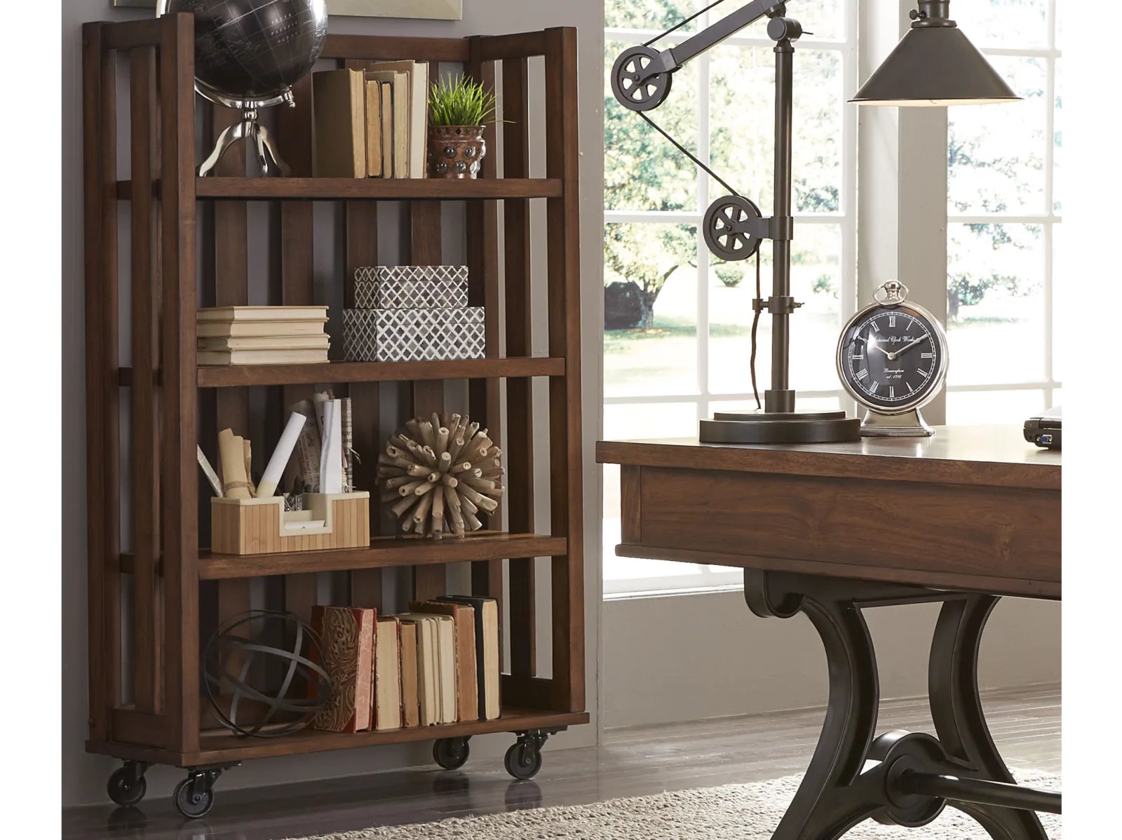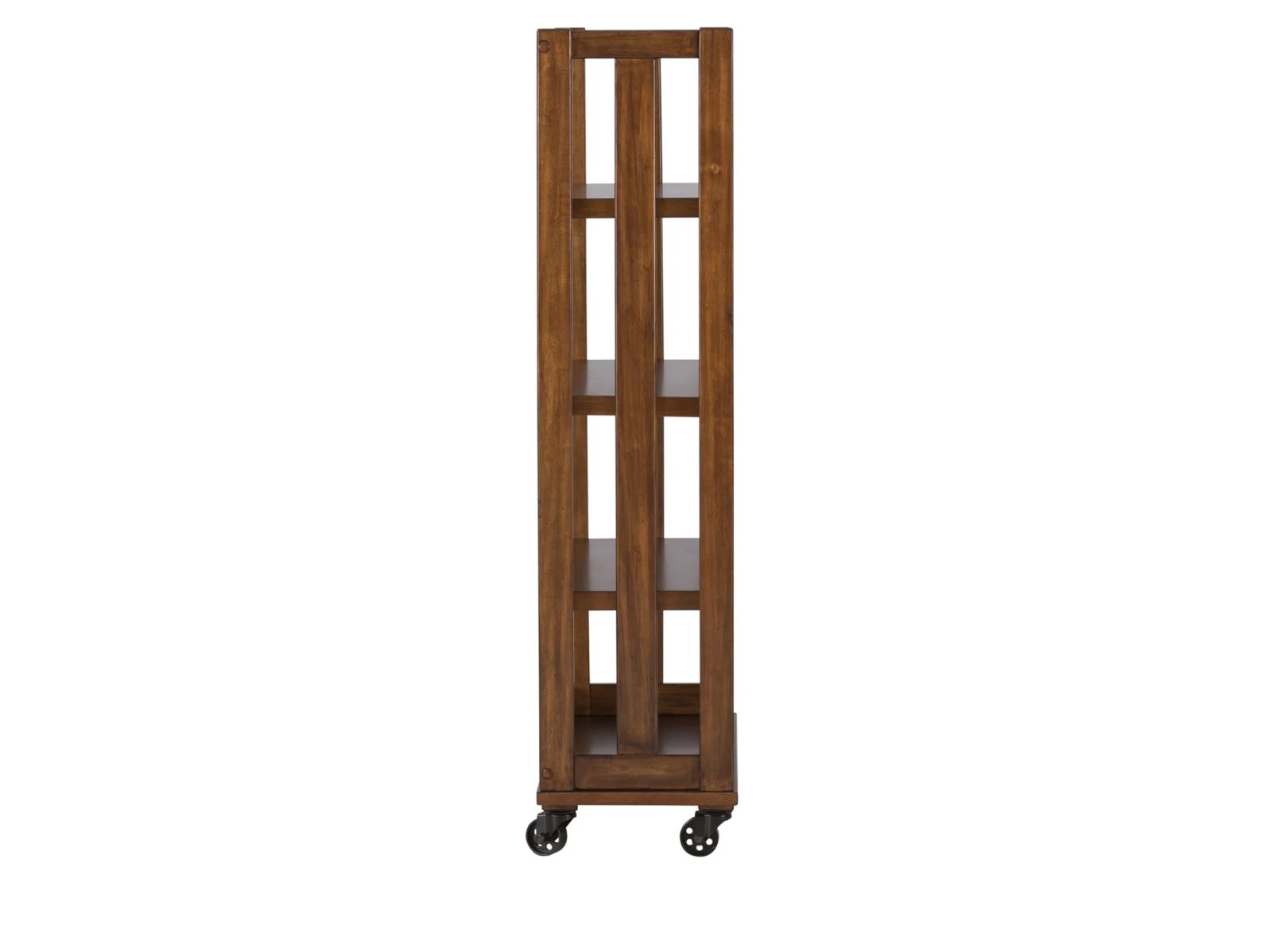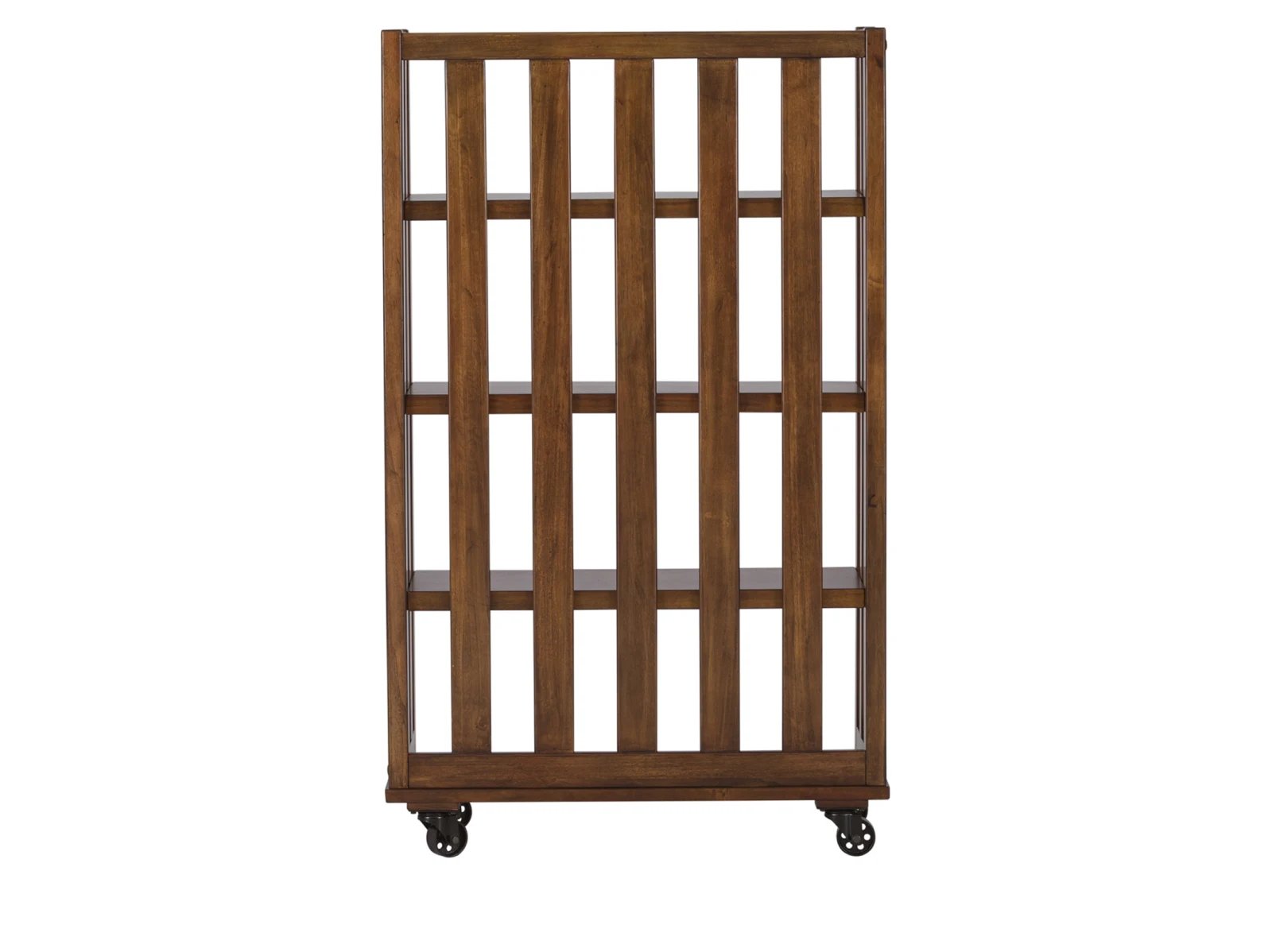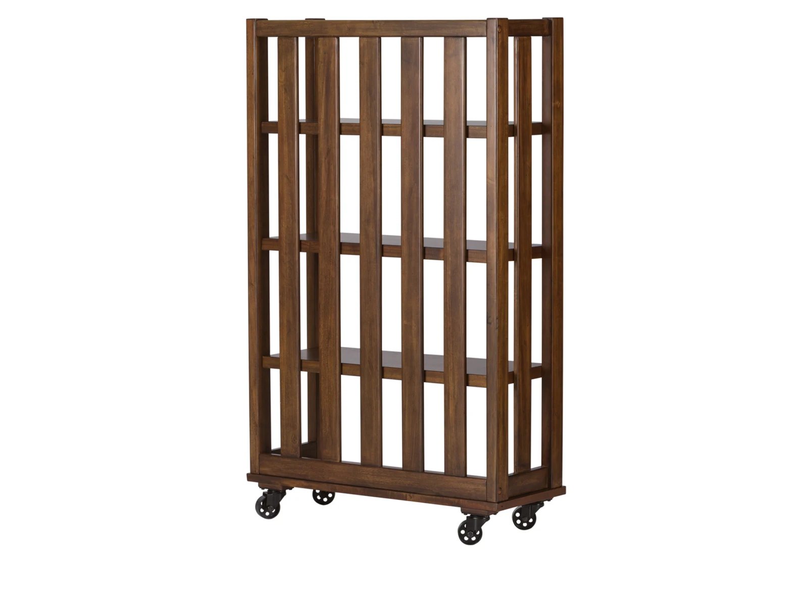 & Free ShippingCreate an open and natural feeling with the Aedra Bookcase. Crafted with poplar solids and acacia veneers, this piece features an urban cobblestone brown finish, unique open slat design, and industrial metal casters. Storage abounds with the three shelves and bottom panel that acts like a fourth shelf.