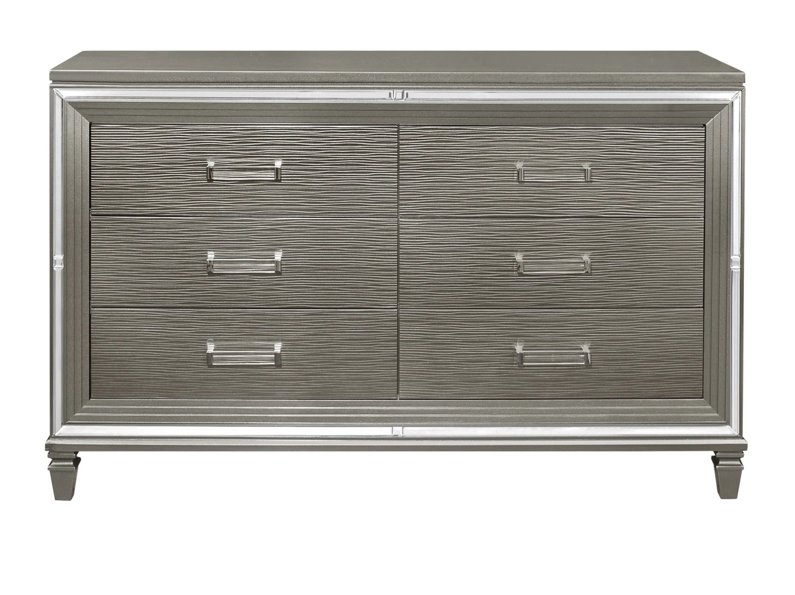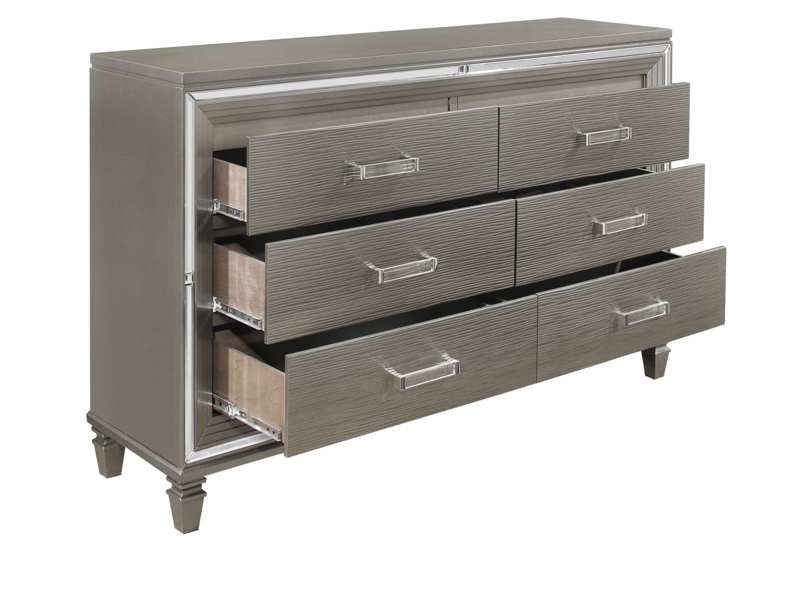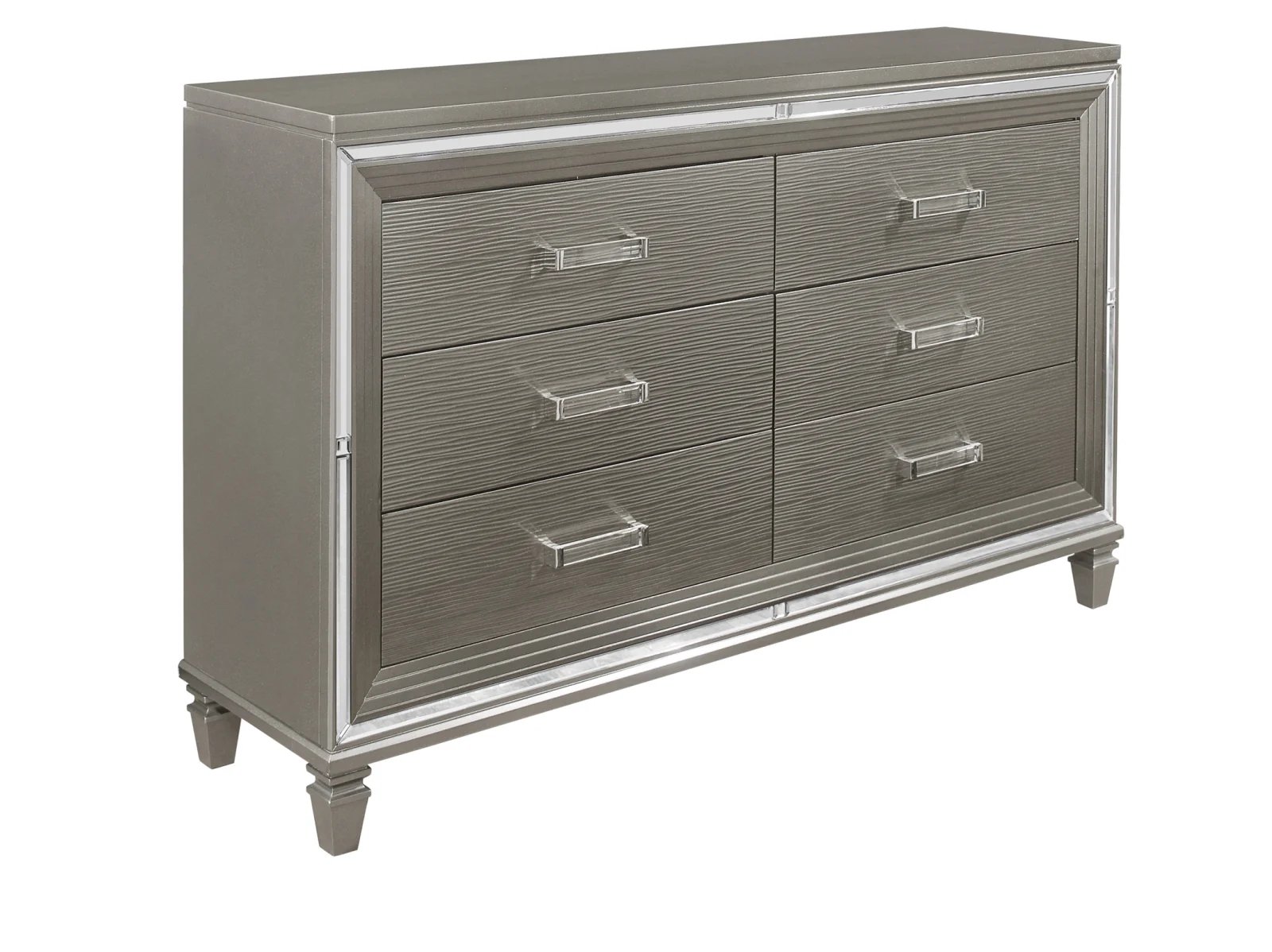 Designed to help your bedroom reach its full glamorous potential, the Amancio Collection’s unique attributes blend to create a stylish and functional addition to your lifestyle. Mirrored framing provides dramatic enhancement to each piece in the collection, while LED back-lighting, from the vertical headboard panels and mirror, illuminates and highlights the white or silver-grey metallic finish of the collection. Acrylic hardware provides unobtrusive decorative touch to the drawer fronts of the case pieces and storage footboard, with the metallic silver bi-cast vinyl-covered padded headboard insert lending decorative contrast to the finish of the collection. Hidden jewelry drawers in the dresser create discreet storage space for your fancy accoutrements. Also providing functional display to the collection is the available vanity. The mirrored front paired with drawer storage creates the perfect platform to prepare your glamorous self.