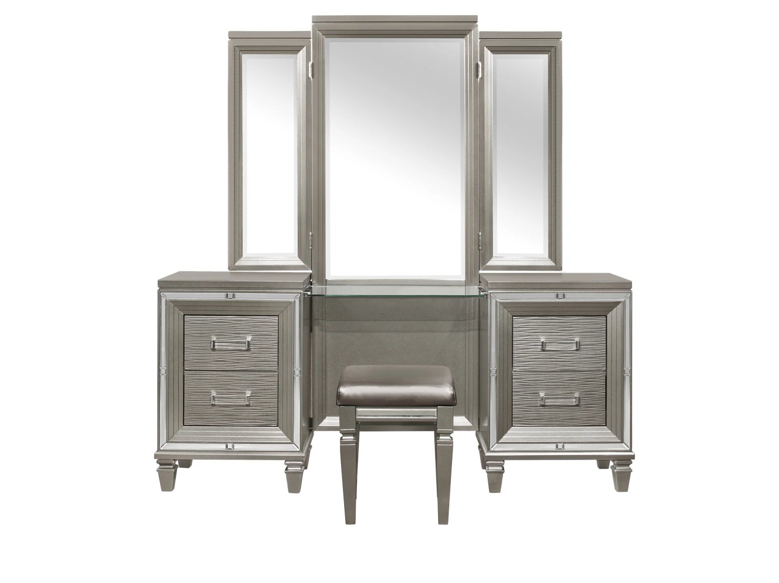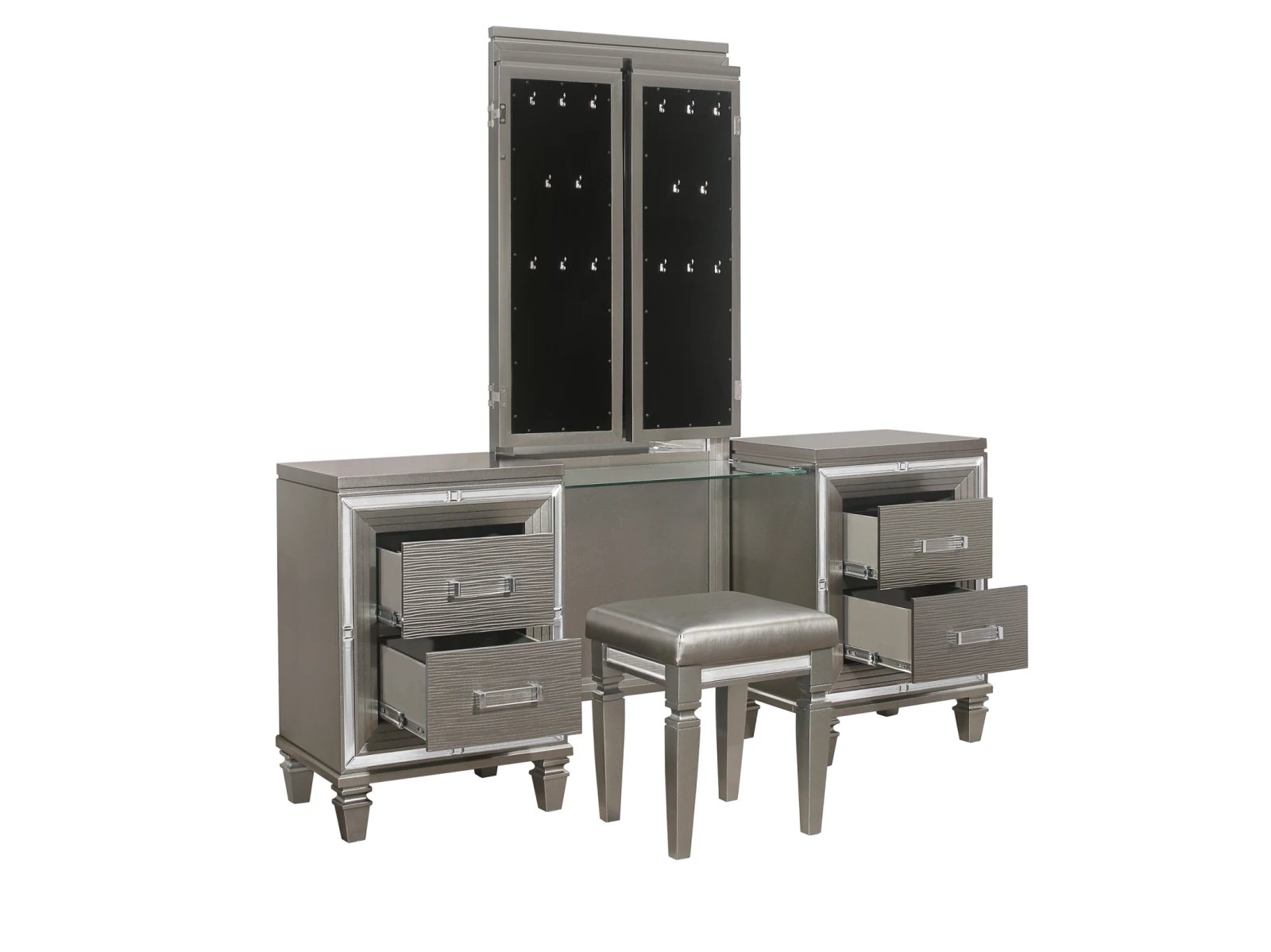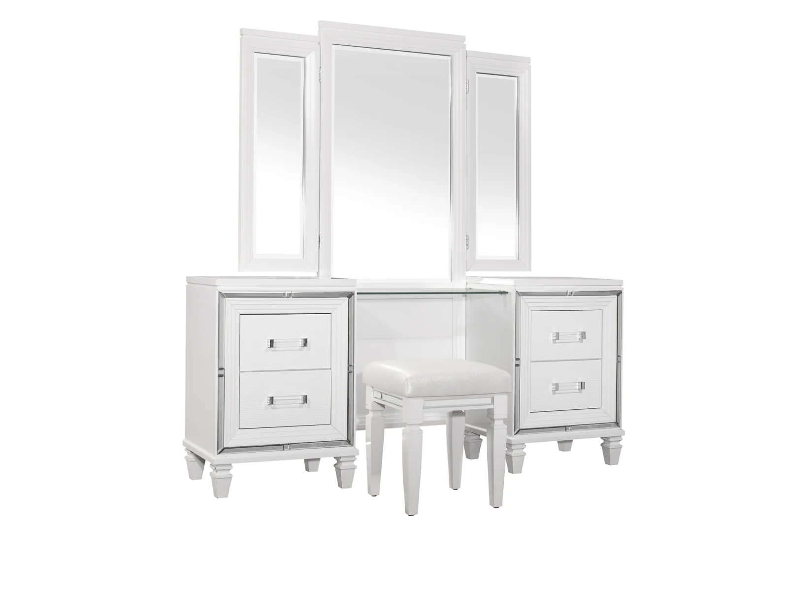 Designed to help your bedroom reach its full glamorous potential, the Amancio Collection’s unique attributes blend to create a stylish and functional addition to your lifestyle. Mirrored framing provides dramatic enhancement to each piece in the collection, while LED back-lighting, from the vertical headboard panels and mirror, illuminates and highlights the white or silver-grey metallic finish of the collection. Acrylic hardware provides unobtrusive decorative touch to the drawer fronts of the case pieces and storage footboard, with the metallic silver bi-cast vinyl-covered padded headboard insert lending decorative contrast to the finish of the collection. Hidden jewelry drawers in the dresser create discreet storage space for your fancy accoutrements. Also providing functional display to the collection is the available vanity. The mirrored front paired with drawer storage creates the perfect platform to prepare your glamorous self.