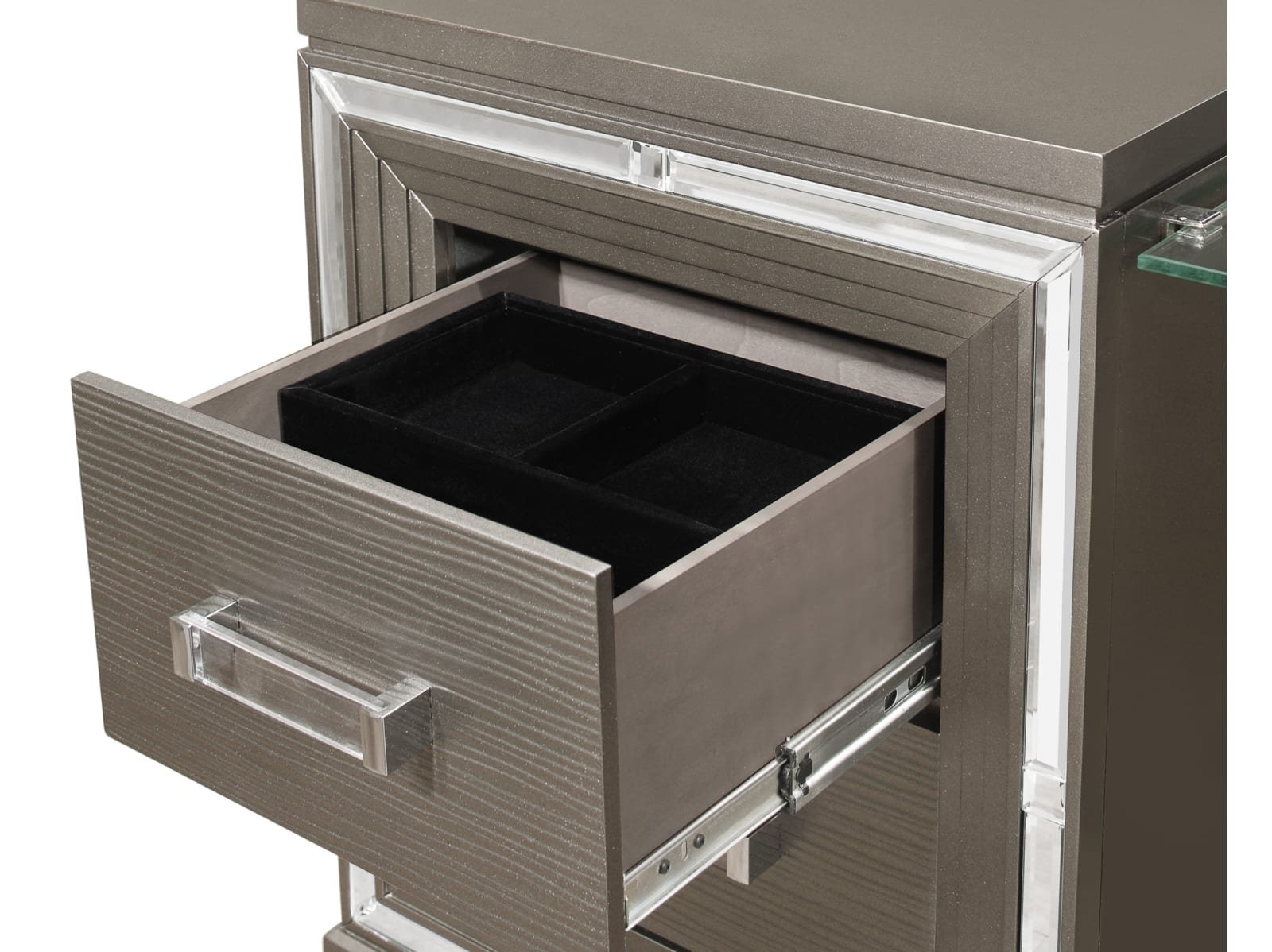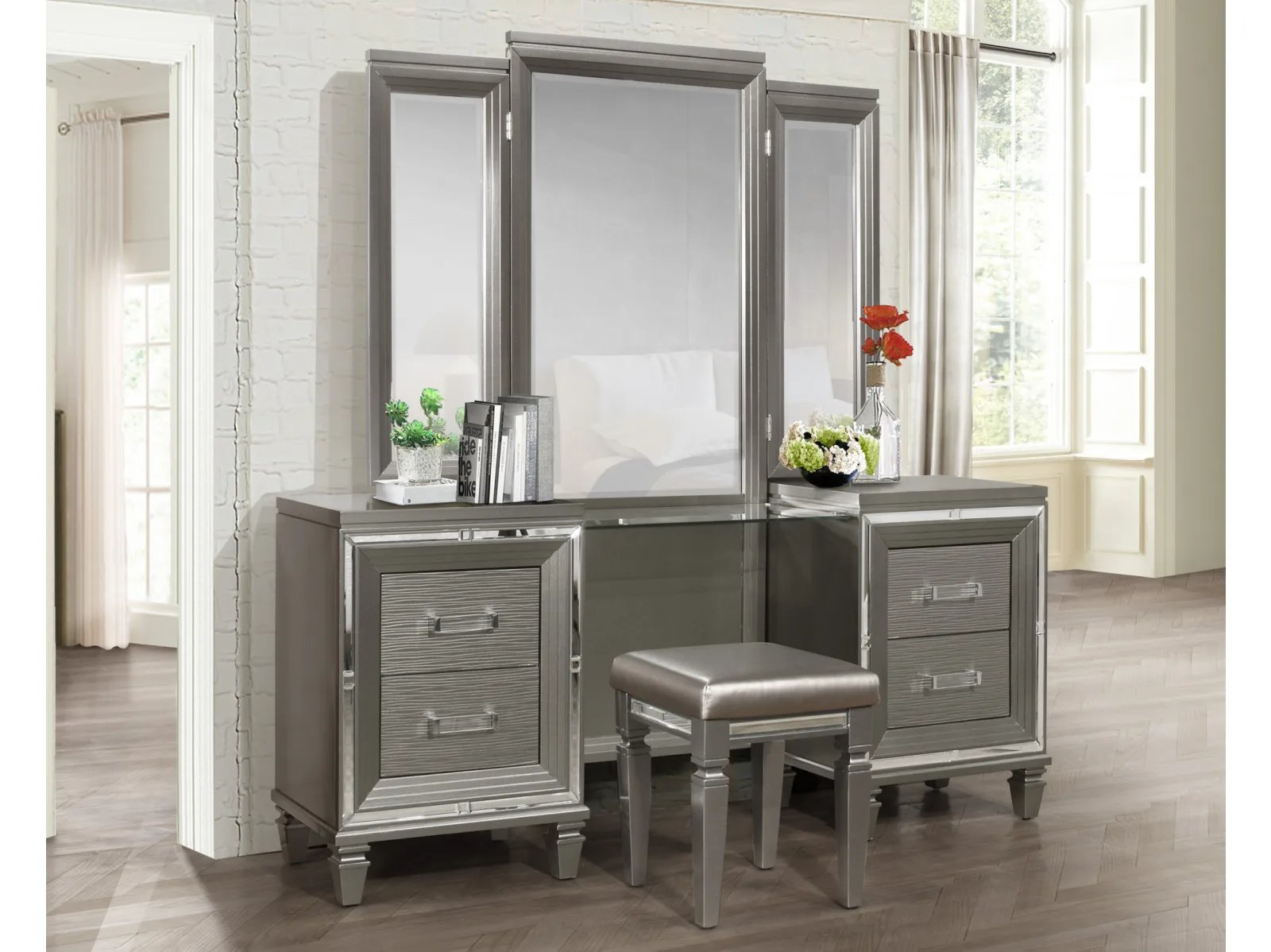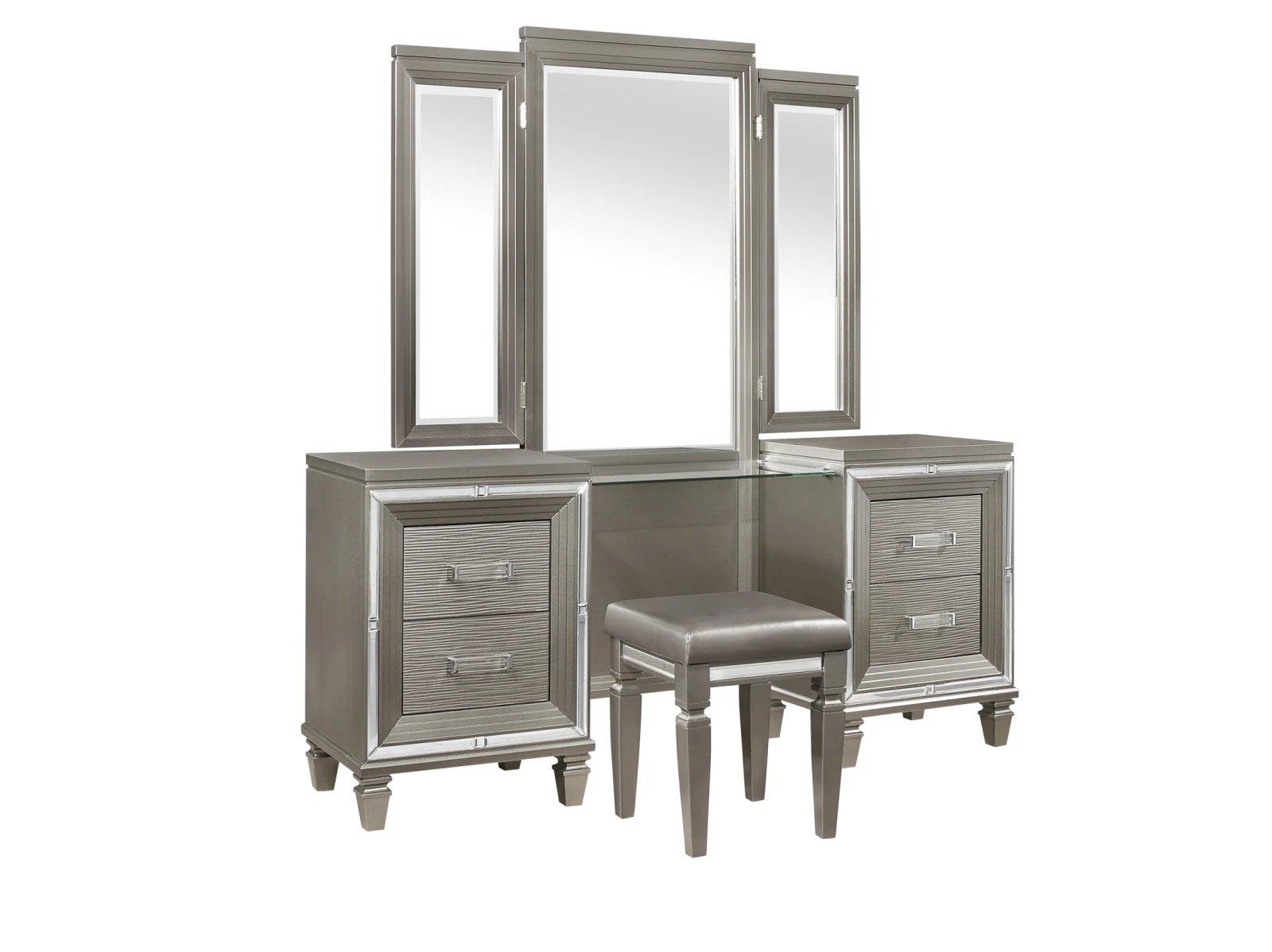 Designed to help your bedroom reach its full glamorous potential, the Amancio Collection’s unique attributes blend to create a stylish and functional addition to your lifestyle. Mirrored framing provides dramatic enhancement to each piece in the collection, while LED back-lighting, from the vertical headboard panels and mirror, illuminates and highlights the white or silver-grey metallic finish of the collection. Acrylic hardware provides unobtrusive decorative touch to the drawer fronts of the case pieces and storage footboard, with the metallic silver bi-cast vinyl-covered padded headboard insert lending decorative contrast to the finish of the collection. Hidden jewelry drawers in the dresser create discreet storage space for your fancy accoutrements. Also providing functional display to the collection is the available vanity. The mirrored front paired with drawer storage creates the perfect platform to prepare your glamorous self.