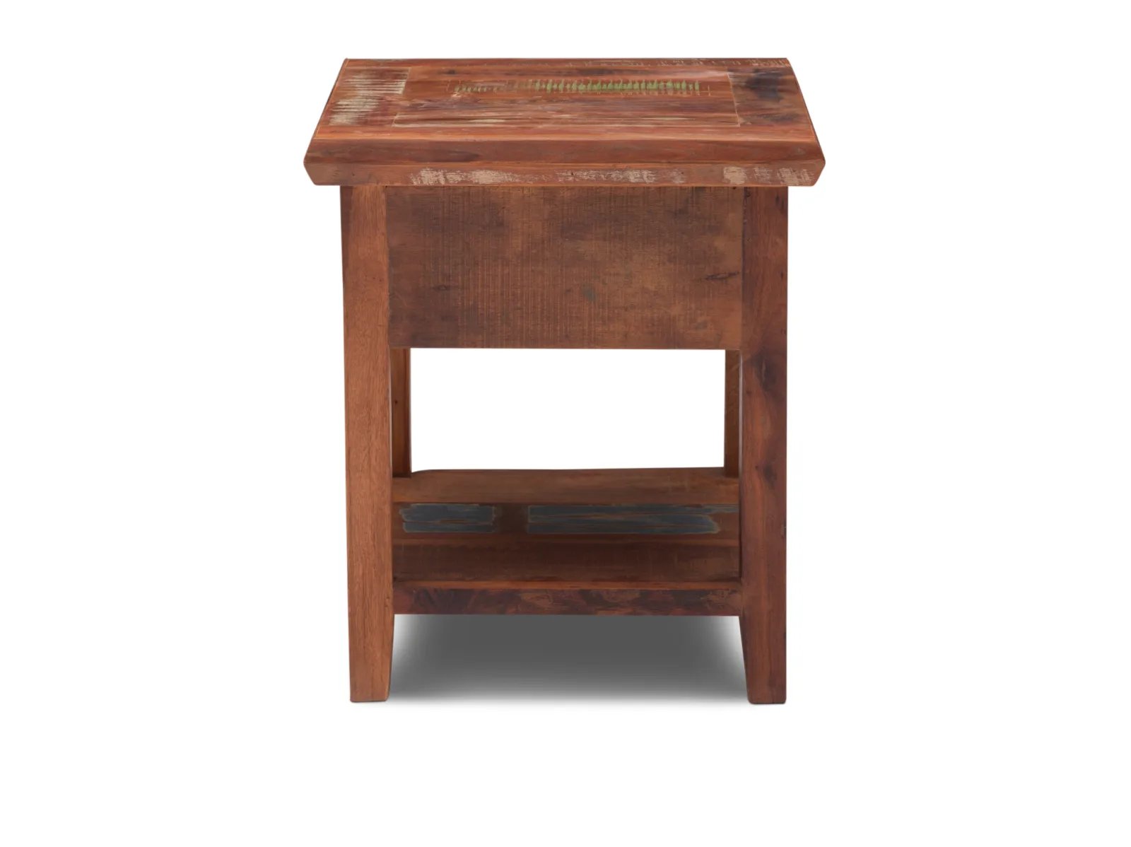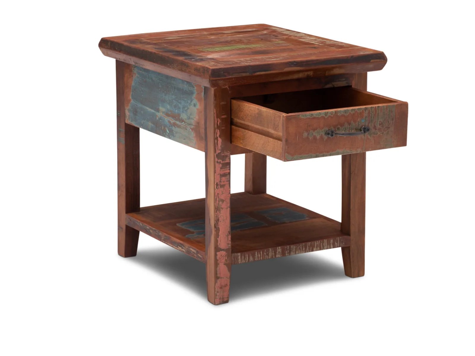 & Free ShippingCrafted entirely from recycled hardwoods with preserved saw marks and paint residue, the Antiqua End Table is a stunning example of the in-demand reclaimed look that’s full of intriguing colors and authentic texture. The one-of-a-kind end table features a storage drawer that’s outfitted with a timeless metal pull handle, and it boasts a convenient storage shelf located between its chamfered square post legs. If you’re looking for an end table with a traditional silhouette and plenty of reclaimed character, then look no further than the Antiqua End Table.