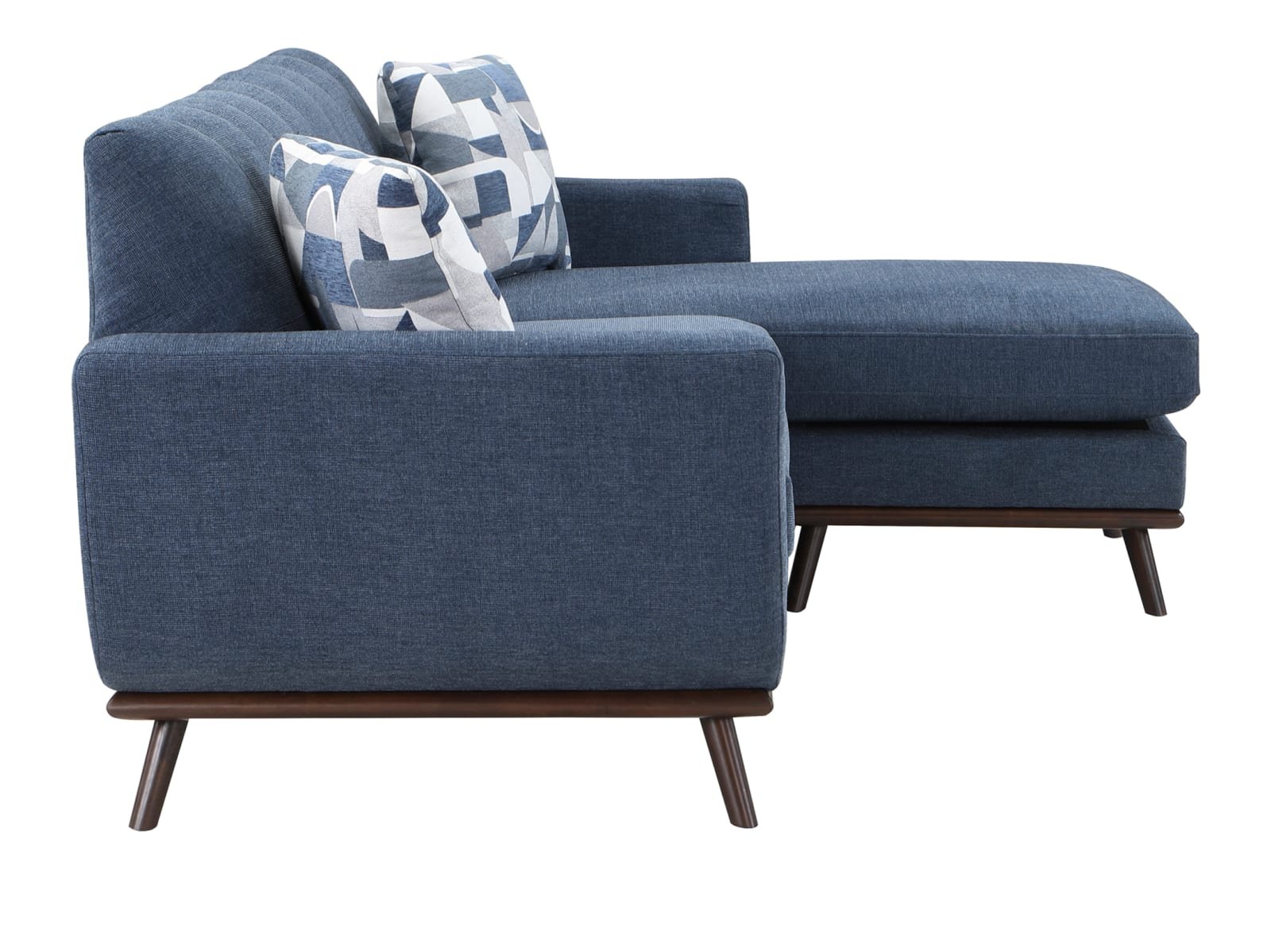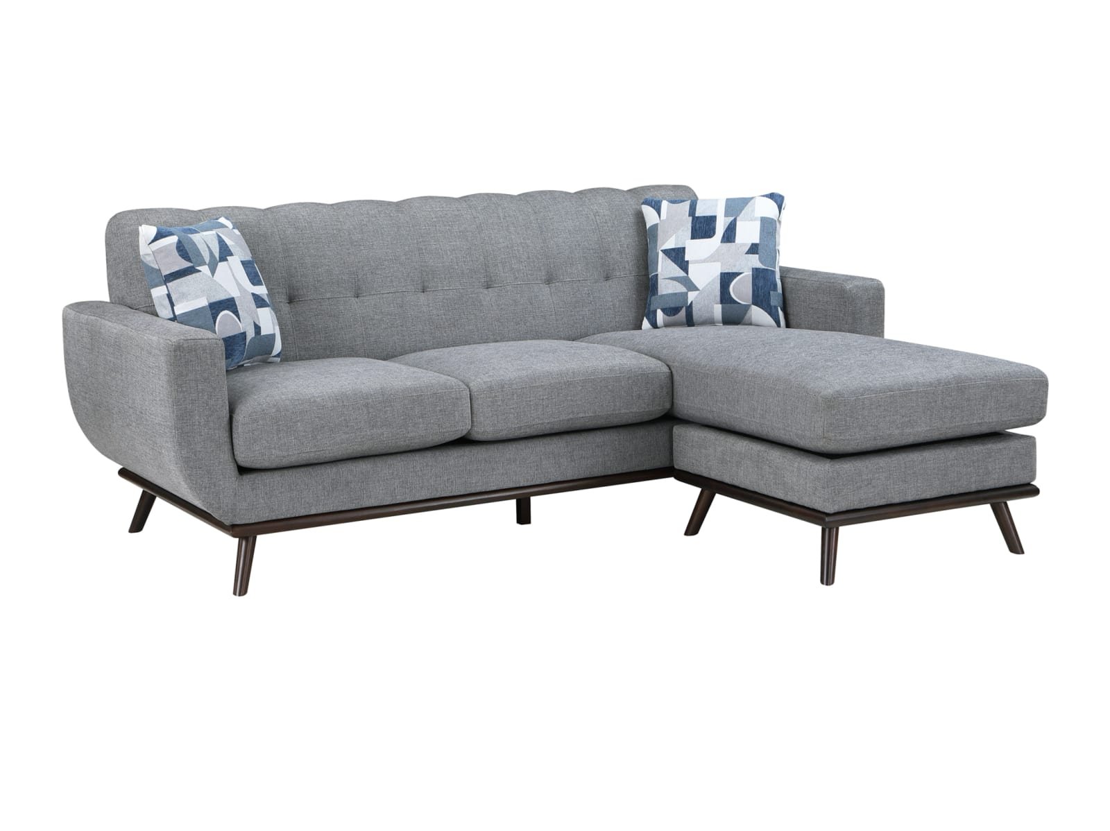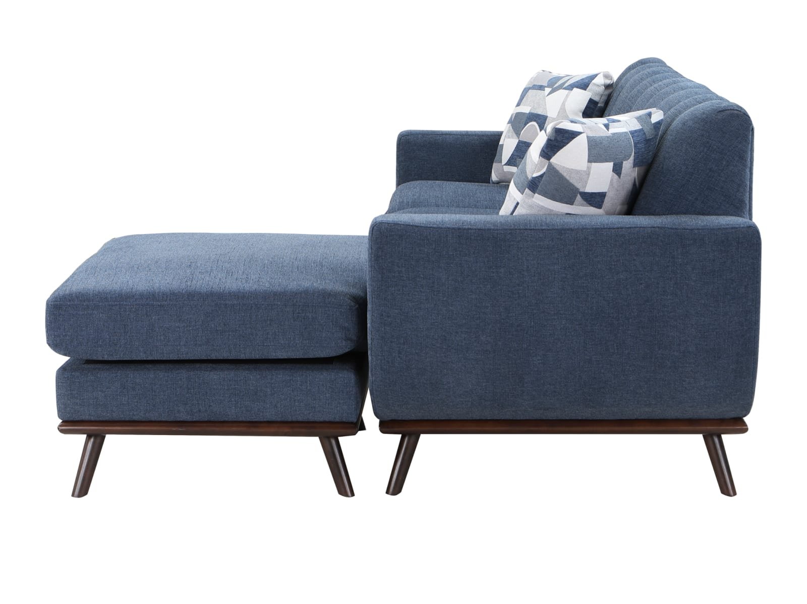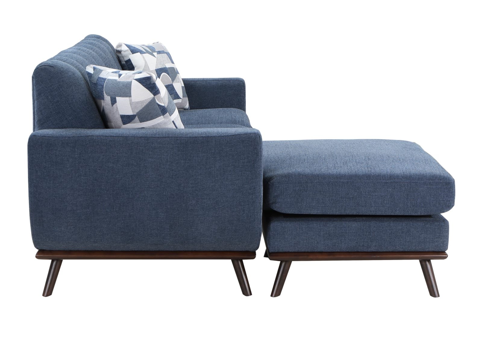 Mid-Century Modern inspired design comprises the timeless look of the Arbor Vitae Collection. The sofa-chaise’s configuration allows for left or right-side placement of the extension ottoman for a perfect fit within your space. Gray or blue chenille covers the modern frame with geometric print toss pillows, walnut-finished wood base rail and legs providing complementing accent to the group. Contour stitching lends scalloped detail to the seatback’s profile, and front, while the prominent framing of the sofa-chaise’s arms solidifies it retro-inspired form. The collection also features reversible seat cushions.