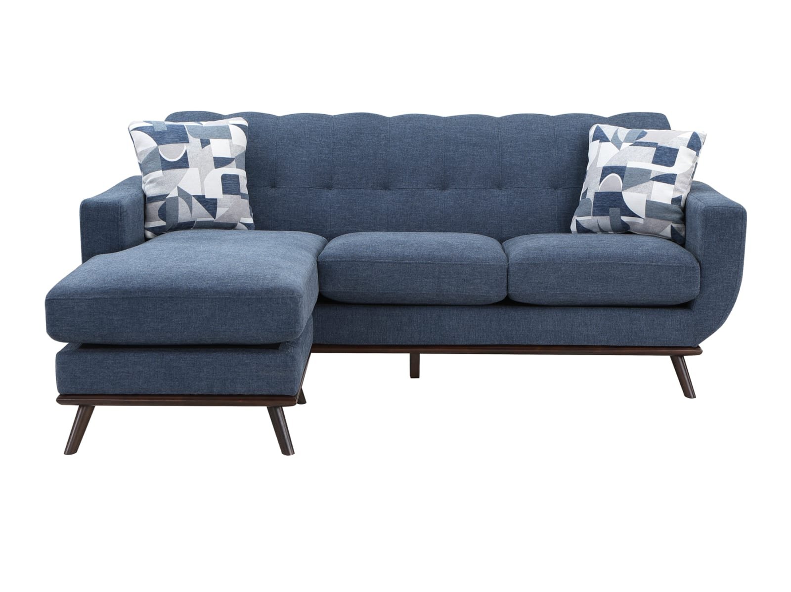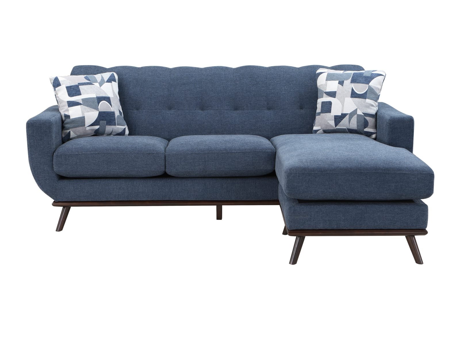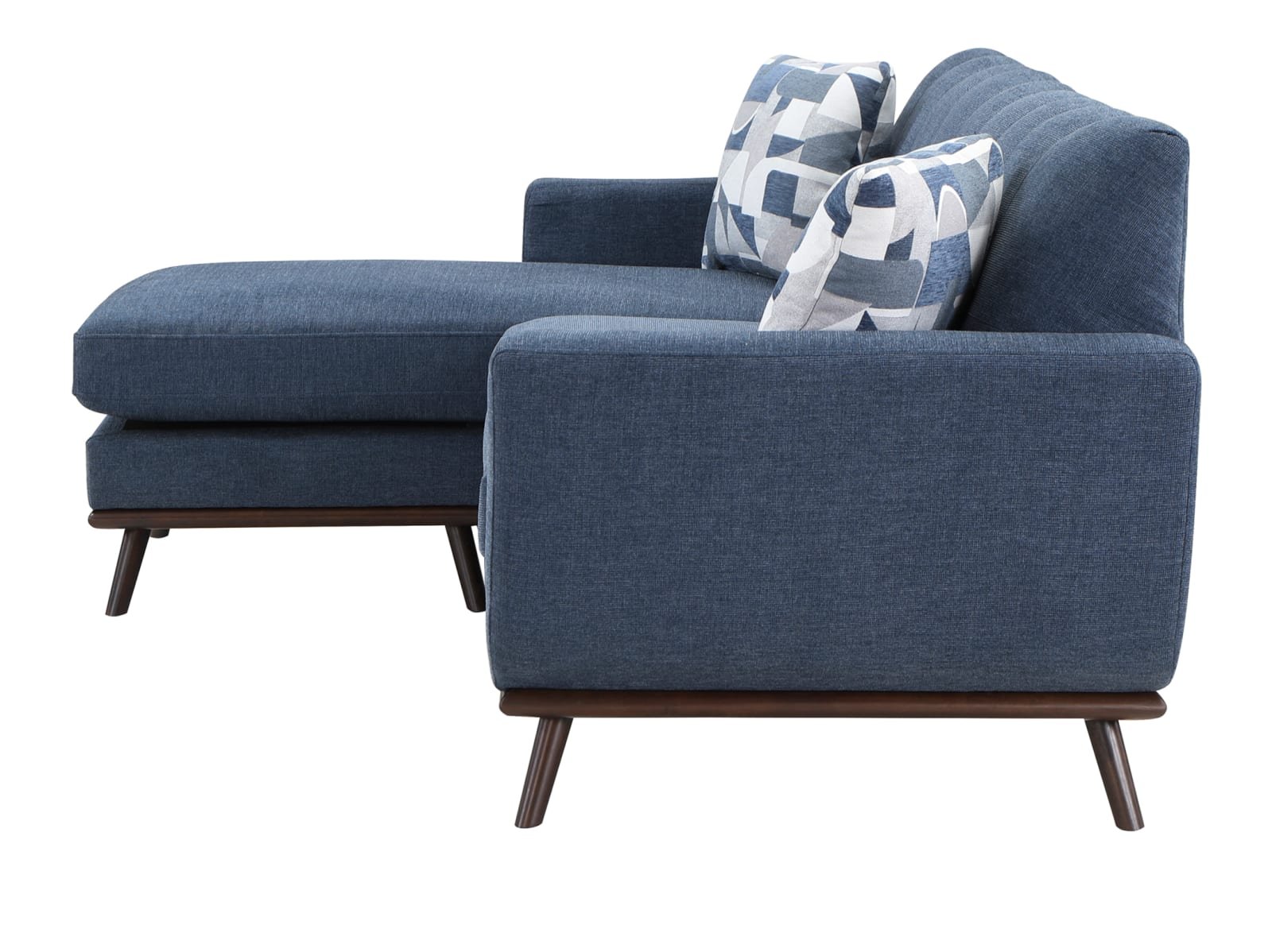Mid-Century Modern inspired design comprises the timeless look of the Arbor Vitae Collection. The sofa-chaise’s configuration allows for left or right-side placement of the extension ottoman for a perfect fit within your space. Gray or blue chenille covers the modern frame with geometric print toss pillows, walnut-finished wood base rail and legs providing complementing accent to the group. Contour stitching lends scalloped detail to the seatback’s profile, and front, while the prominent framing of the sofa-chaise’s arms solidifies it retro-inspired form. The collection also features reversible seat cushions.