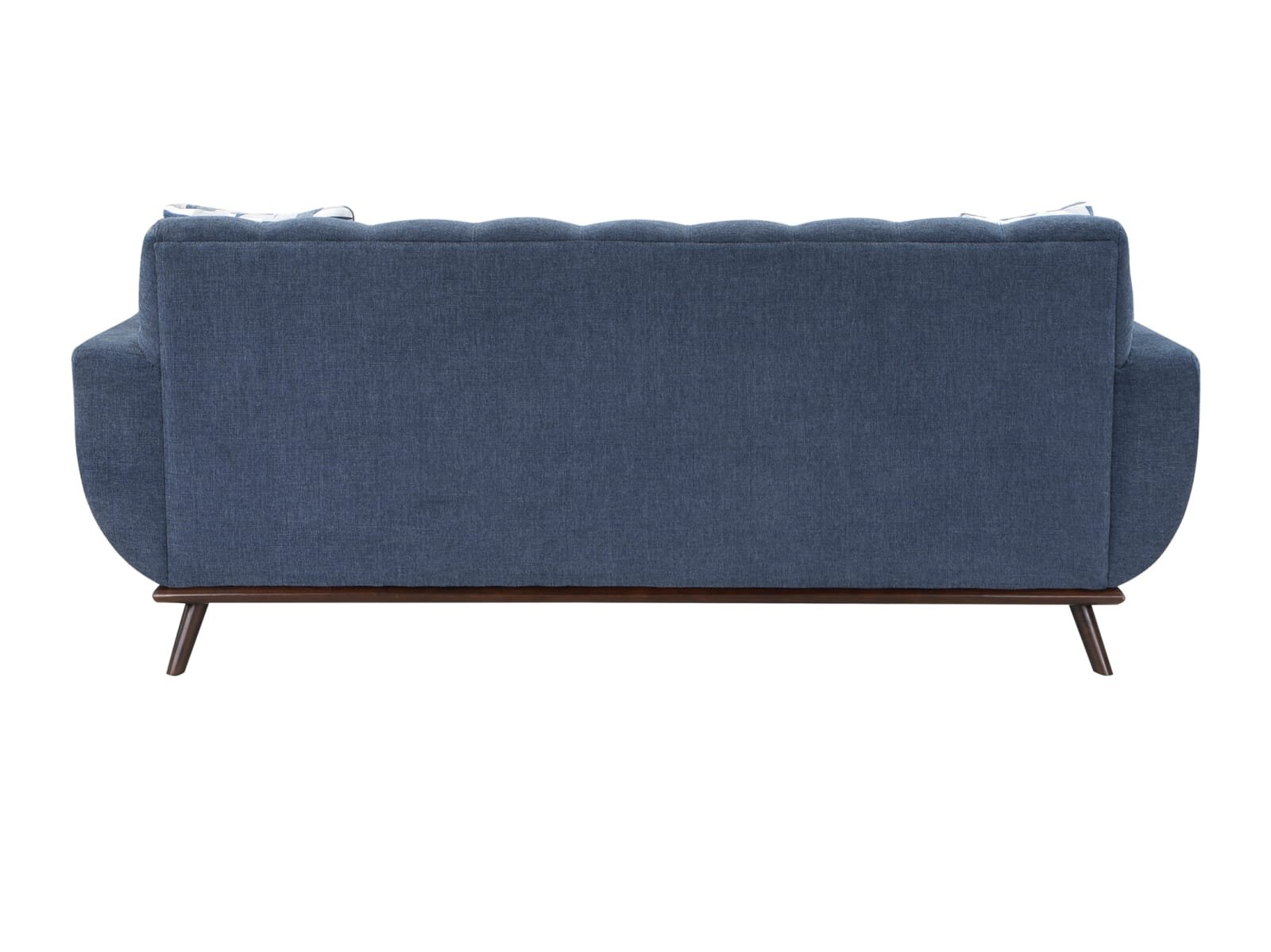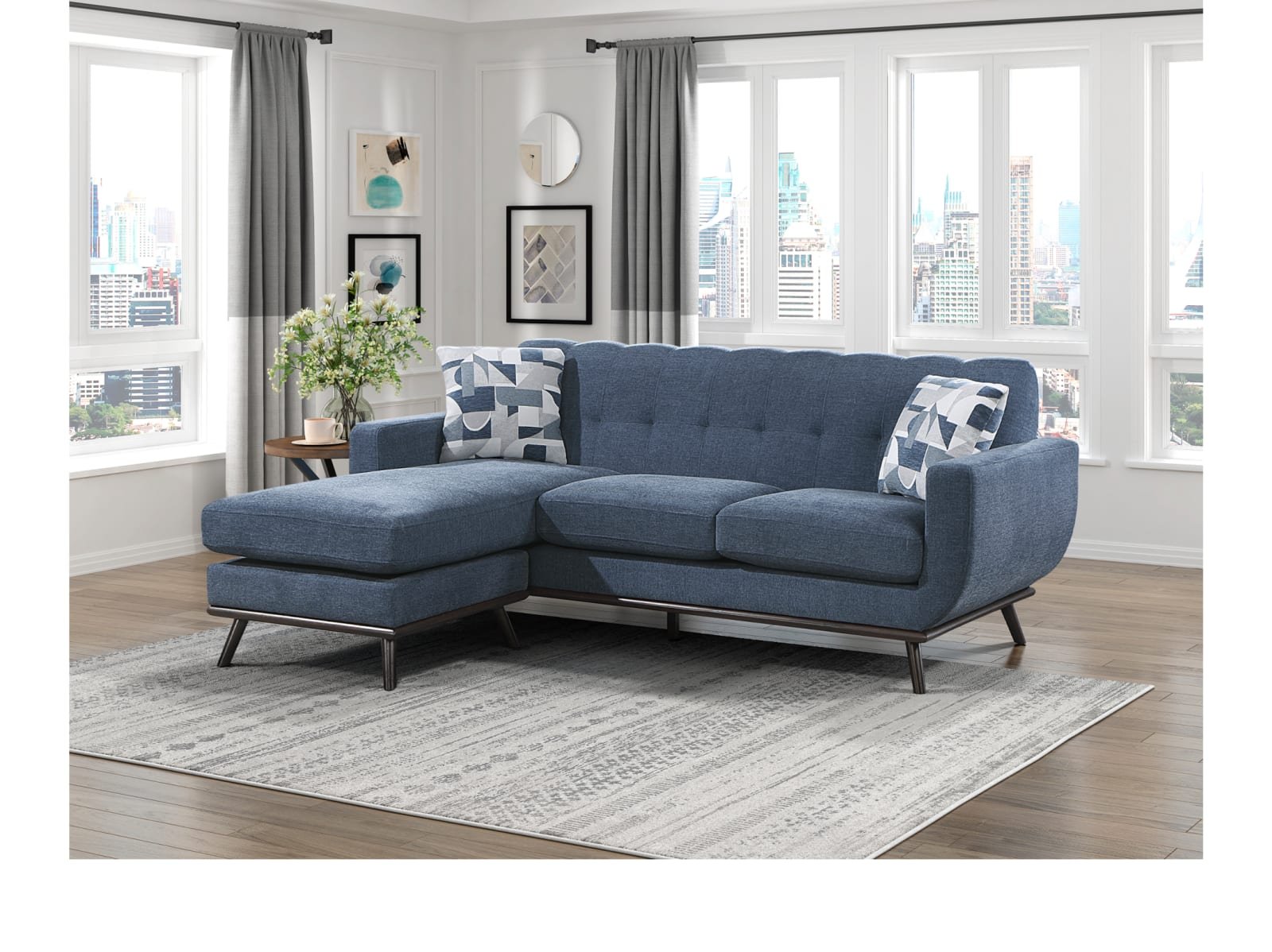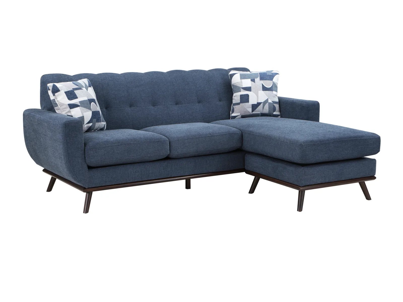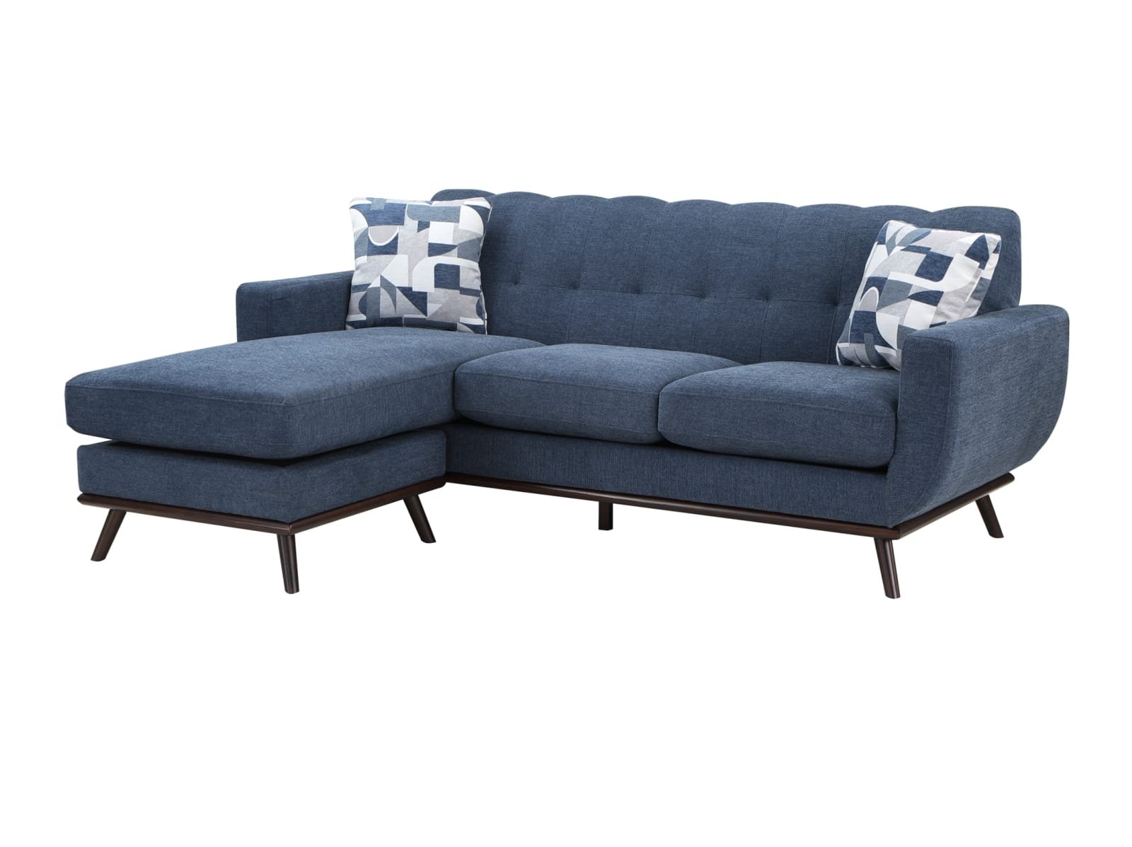 Mid-Century Modern inspired design comprises the timeless look of the Arbor Vitae Collection. The sofa-chaise’s configuration allows for left or right-side placement of the extension ottoman for a perfect fit within your space. Gray or blue chenille covers the modern frame with geometric print toss pillows, walnut-finished wood base rail and legs providing complementing accent to the group. Contour stitching lends scalloped detail to the seatback’s profile, and front, while the prominent framing of the sofa-chaise’s arms solidifies it retro-inspired form. The collection also features reversible seat cushions.