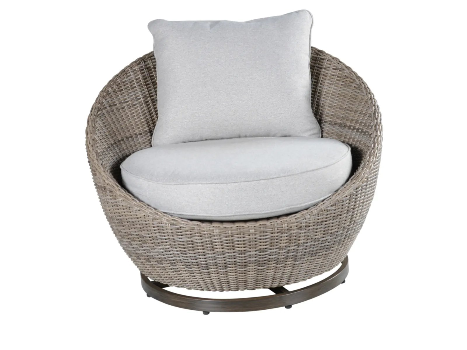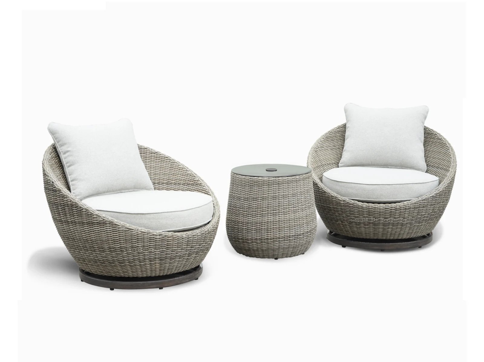 & Free ShippingA cozy setting for two, the Arivava 3-Pack Outdoor set ships complete with two swivel woven chairs and a side table. The umbrella pictured is not included. The egg-shaped chairs swivel 360 degree for a relaxing casual setting on a warm summer night. There’s no need to worry about the weather with construction that features all-weather resin wicker, powder-coated aluminum frame and Solution-Dyed Acrylic covers. Built to resist the elements and provide the comfort and style you want, all in a fully assembled set. Just unbox and enjoy!