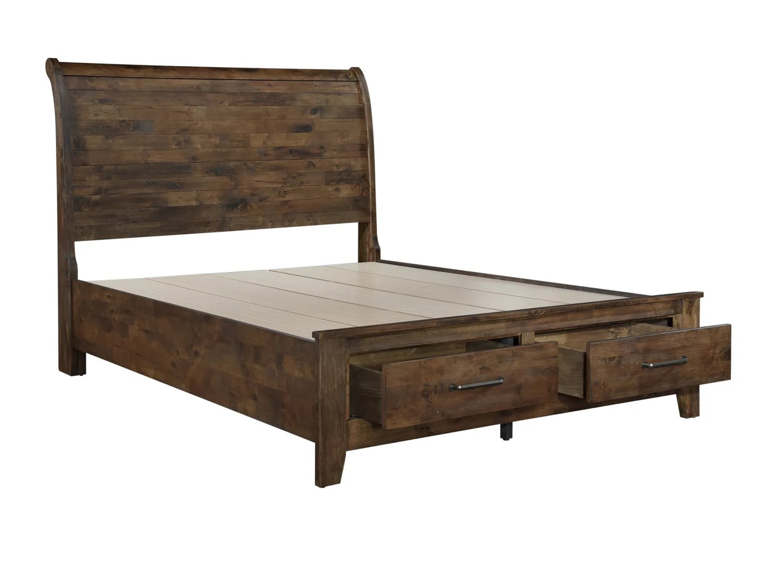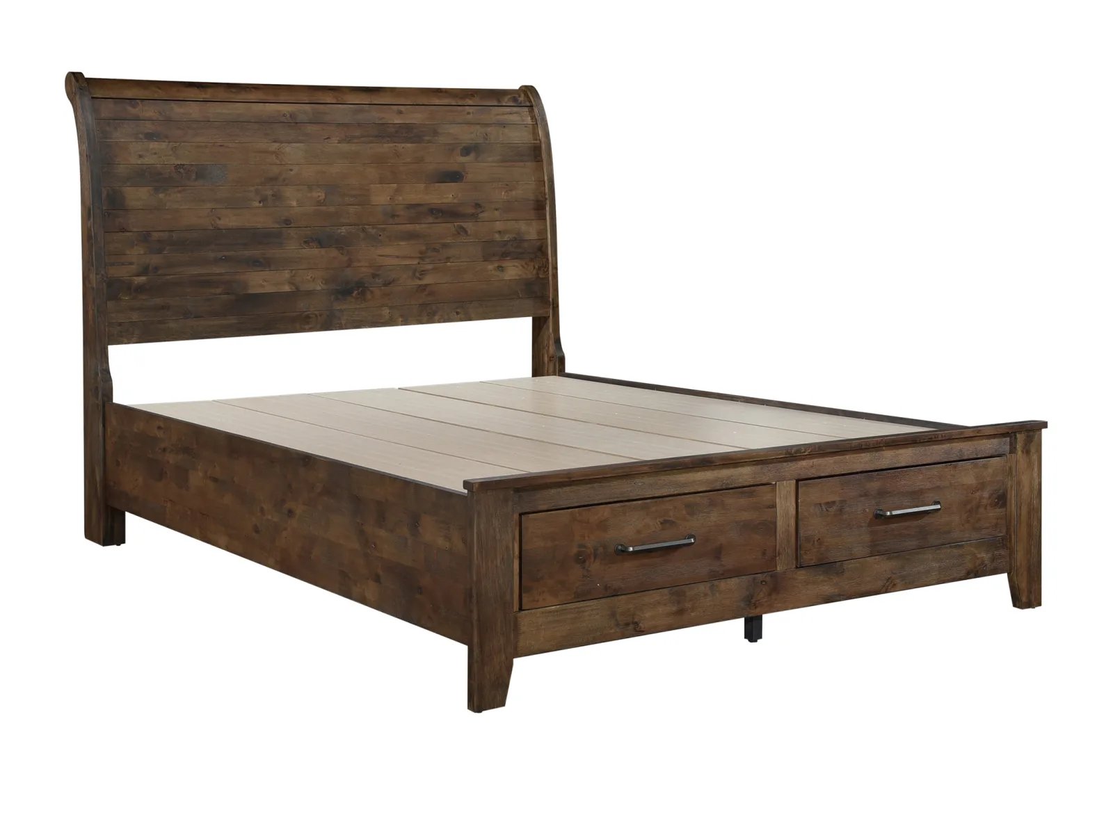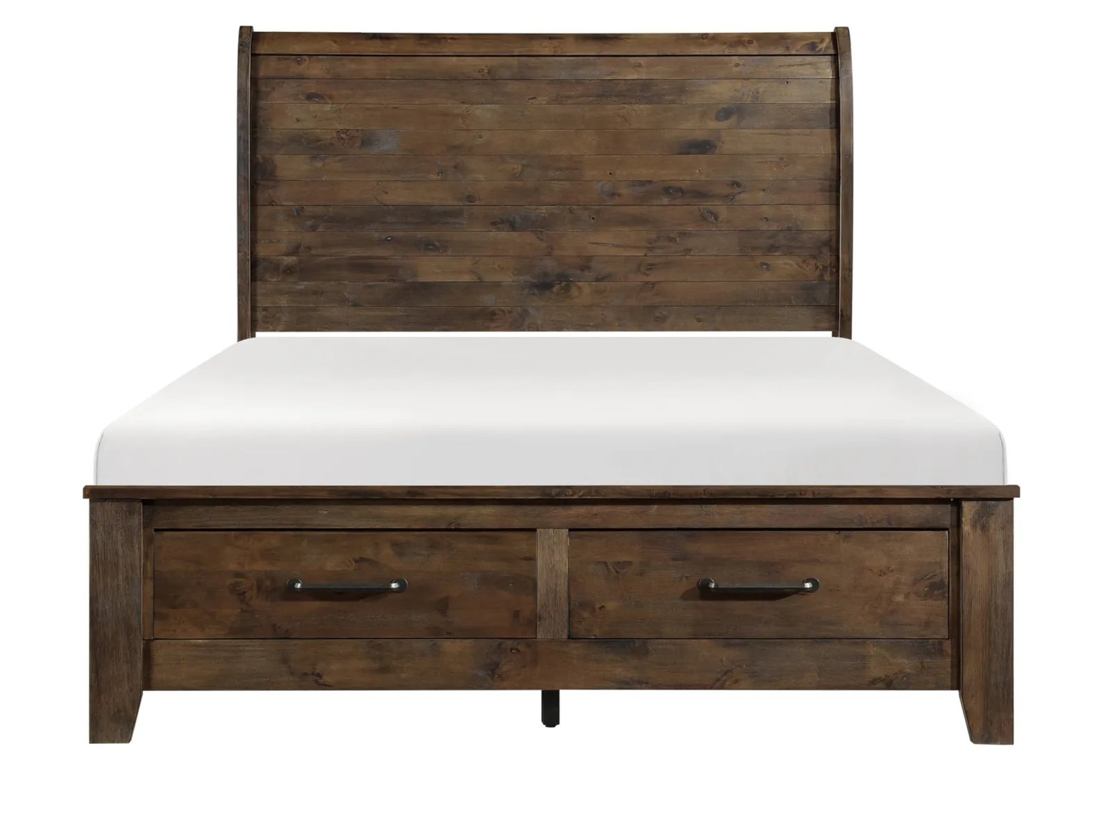 Classic transitional design serves as a base for the natural qualities of the solid wood utilized to create the rustic look of the Ashden Storage Platform Bed. Metal hardware furthers the authentic rustic look of the storage platform bed while a burnished finish serves to highlight the solid wood grain while allowing each plank to serve as a unique accent to the overall design. The functional drawers of the footboard allow for extra storage space within your bedroom. Available in California King, King and Queen sizes