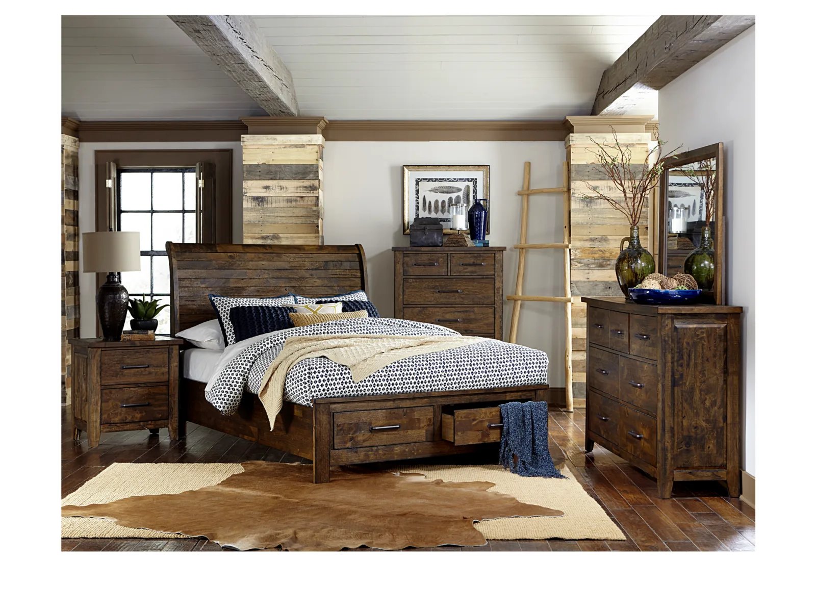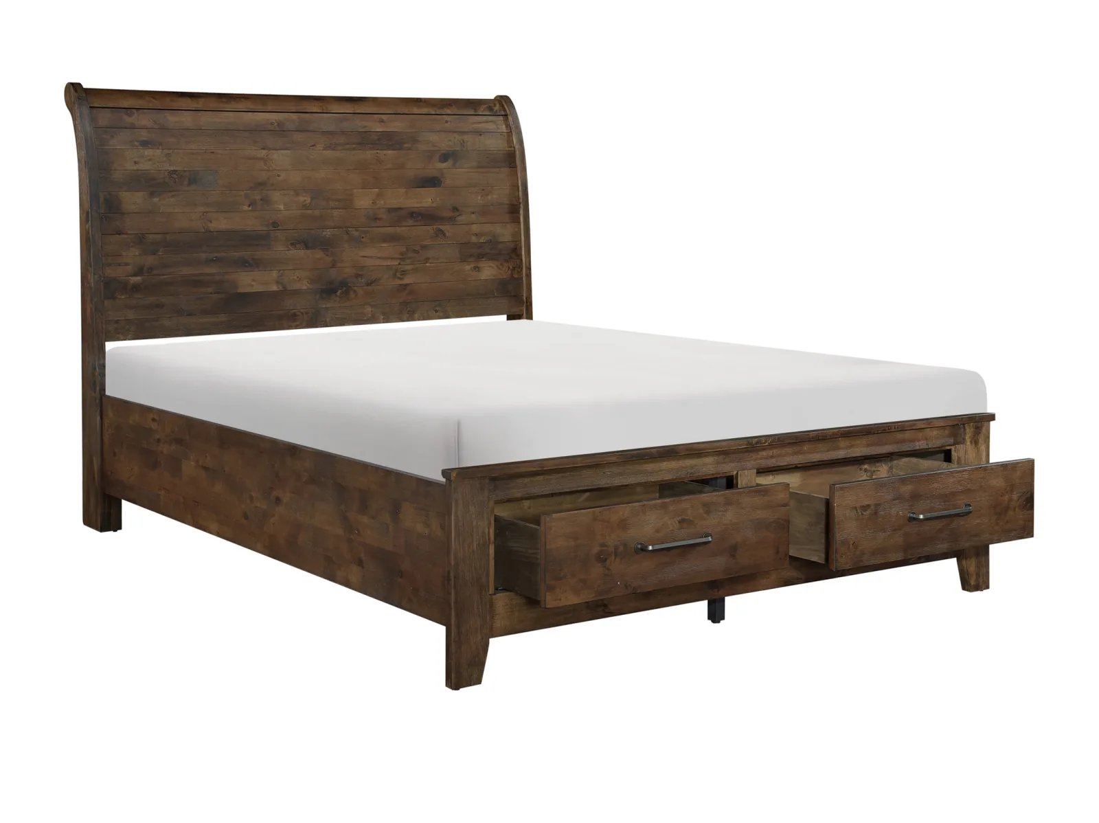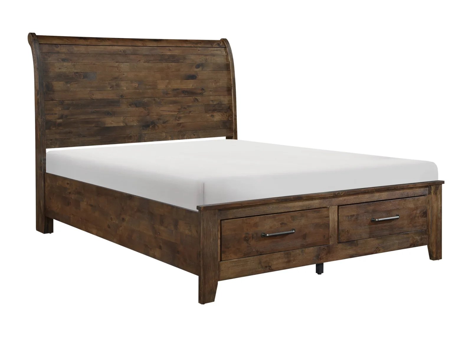 Classic transitional design serves as a base for the natural qualities of the solid wood utilized to create the rustic look of the Ashden Storage Platform Bed. Metal hardware furthers the authentic rustic look of the storage platform bed while a burnished finish serves to highlight the solid wood grain while allowing each plank to serve as a unique accent to the overall design. The functional drawers of the footboard allow for extra storage space within your bedroom. Available in California King, King and Queen sizes