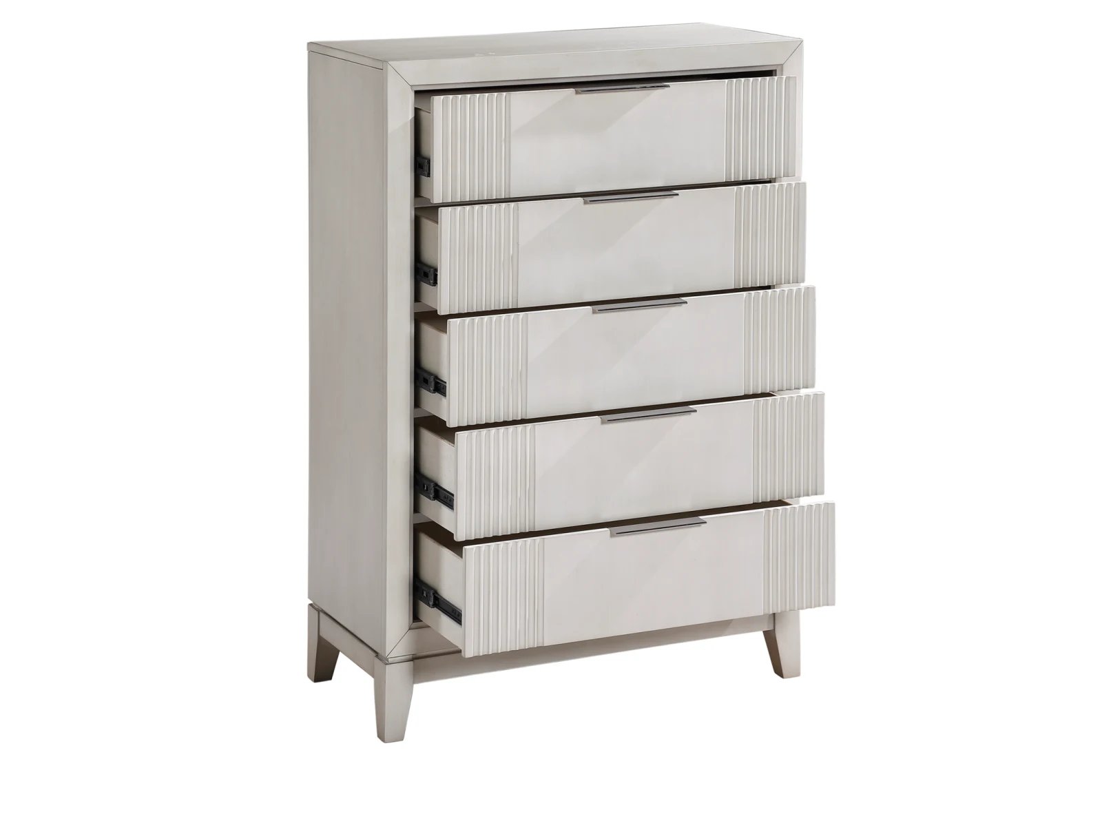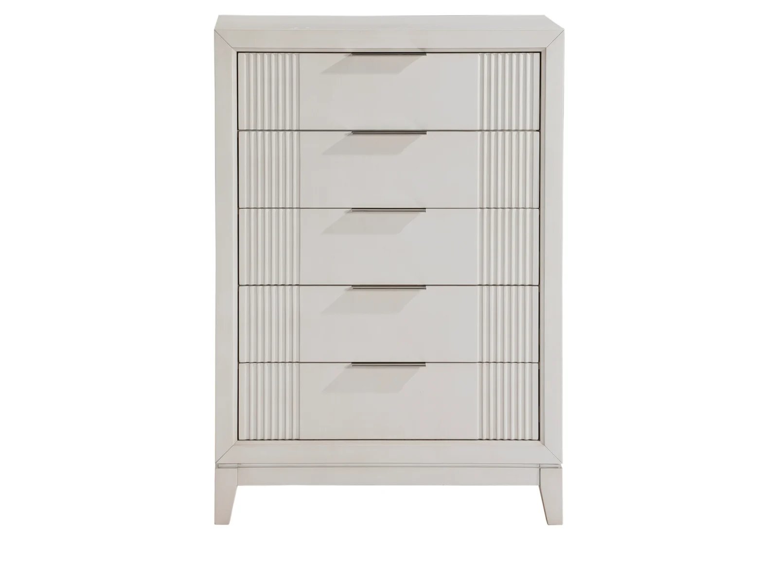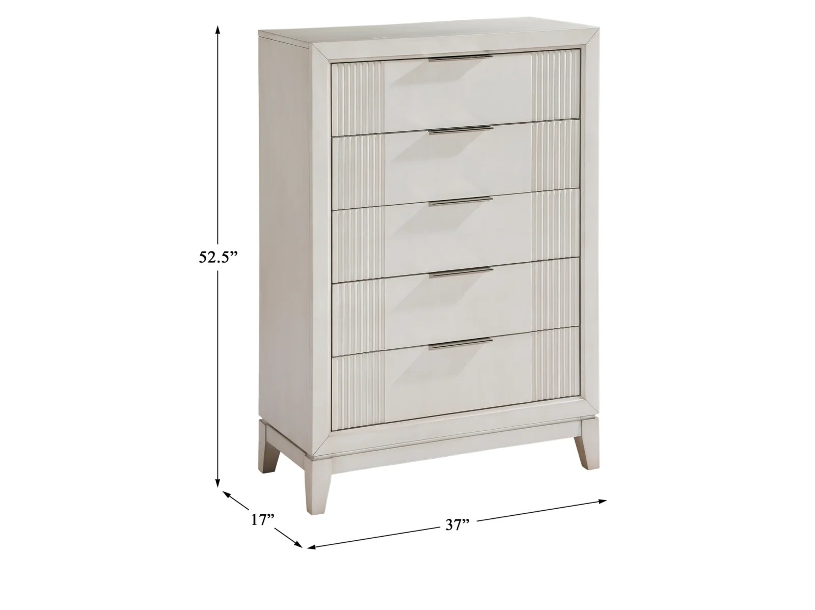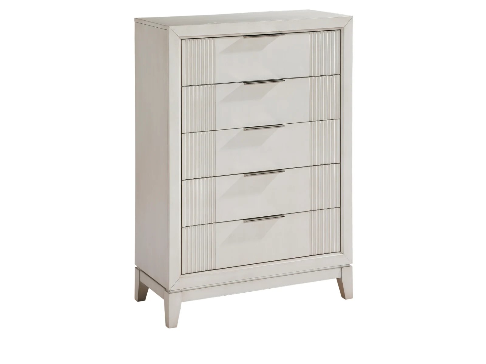 Perfect your bedroom with the Ashforde Chest, where timeless design meets modern functionality. This five-drawer chest features distinctive reeded drawer fronts and polished chrome edge-pull hardware, all finished in a refreshing antique white for a light and airy feel. Its vertical silhouette maximizes storage without sacrificing style, making it an ideal solution for organizing your wardrobe while enhancing your décor. Crafted with meticulous attention to detail, the Ashforde Chest brings a sophisticated touch to any bedroom.