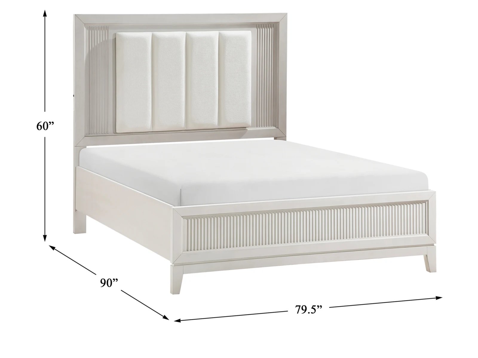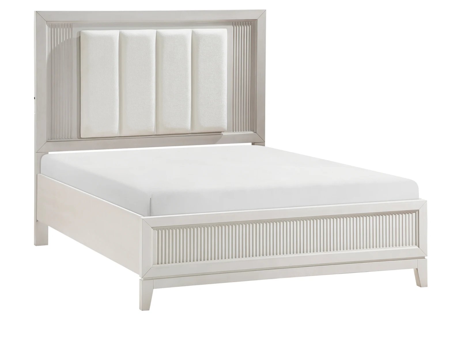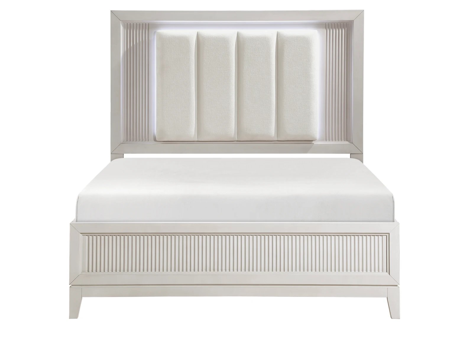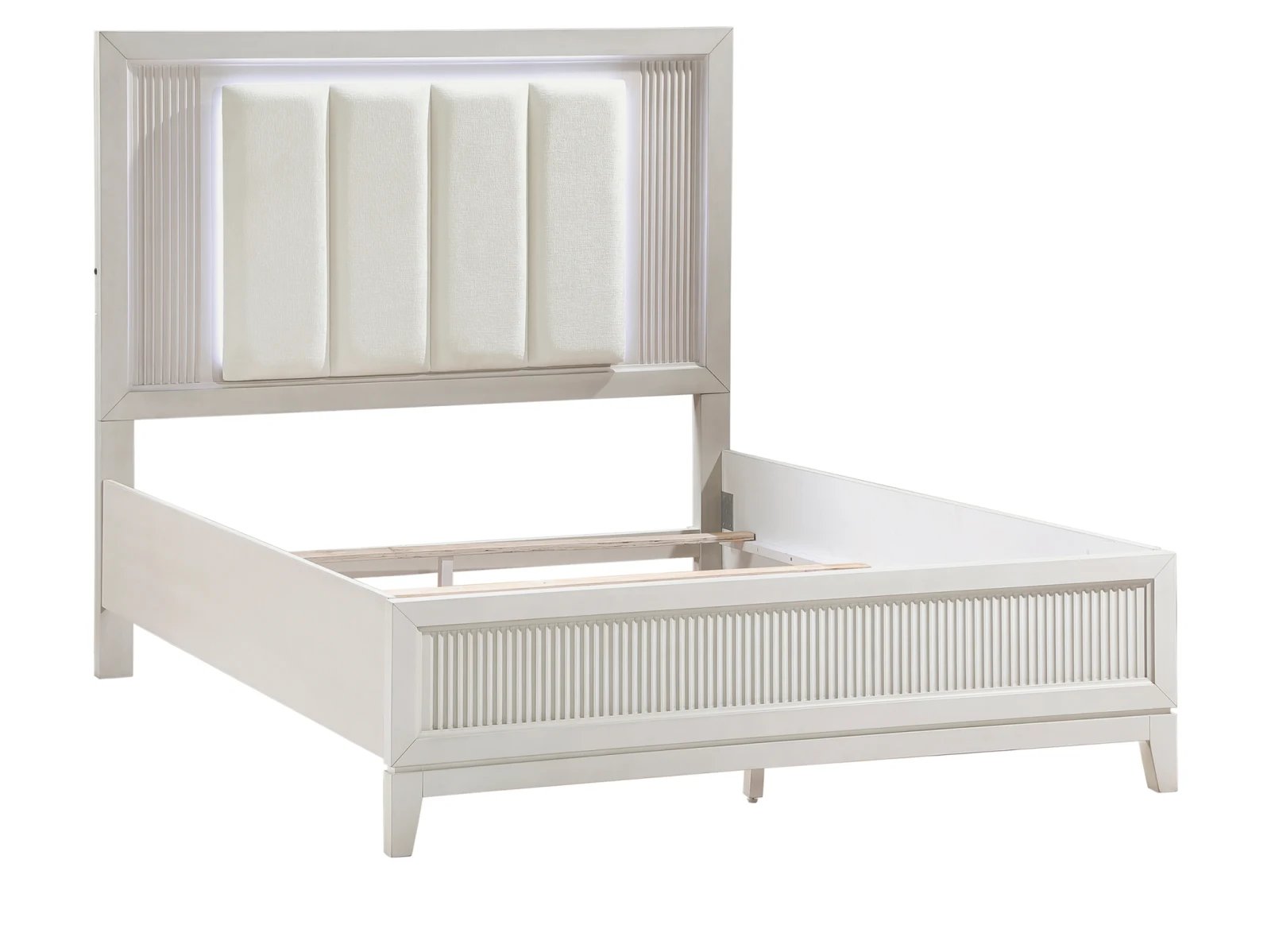 Revitalize your bedroom’s aesthetic with the Ashforde Panel Bed. This mid century-inspired bed features a classic design, highlighted by a refreshing antique white finish. The headboard boasts padded, ivory-colored panels, accented with a soft LED backlight for a relaxing ambiance. The matching footboard continues the reeded detailing, completing the cohesive and visually appealing look. This bed seamlessly blends contemporary style with timeless charm, making it the perfect centerpiece for your bedroom sanctuary.