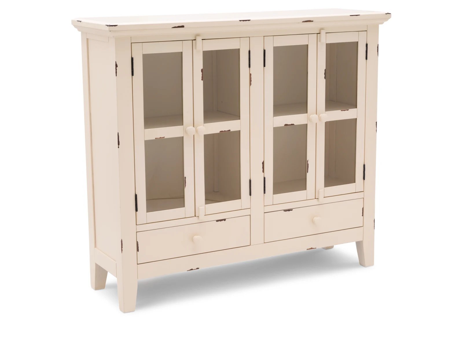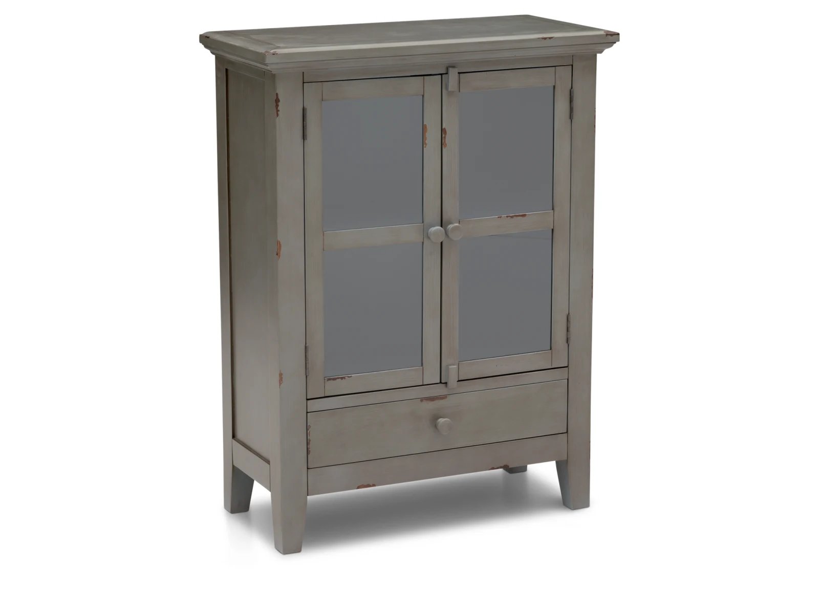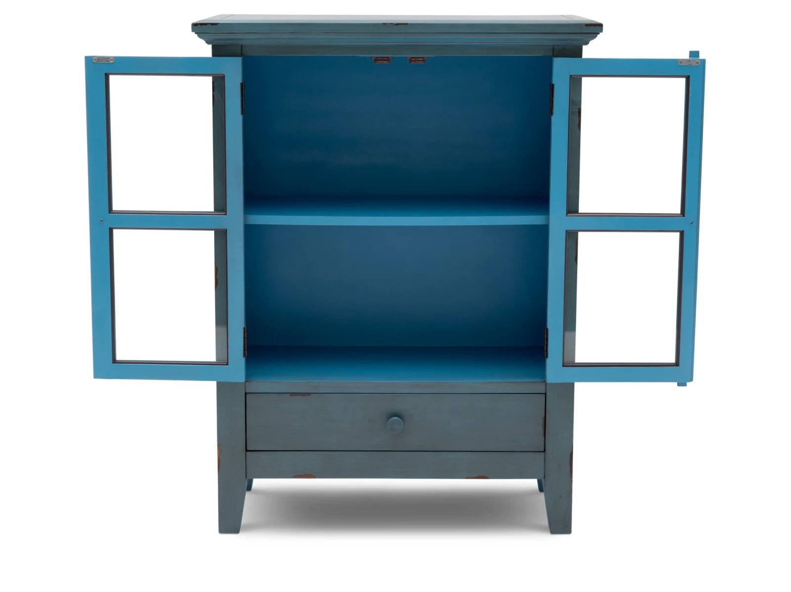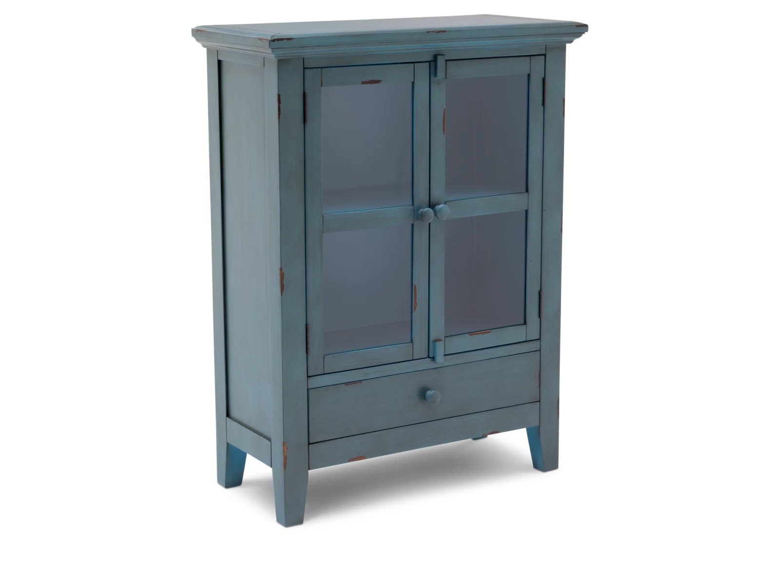 & Free ShippingThe timeless style of the Atwater Cabinet will keep your home looking beautiful and inviting for years to come. Made of solid wood in a distressed paint finish, this rustic, cottage style furnishing boasts two glass-paned cabinet doors that lead to interior shelves and a bottom drawer with full-extension glides. The Atwater is perfect for all types of storage needs and will look charming in your home. This cabinet is available in two sizes with your choice of an antique blue, white, or gray finish.