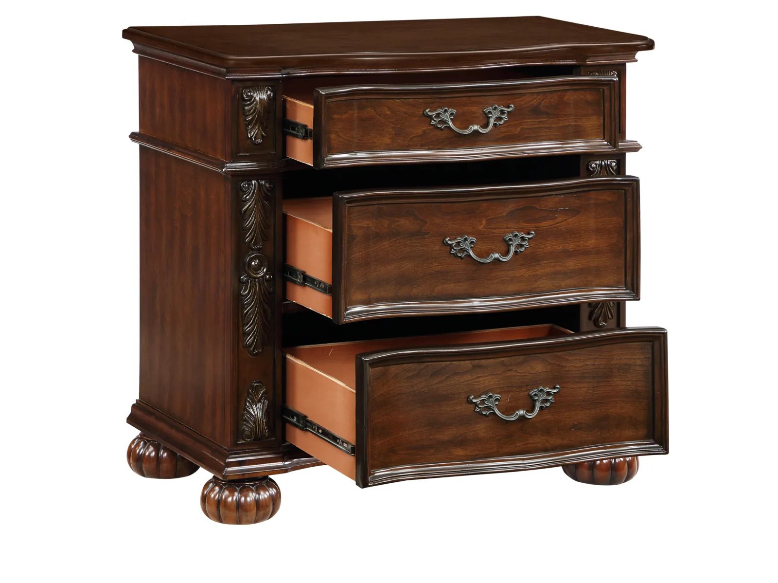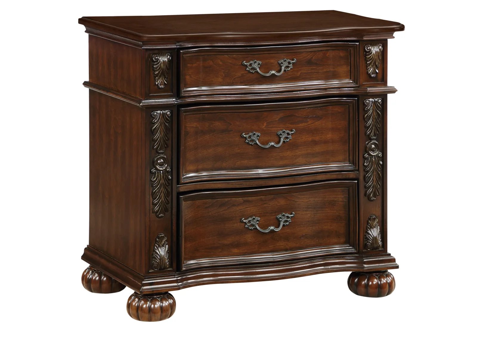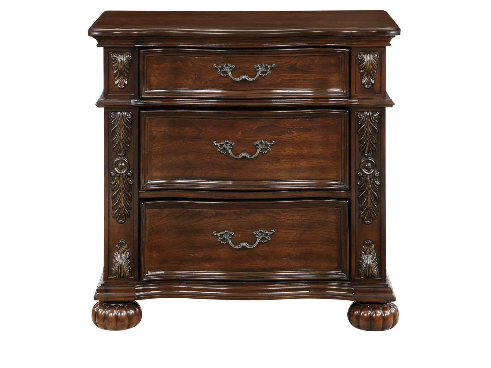 Rich in the aesthetic of Old-World tradition, the design of the Augustus Collection is the culmination of classic accenting that creates an elegant presentation for your bedroom. The serpentine front of the nightstand features framed drawers, fixed-pull traditional hardware, acanthus leaf carvings, as well as bun feet. Furthering the timeless aesthetic that permeates the collection, is the cherry finish over birch veneer and pine solids.