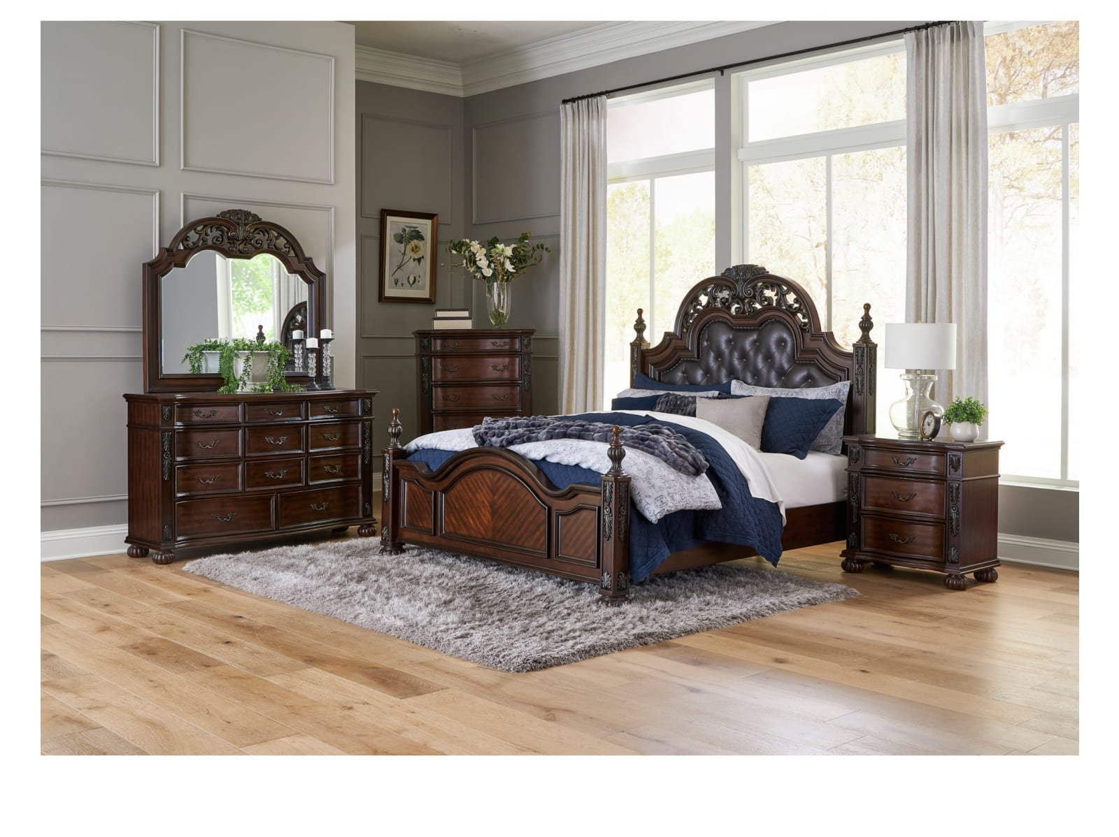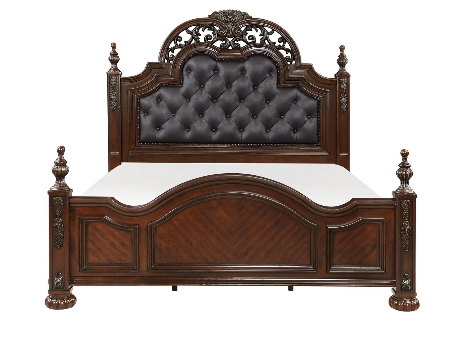 & Free ShippingRich in the aesthetic of Old-World tradition, the design of the Augustus Collection is the culmination of classic accenting that creates an elegant presentation for your bedroom. The intricate scroll detail of the queen bed’s top rail provides eye-catching detail, while the bed’s additional accents display prominently by way of the faux leather padded headboard with button-tufting, framed profile, detailed finials – that top the pilasters of the bed – in addition to the acanthus leaf carvings and bun feet that support. Furthering the timeless aesthetic that permeates the collection, is the cherry finish over birch veneer and pine solids.