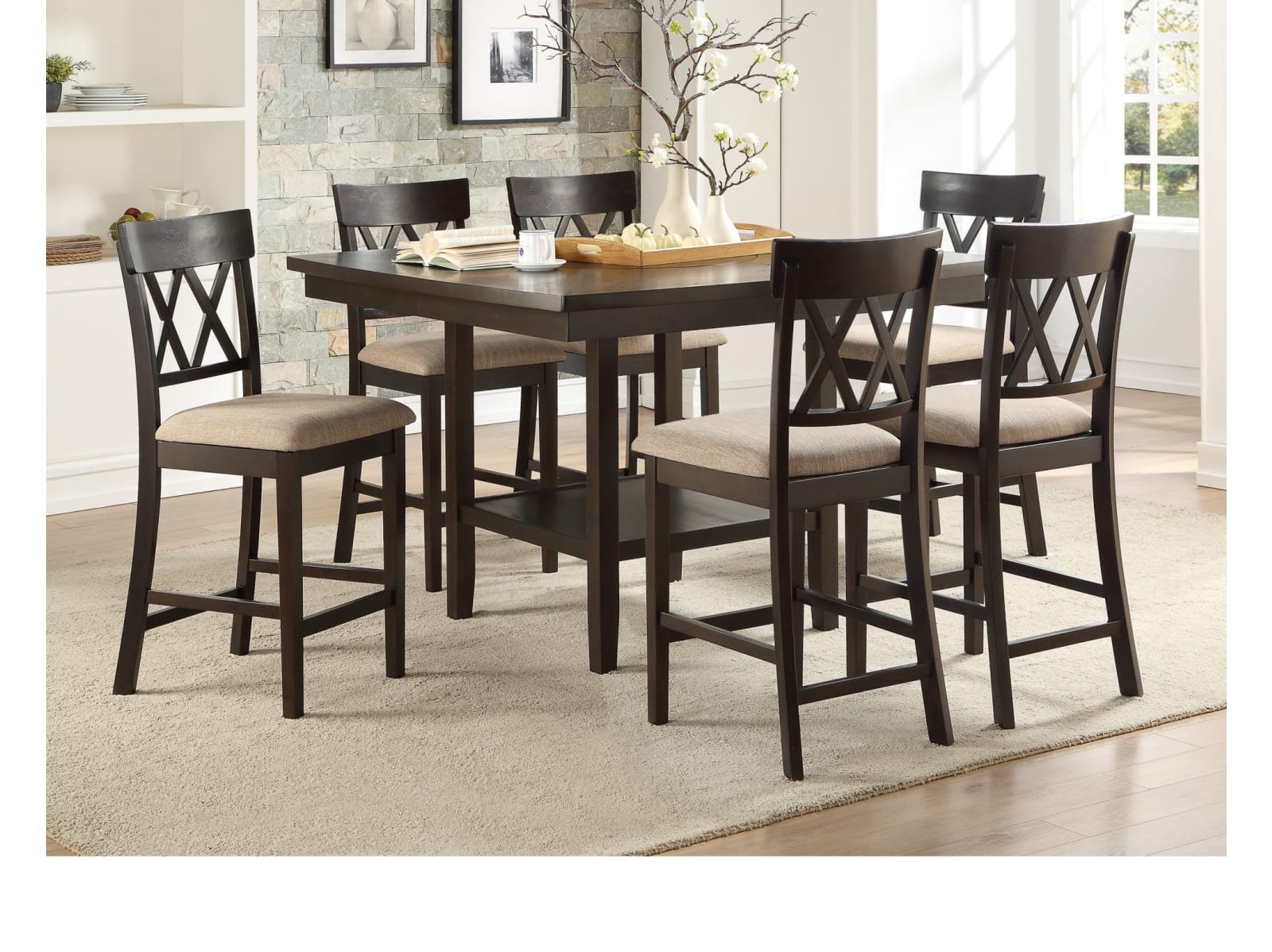 & Free ShippingThe joy of a shared meal creates bonds that last a lifetime and the addition of the Autumn Counter Height 5 Pc. Dining Set will provide you, your family, and your friends a platform from which to enjoy those mealtime experiences. Central to the table’s top is the functional lazy-susan – spinning to provide easy access to each element of your feast. The mindy veneer is finished in dark espresso lending depth to the wood’s grain. The four barstools showcase a unique double X-back design, gracefully curved back legs, and they feature textured beige seat covers for chic neutral accent.