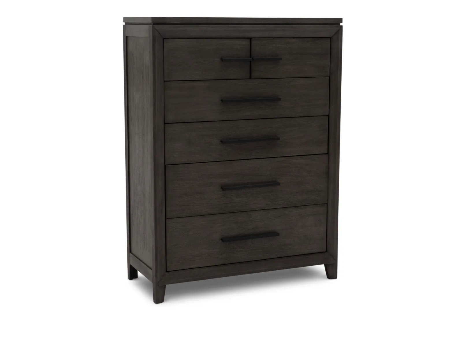 With rustic elements and a clean-lined design, the Avon 5 Drawer Chest makes an impressive addition to any bedroom. Crafted from acacia solids and veneers, the Avon showcases an uncommon wire-brushed gray finish. The five generous drawers, including the felt-lined top drawer, boast English dovetail construction and their metal pull handles display a gunmetal finish for a touch of industrail contrast. The drawers are framed by thick-cut canted trim molding which extends from the top to Avon’s simple block feet. Add the captivating Avon 5 Drawer Chest to your collection today.