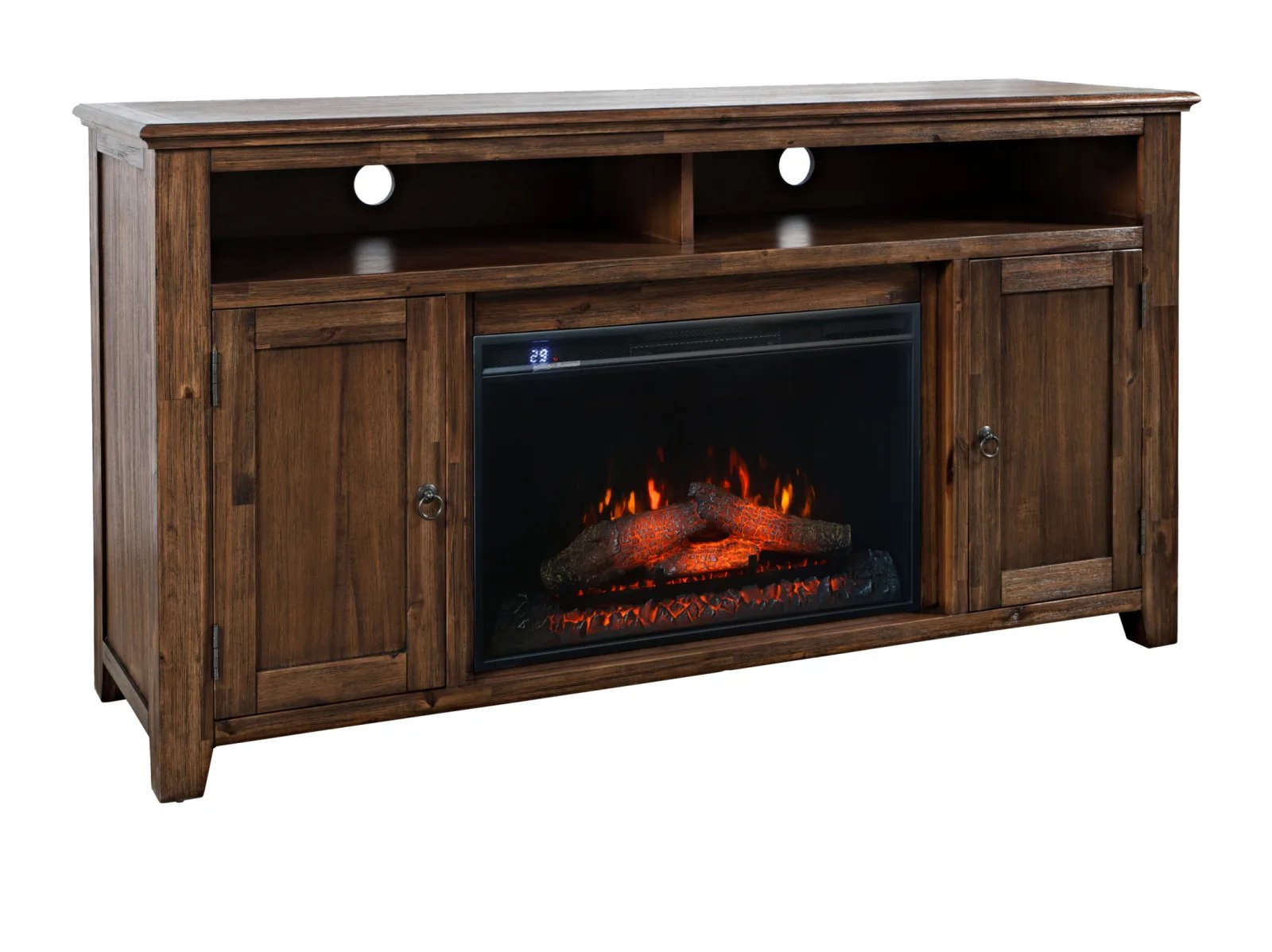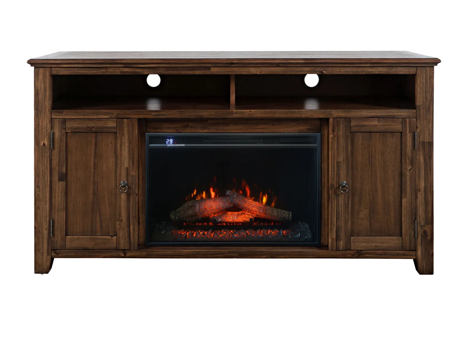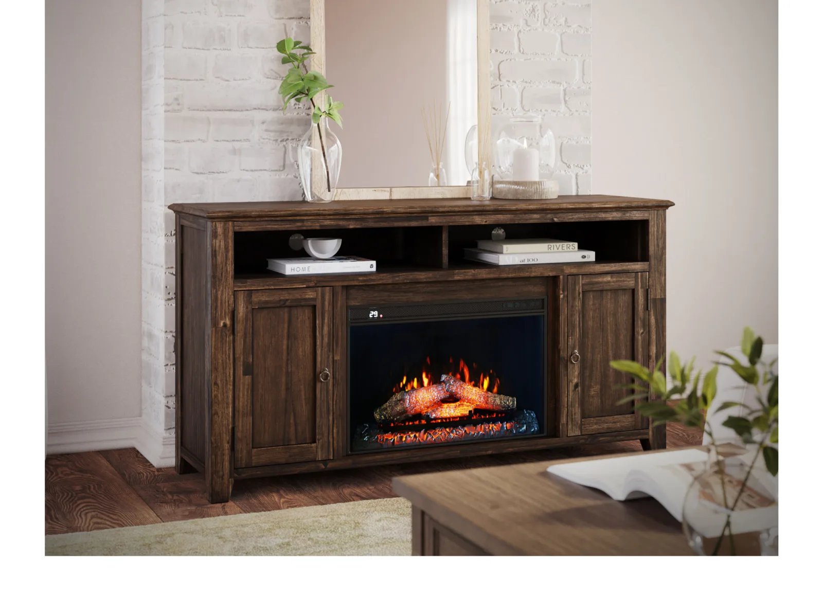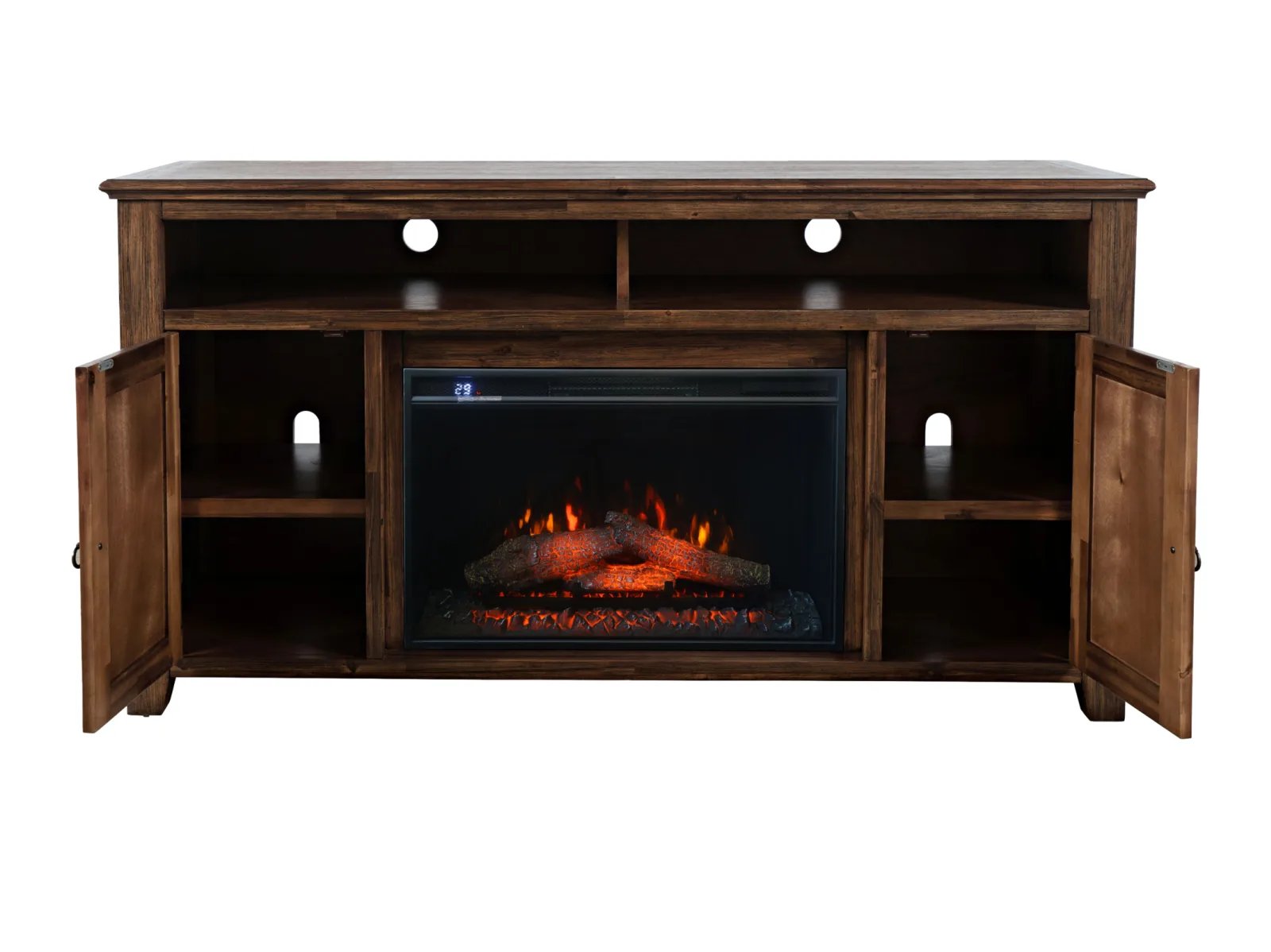 & Free ShippingBring warmth and organization to your living space with the Baker Mills 60″ Electric Fireplace TV Stand. This sprawling rustic console table is constructed from acacia solids, boasting a durable woody profile that’s appealing and versatile. The centerpiece is an energy-efficient LED electric fireplace that creates a cozy ambiance without the need for heat. Two spacious storage compartments behind doors provide ample room for media essentials on either side of the fireplace, while a built-in soundbar shelf enhances your entertainment setup. Featuring a weathered finish that exudes timeless charm, this piece is complete with handy cable management cutouts to keep cords tidy and out of sight. Perfect for relaxing evenings or hosting guests, the Baker Mills 60” Electric Fireplace TV Stand combines style, practicality, and comfort.