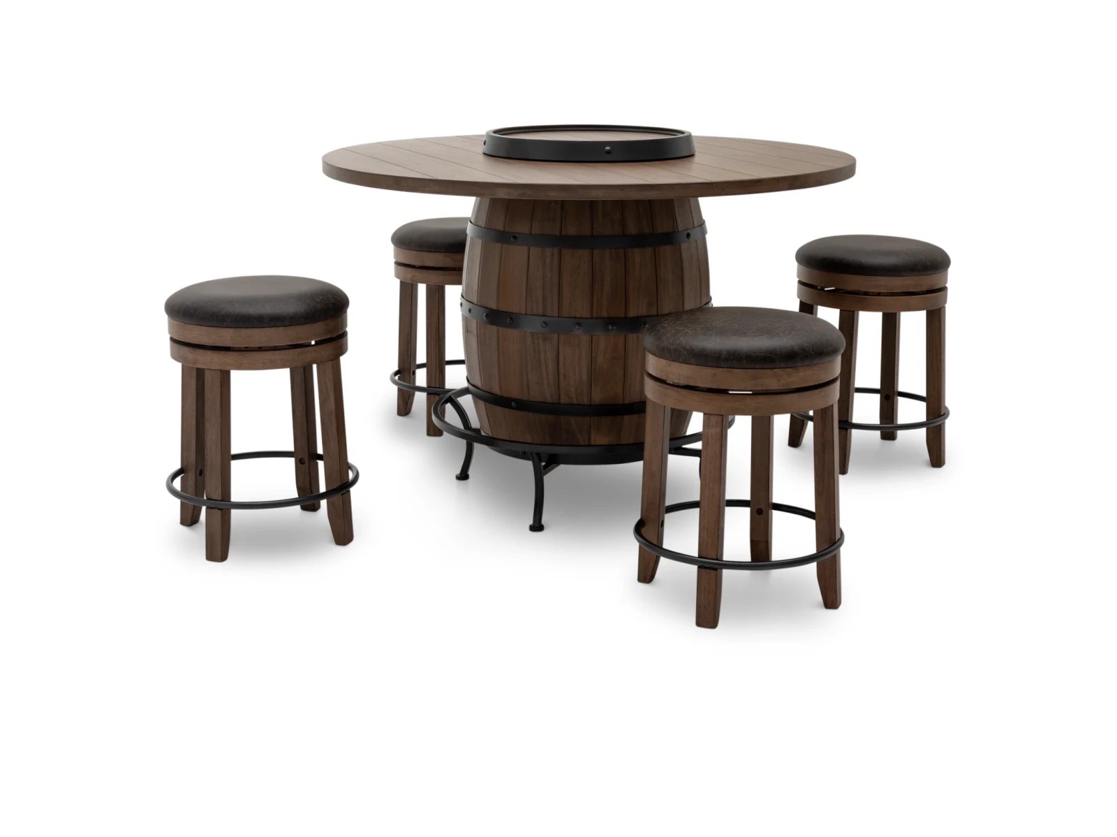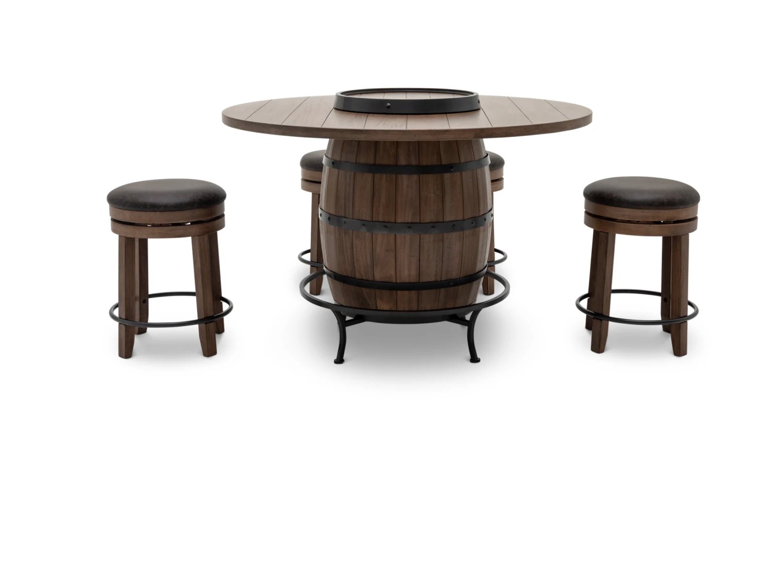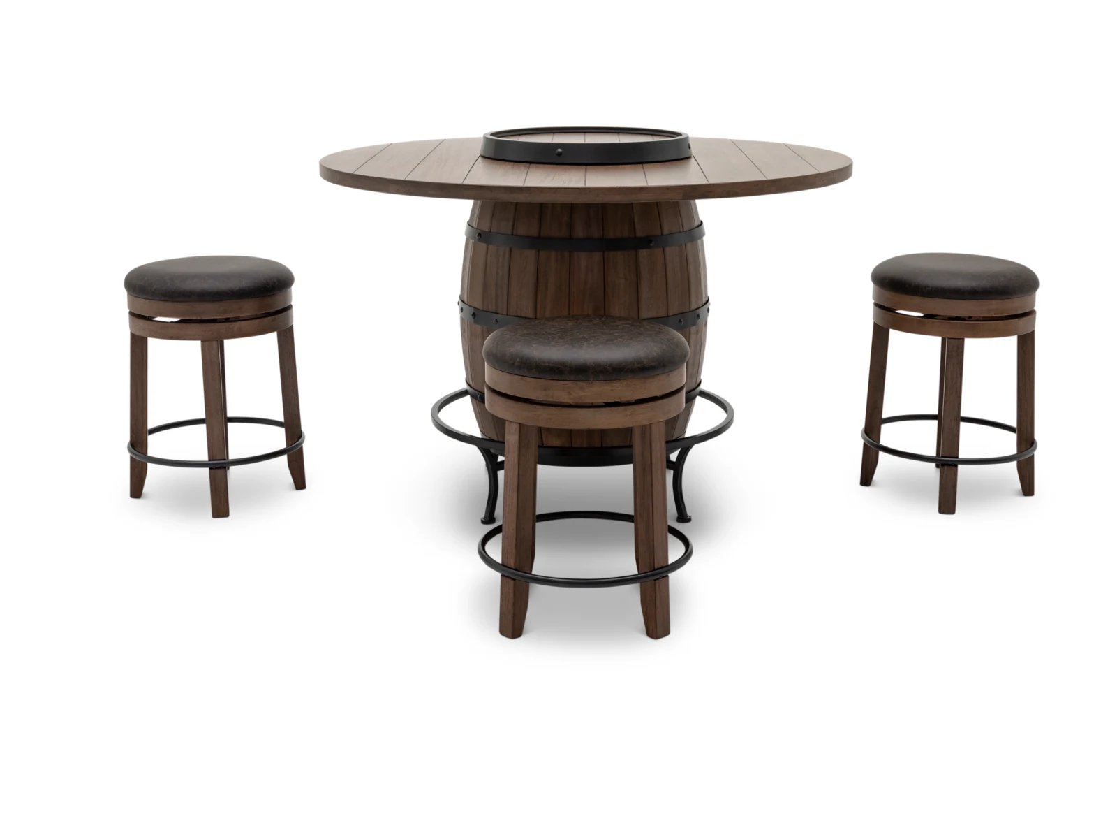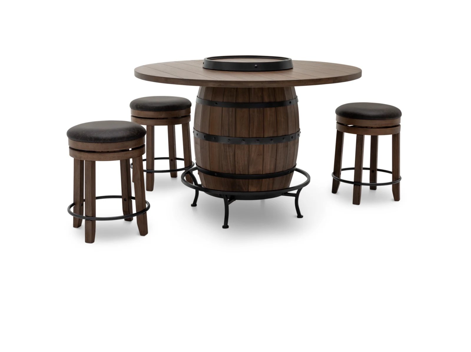 & Free ShippingThe Baker Street Backless Counter Height Dining Set is a fun 5 Pc. Set with plenty of rustic-industrial charm. Crafted from solid mahogany and mindi veneers, this set consists of a round pub table with a unique barrel-shaped base and swivel barstools, and each piece showcases a warm Buckskin finish with rough-sawn distressing to instill an organic, timeworn palette. The dining table’s unique barrel-shaped base rests atop a circular black metal base and showcases metal bands for a touch of authenticity, and its round table top is outfitted with a lazy susan which can be removed to reveal a convenient hidden storage compartment. The four Baker Street Backless Swivel Bar Stools showcase complementary black metal accents, and each one boasts a comfy swivel seat upholstered with a rich brown fabric to complete the look.
