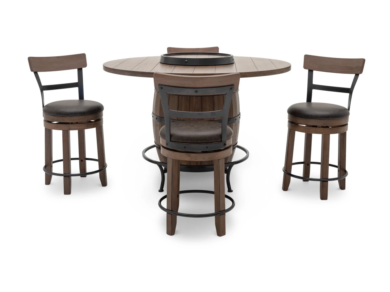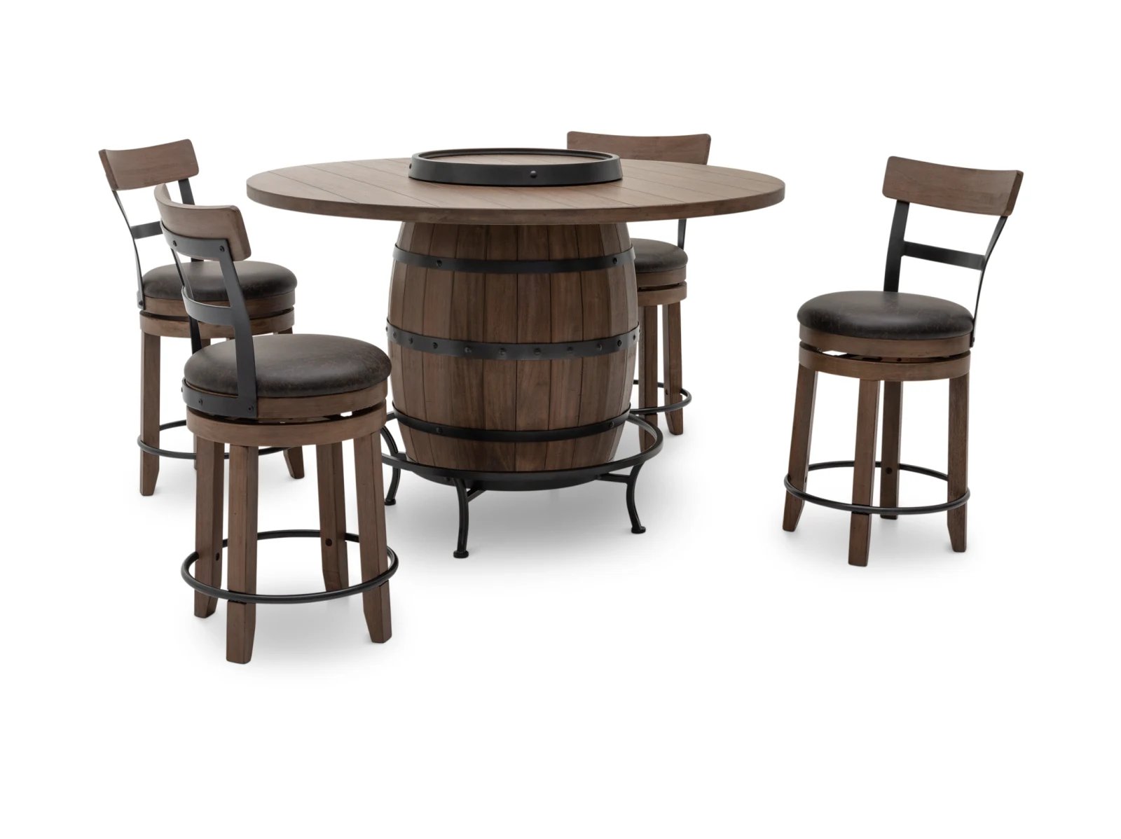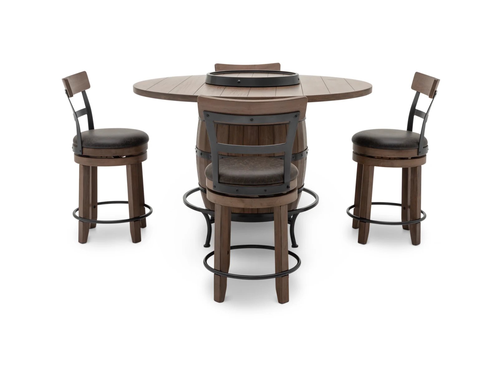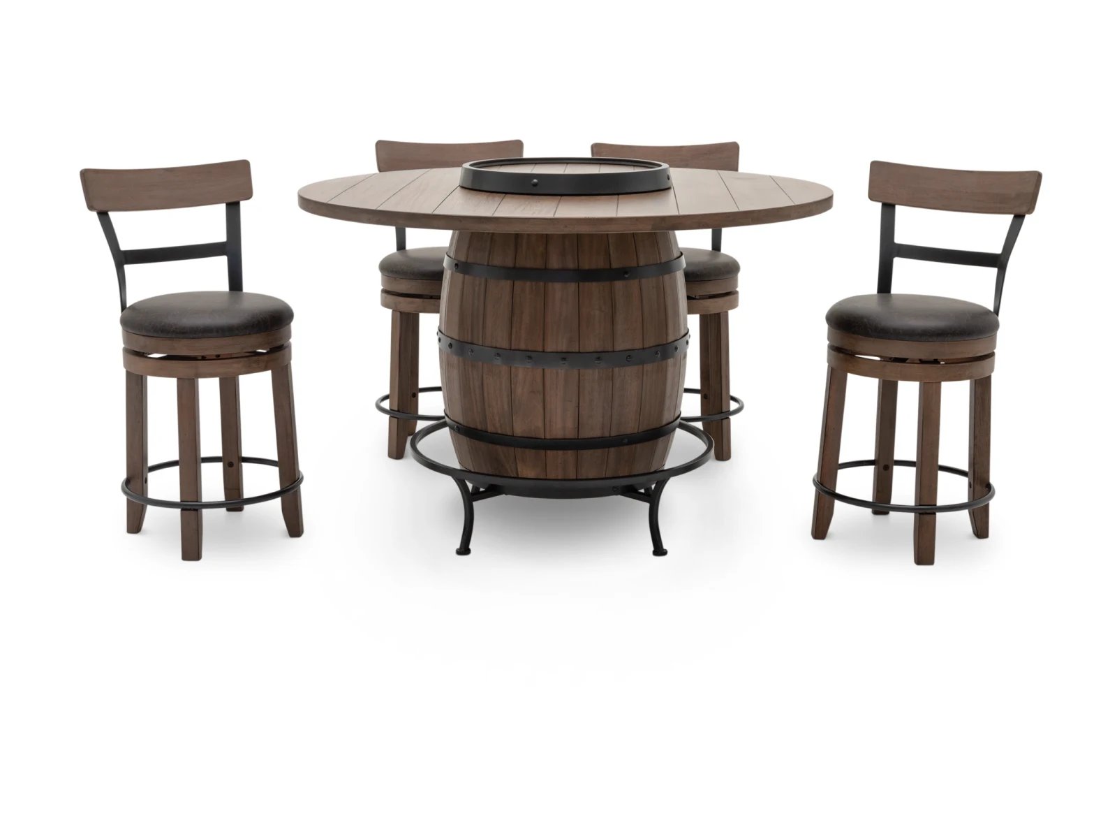 & Free ShippingCreate a dining space full of rustic and industrial appeal with the Baker Street 5 Pc. Counter Height Dining Set. Crafted from solid mahogany and mindi veneers, this charming set consists of a round pub table with a unique barrel-shaped base and swivel barstools, and each piece showcases a warm Buckskin finish with rough-sawn distressing to instill an organic, timeworn palette. The dining table’s eye-catching base rests atop a circular black metal base and showcases metal bands for a touch of authenticity, and its top is outfitted with a convenient lazy susan which can be removed to reveal a hidden storage compartment. The Baker Street Swivel Barstools feature padded swivel seats wrapped in a brown leather-like fabric, and they each feature black metal backrests and footrests to complete the look.