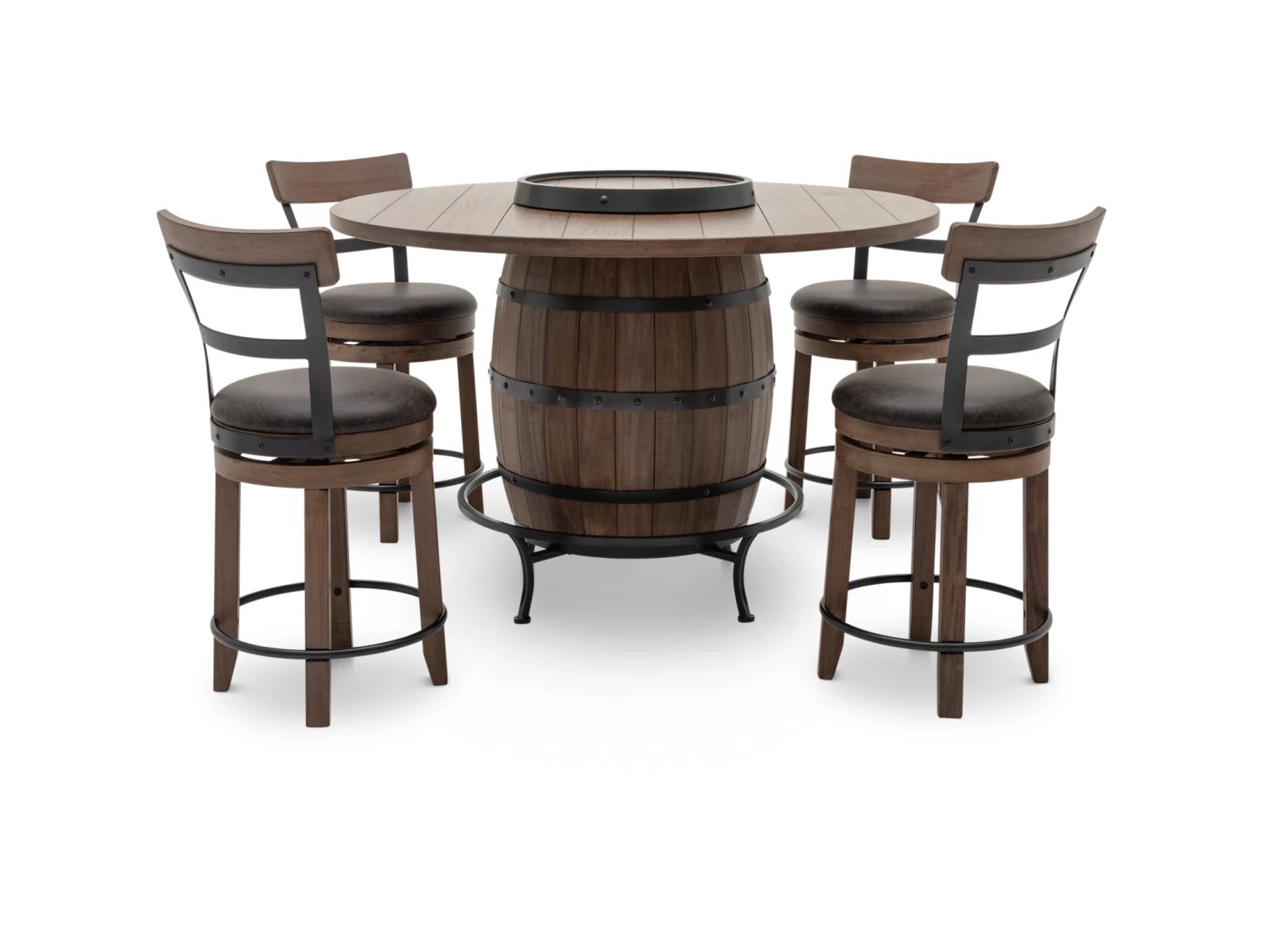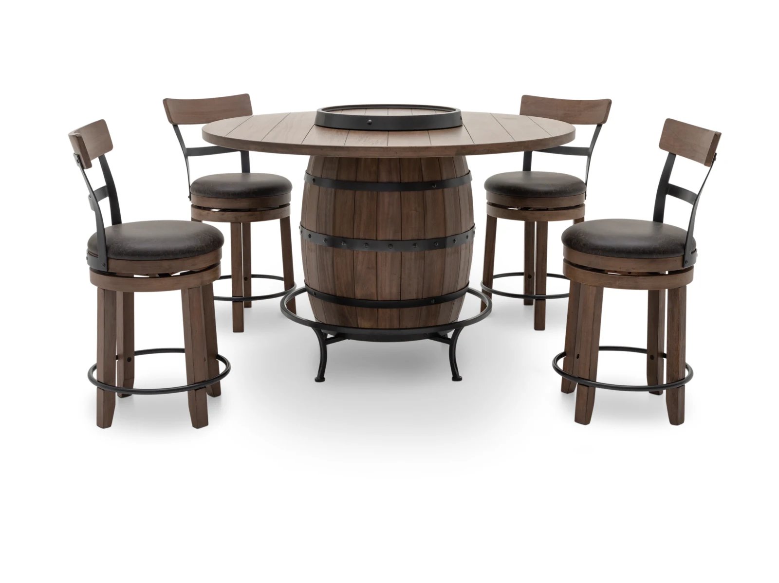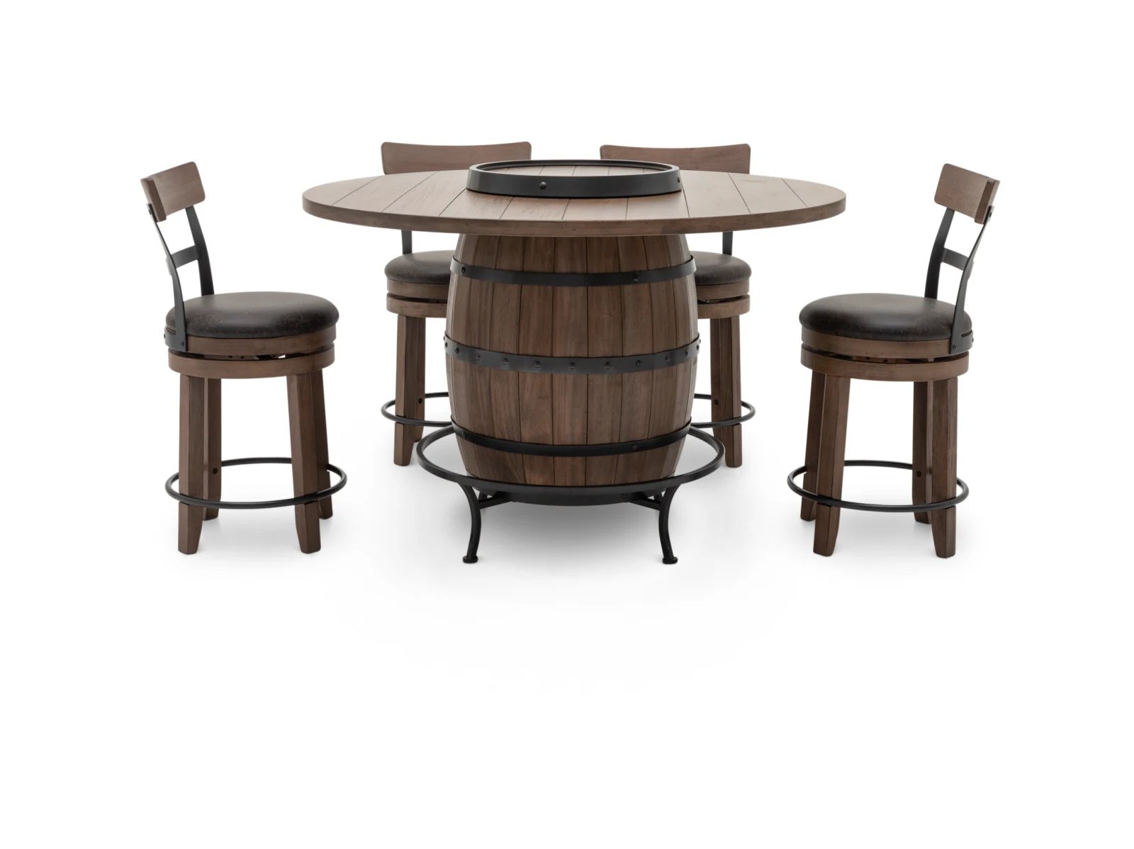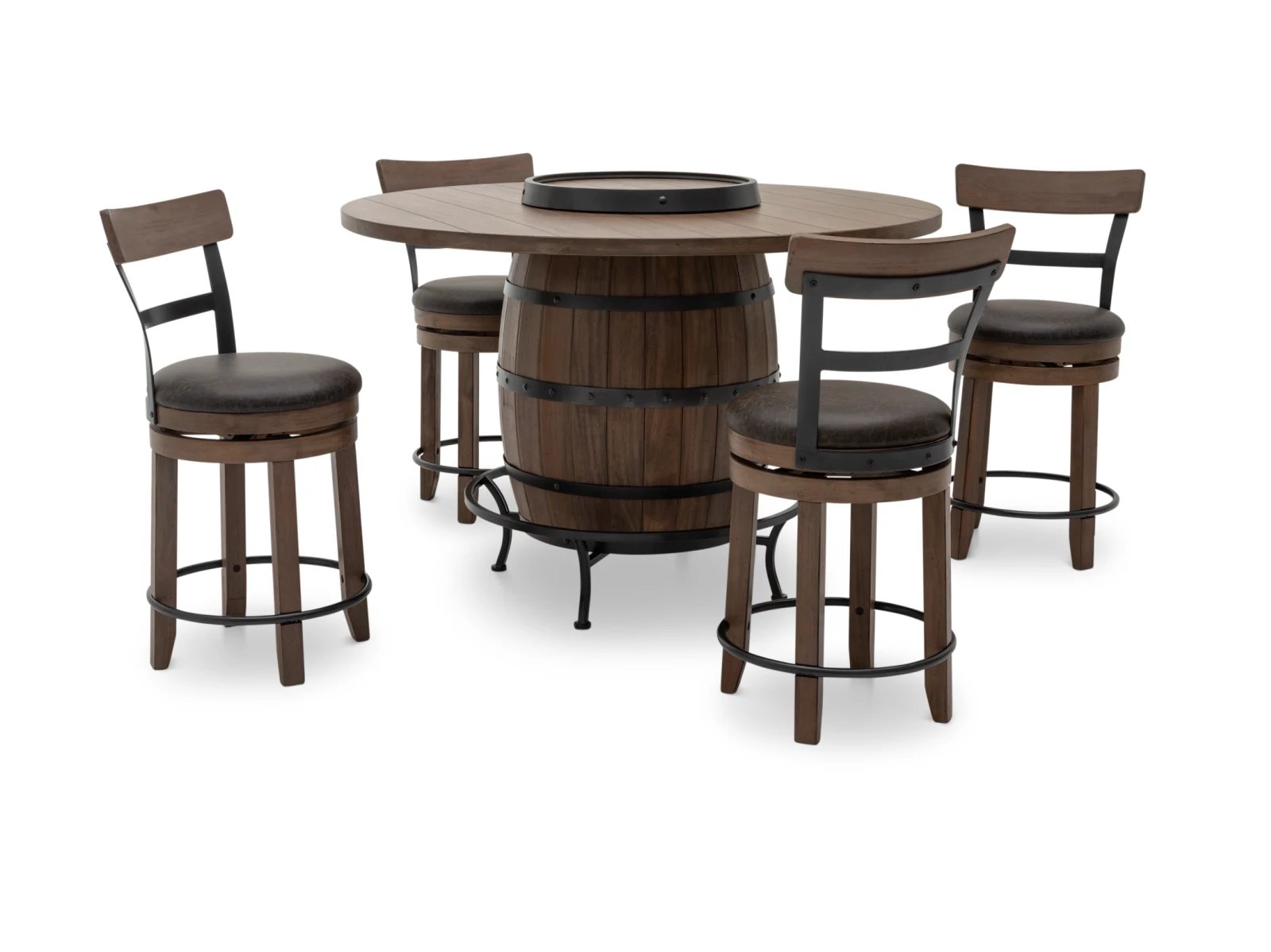& Free ShippingCreate a dining space full of rustic and industrial appeal with the Baker Street 5 Pc. Counter Height Dining Set. Crafted from solid mahogany and mindi veneers, this charming set consists of a round pub table with a unique barrel-shaped base and swivel barstools, and each piece showcases a warm Buckskin finish with rough-sawn distressing to instill an organic, timeworn palette. The dining table’s eye-catching base rests atop a circular black metal base and showcases metal bands for a touch of authenticity, and its top is outfitted with a convenient lazy susan which can be removed to reveal a hidden storage compartment. The Baker Street Swivel Barstools feature padded swivel seats wrapped in a brown leather-like fabric, and they each feature black metal backrests and footrests to complete the look.