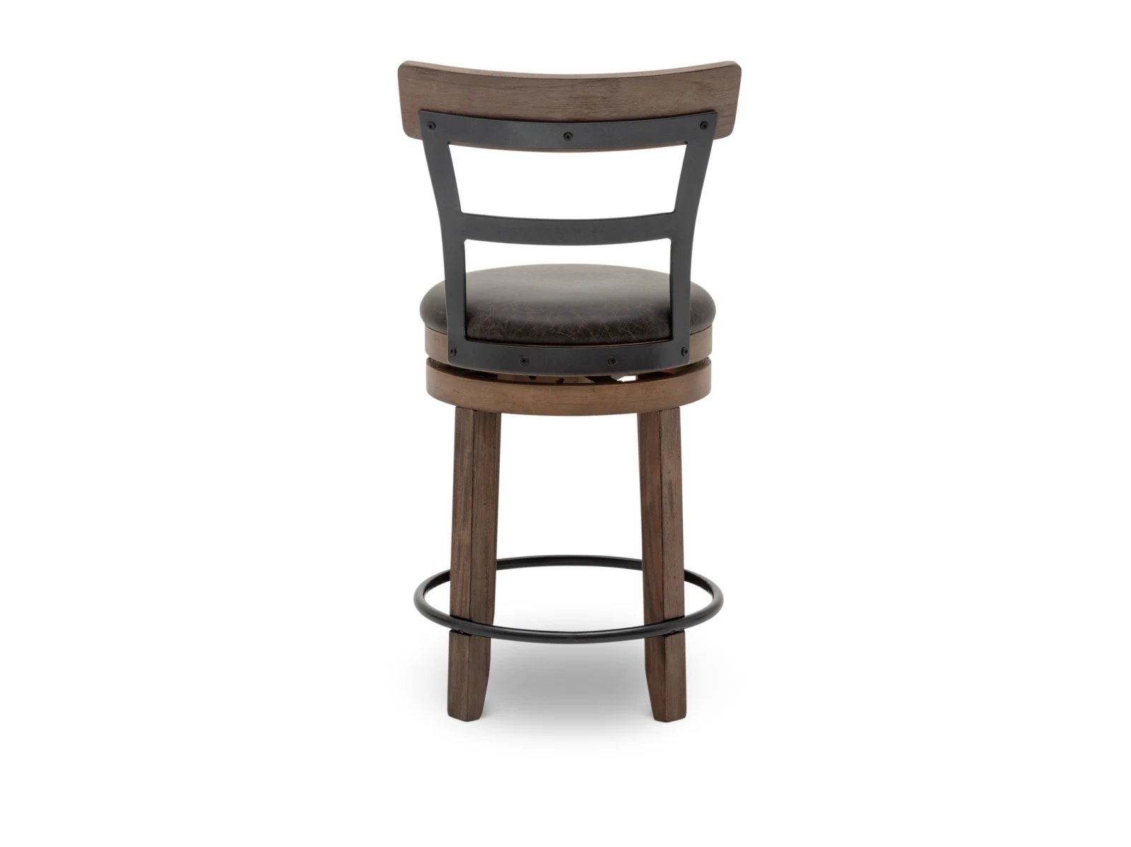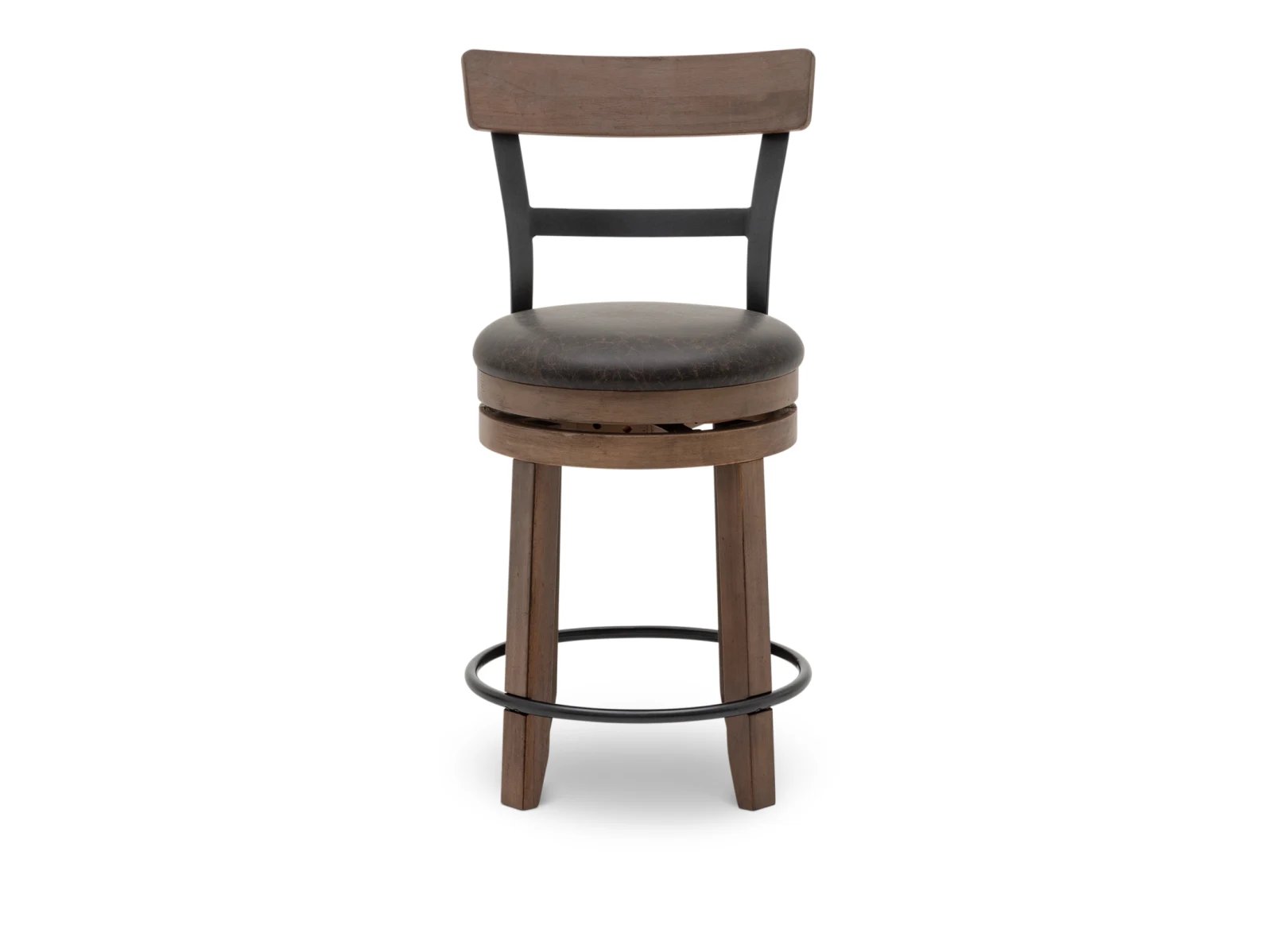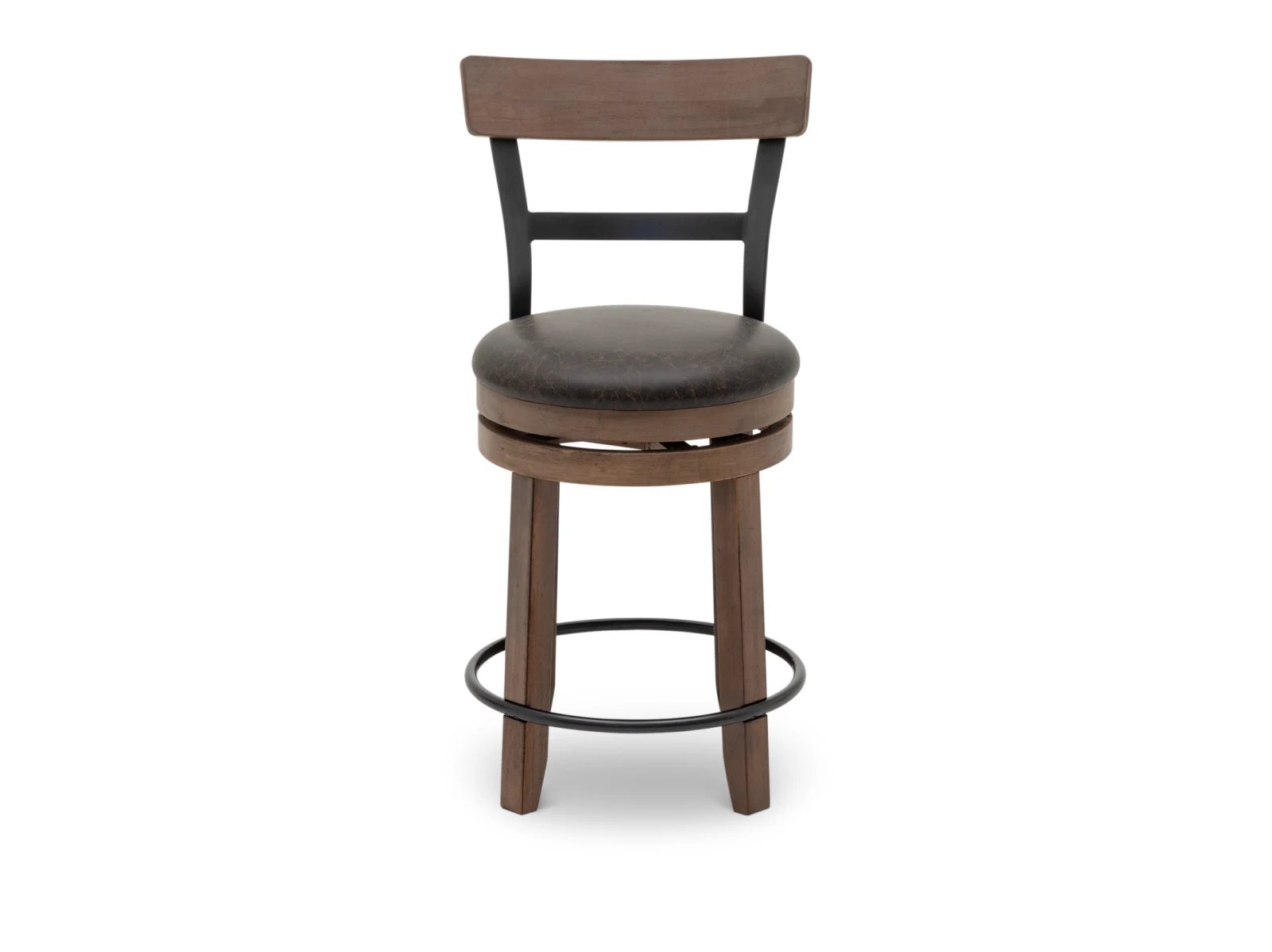 & Free ShippingTransform your dining space with the rustic-industrial Baker Street Swivel Bar Stool. Crafted from solid mahogany and mindi veneers, this beautiful bar stool showcases a warm Buckskin finish with rough-sawn distressing for added timeworn character, and its comfy swivel seat is upholstered with a supple leather-like fabric. To add to its authentic look, the Baker Street features a distinctive black metal backrest, and it sits atop four square post legs with convenient metal footrests. You’re going to love this enticing seat in your home today.