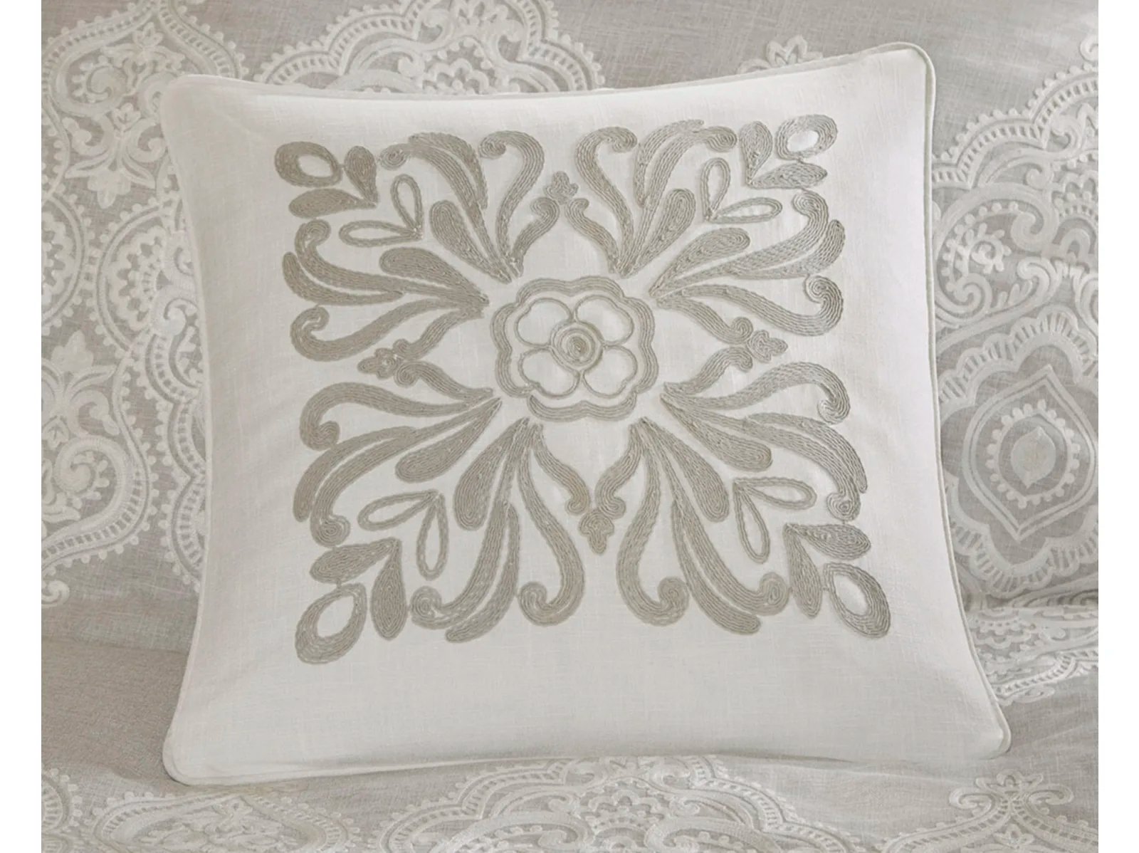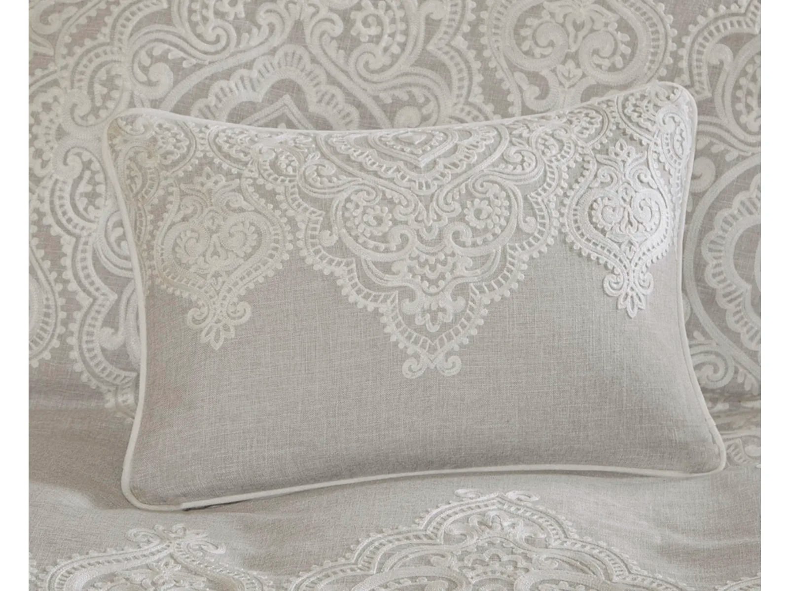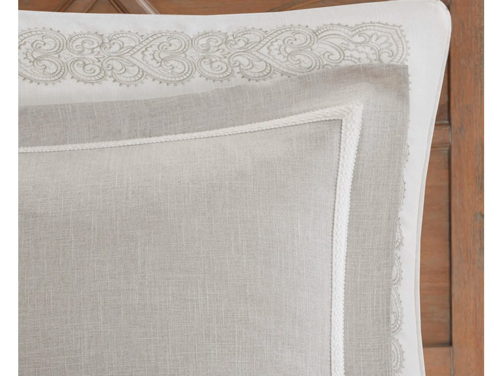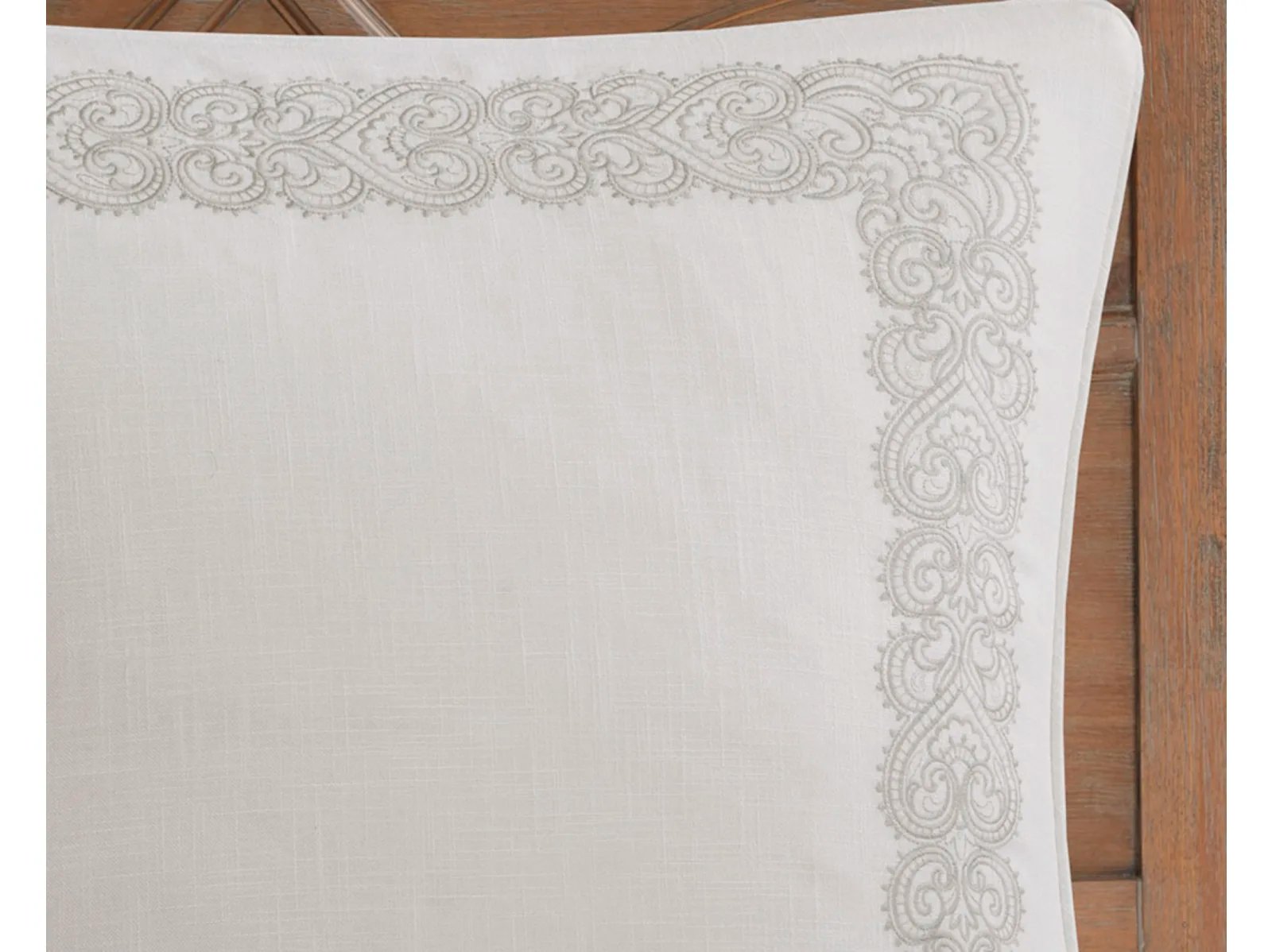 The Barely There Comforter Set provides a chic and neutral-hued style designed to suit any bedroom ensemble. Oversized and overfilled for maximum warmth and comfort, the textured comforter features beautiful white chain stitch embroidery in an intricate damask pattern. The solid natural reverse pairs well with the top design, while shams in coordinating colors and simple trim complement the set’s overall look. Two white Euro shams feature embroidered borders in a natural tone which adds a touch of elegance and sophistication. A trio of decorative pillows, each with a distinct embroidered pattern or textural detail, round out the gorgeous bedding set. The Barely There Comforter Set is available in either an 8 piece queen size set or a 9 piece king size set with an additional sham.