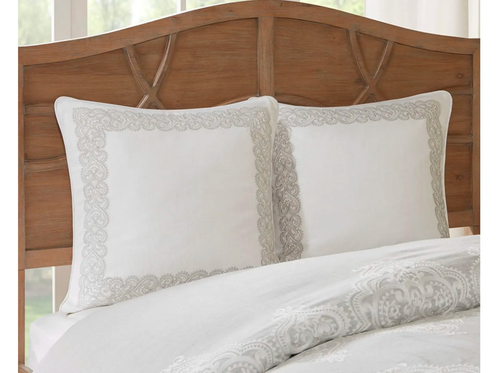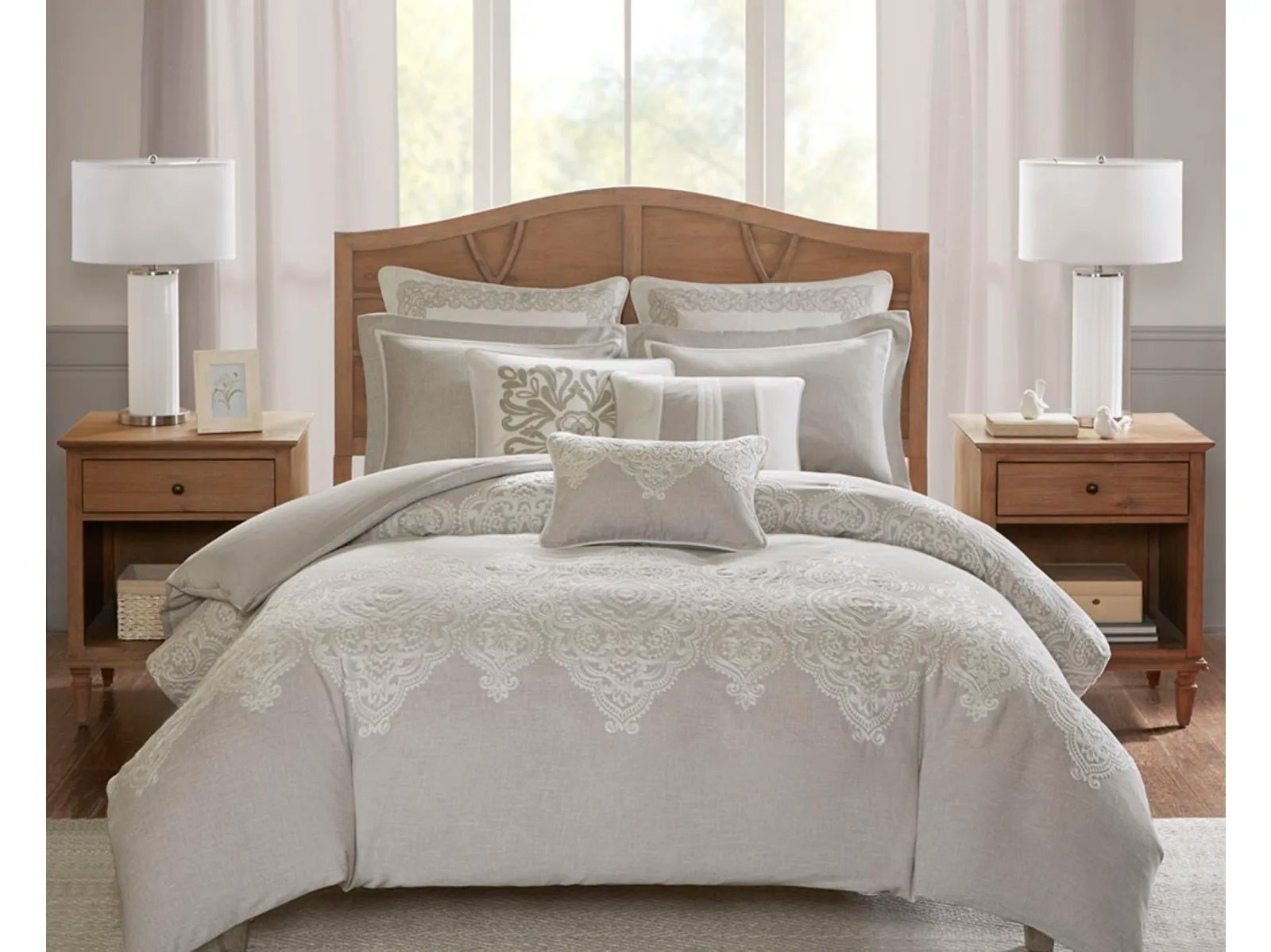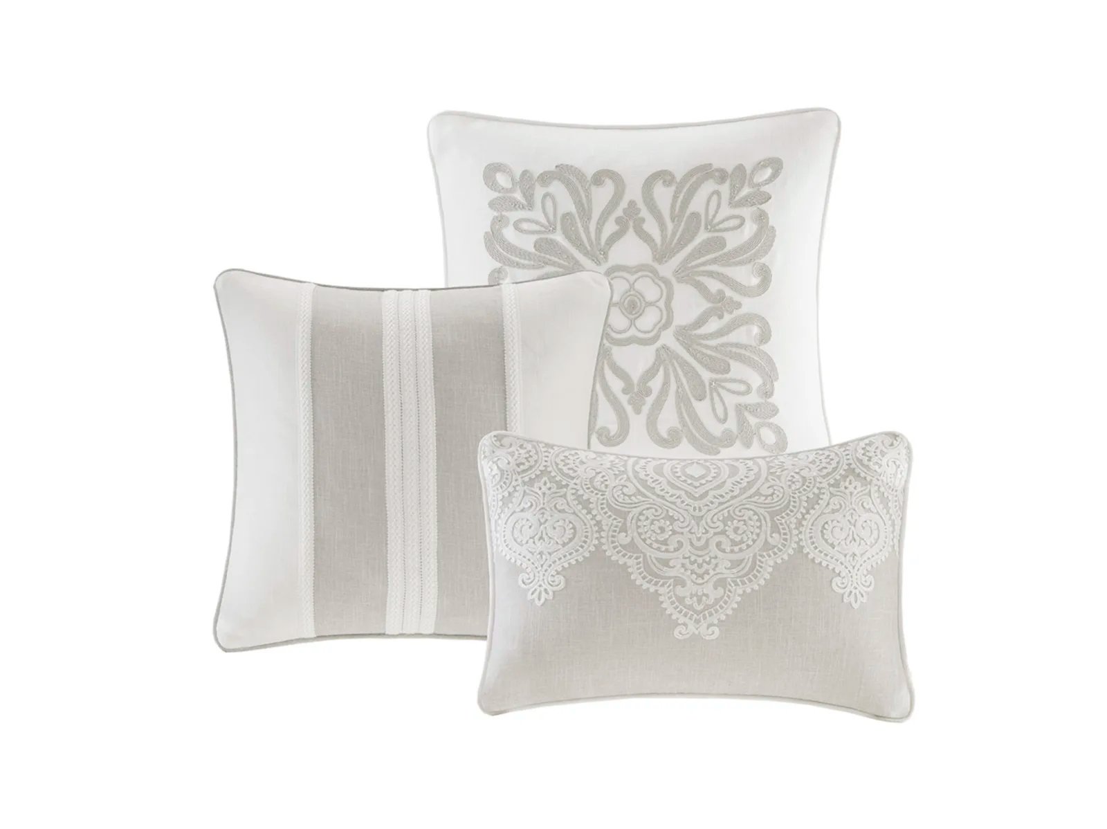 The Barely There Comforter Set provides a chic and neutral-hued style designed to suit any bedroom ensemble. Oversized and overfilled for maximum warmth and comfort, the textured comforter features beautiful white chain stitch embroidery in an intricate damask pattern. The solid natural reverse pairs well with the top design, while shams in coordinating colors and simple trim complement the set’s overall look. Two white Euro shams feature embroidered borders in a natural tone which adds a touch of elegance and sophistication. A trio of decorative pillows, each with a distinct embroidered pattern or textural detail, round out the gorgeous bedding set. The Barely There Comforter Set is available in either an 8 piece queen size set or a 9 piece king size set with an additional sham.