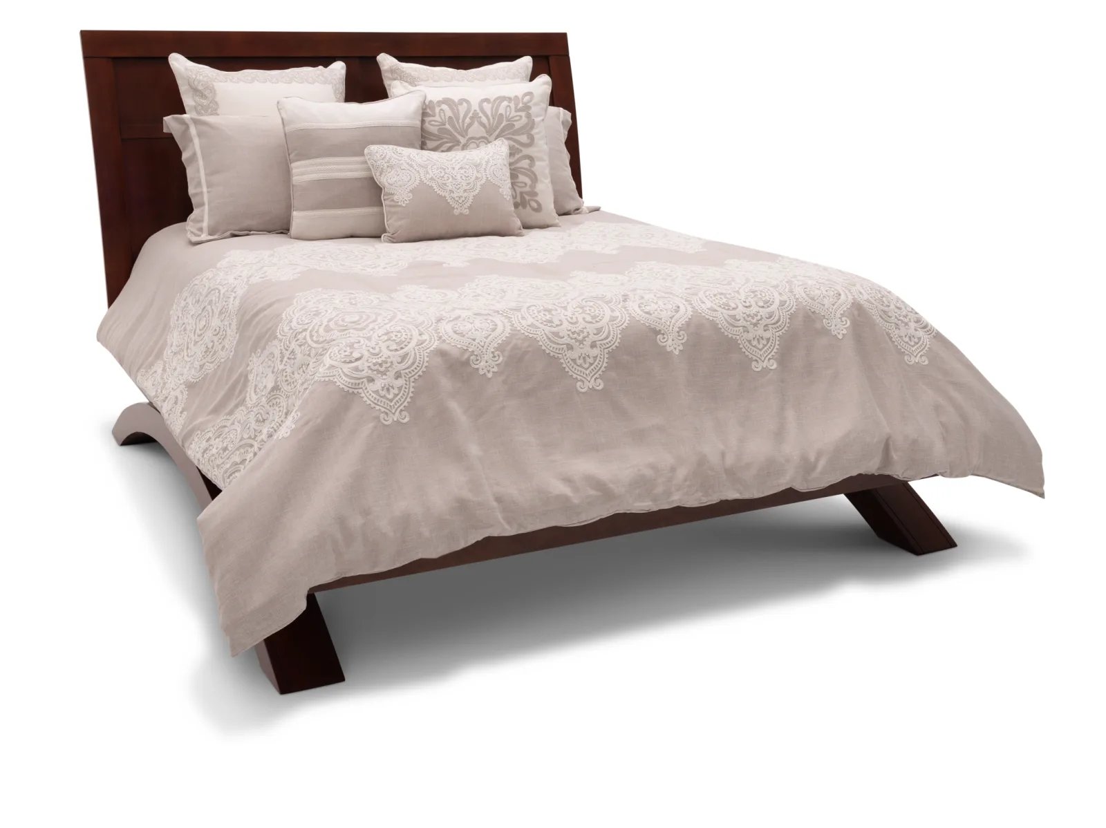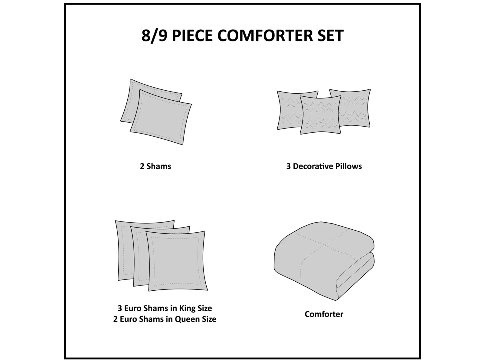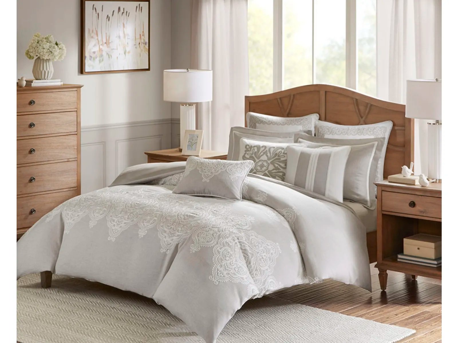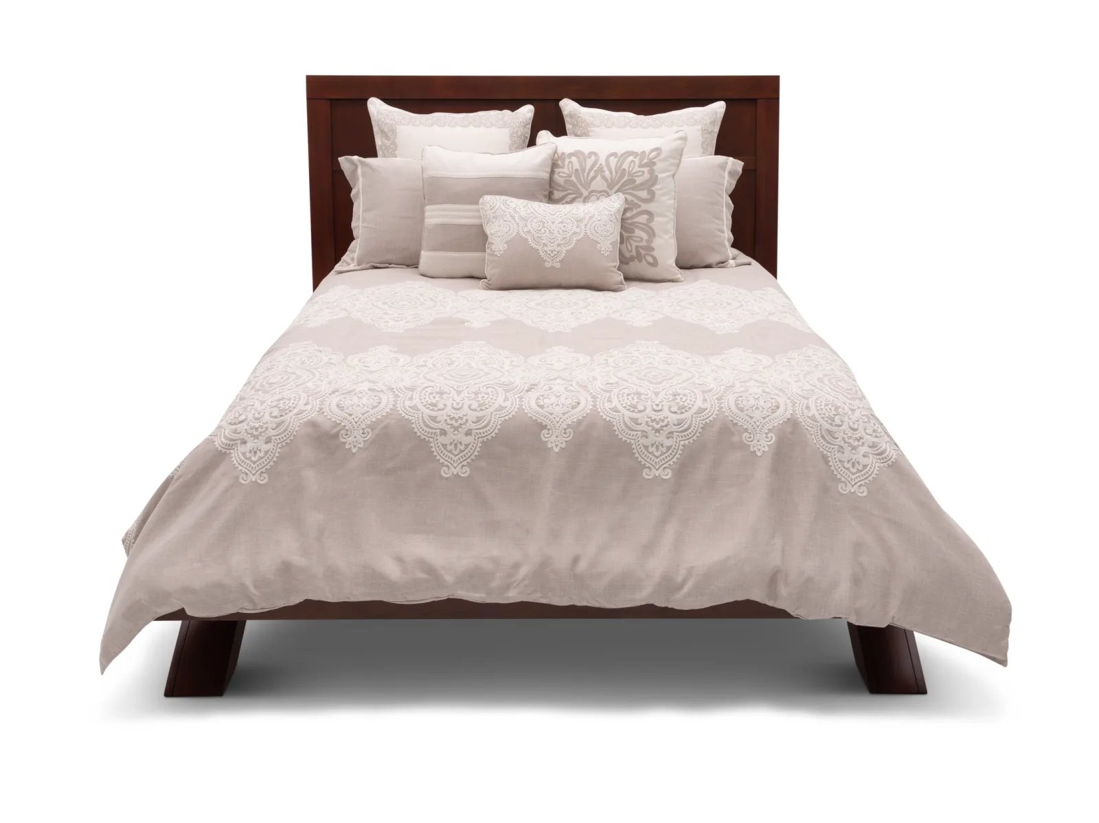 The Barely There Comforter Set provides a chic and neutral-hued style designed to suit any bedroom ensemble. Oversized and overfilled for maximum warmth and comfort, the textured comforter features beautiful white chain stitch embroidery in an intricate damask pattern. The solid natural reverse pairs well with the top design, while shams in coordinating colors and simple trim complement the set’s overall look. Two white Euro shams feature embroidered borders in a natural tone which adds a touch of elegance and sophistication. A trio of decorative pillows, each with a distinct embroidered pattern or textural detail, round out the gorgeous bedding set. The Barely There Comforter Set is available in either an 8 piece queen size set or a 9 piece king size set with an additional sham.