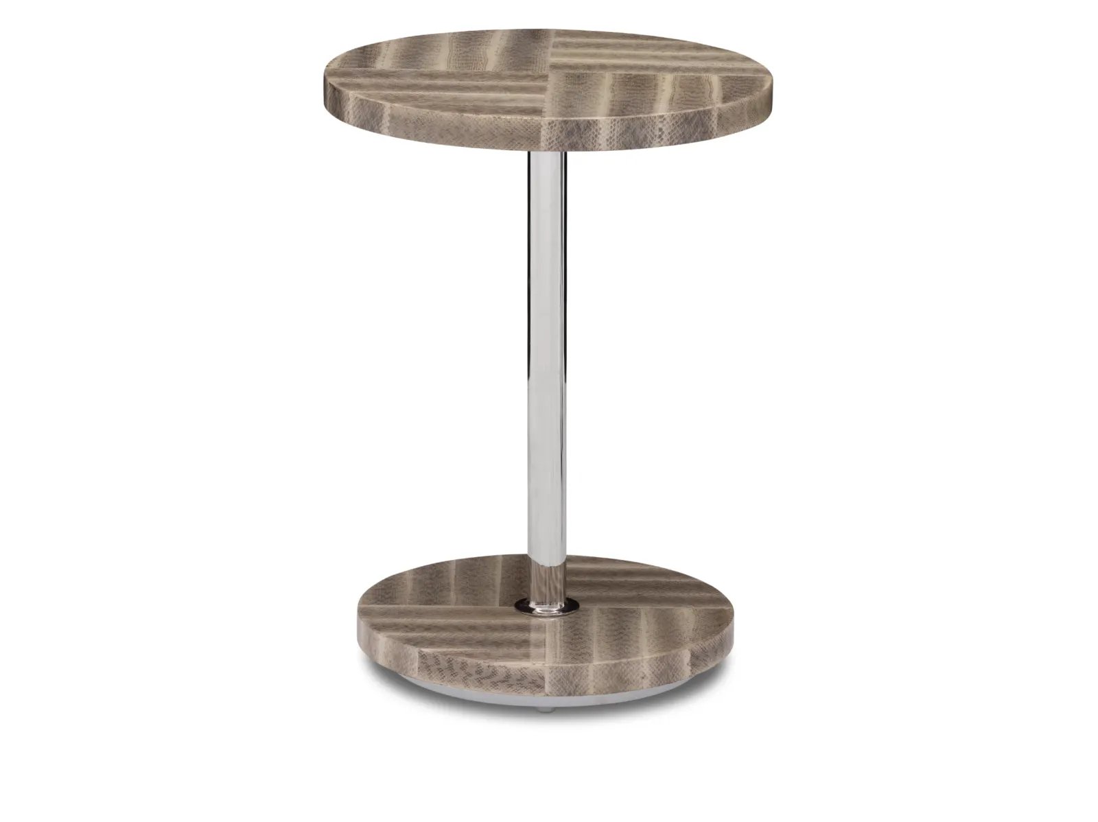 & Free ShippingContemporary sophistication and distinctive intrigue come together beautifully in the Barito Spot End Table. The circular table top and base of head-turning end table showcases veneered true freshwater snakeskin in a gray finish, and its elegant cylindrical post boasts a nickel finish to perfect its stylish neutral-toned palette. You’re going to love the Barito Spot End Table in your home today.