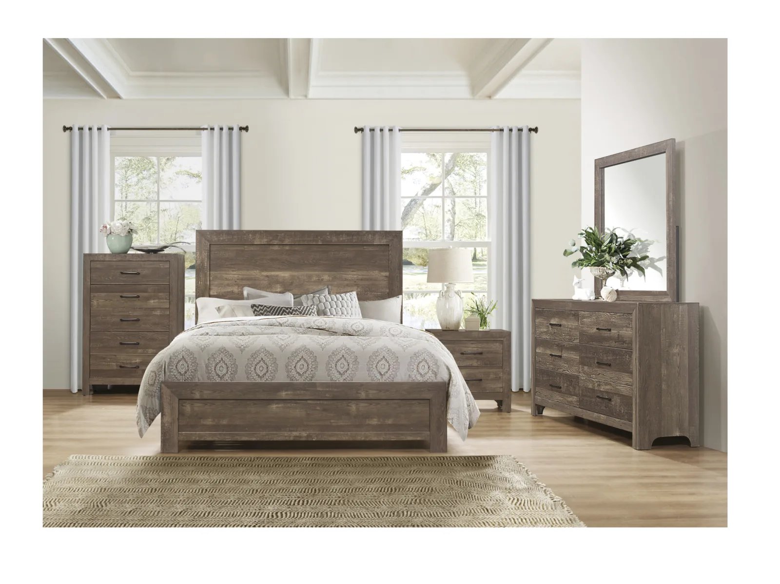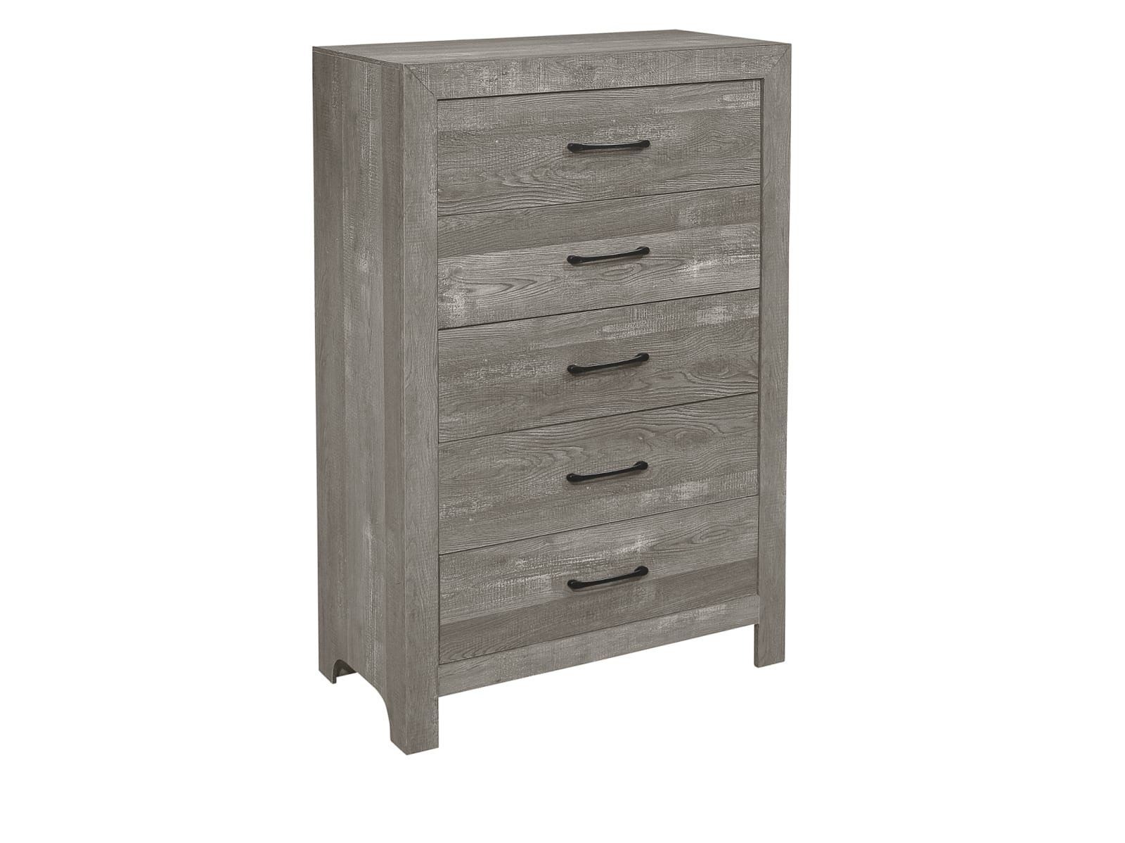 & Free ShippingModern lines and rustic styling are paired to create the look of the Bayou Collection. The 3D printed paper veneer's texture is highlighted by a rustic brown, gray or white finish for a realistic wood look. Providing complementing contrast, the drawer fronts of the chest feature black metal hardware. Subtle framing defines the profile of the chest, further lending to the unfettered design of the collection.