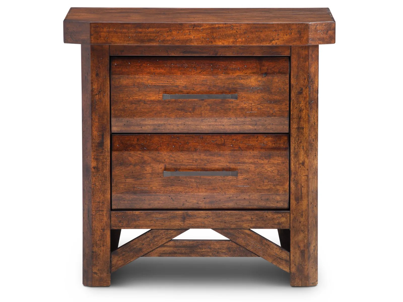 The wood of the Bear Creek Nightstand has been distressed using a specialized hand-planed technique to create ultimate rustic beauty. Sloped beveled shaping has been milled into both of the two drawers, adding high end dimension and a solid hardwood feel. The medium oak finish shows the distinctive character of the timber, perfect to create your own lodge inspired oasis. The base of the piece is designed with gussets and crossbeams, alluding to the soaring rooflines of log built homes idealized in western resort architecture.
