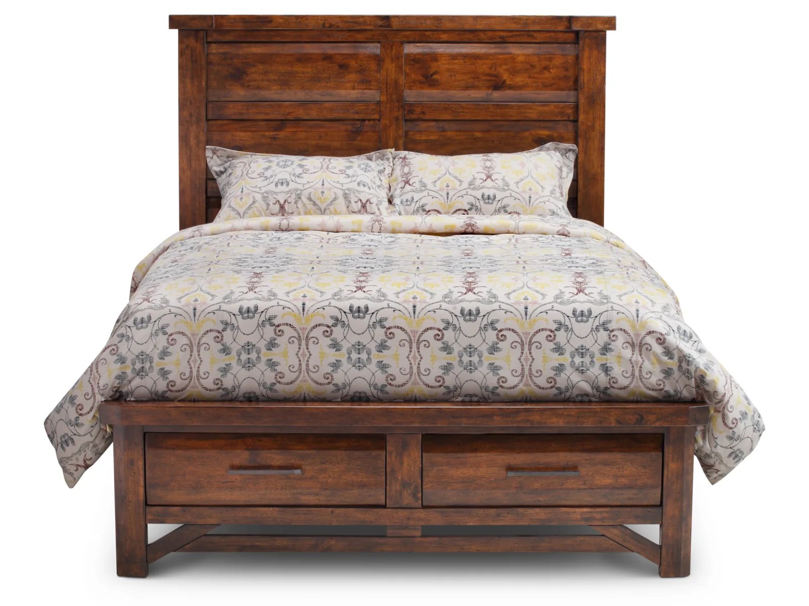 The wood of the Bear Creek Storage Bed has been distressed using a specialized hand-planed technique to create ultimate rustic beauty. Sloped beveled shaping has been milled into the drawers, which open at the foot of the bed, adding high end dimension and a solid hardwood feel. The medium oak finish shows the distinctive character of the timber, perfect to create your own lodge inspired oasis. The base of the piece is designed with gussets and crossbeams, alluding to the soaring rooflines of log built homes idealized in western resort architecture. This beautifully crafted bed is available in queen and king sizes.