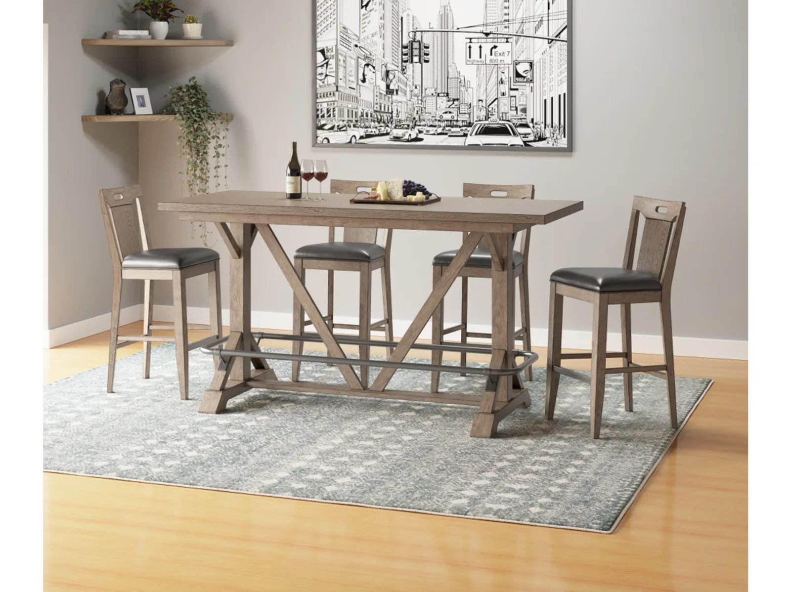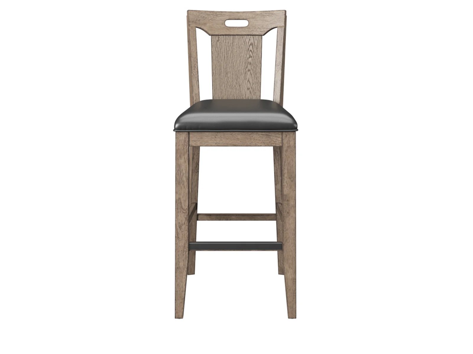 Belly up to the bar of your choice with the Beckley. Options abound for the perfect spot to gather with friends and family with this casual, bar height dining collection. Randomly matched oak veneers finished in a warm, pecan brown create a laid-back appeal while hardwood solids, easy-to-maintain Polyurethane faux leather upholstery, and metal foot rails and kick plates assure the Benton collection will stand up to the rigors of everyday use.