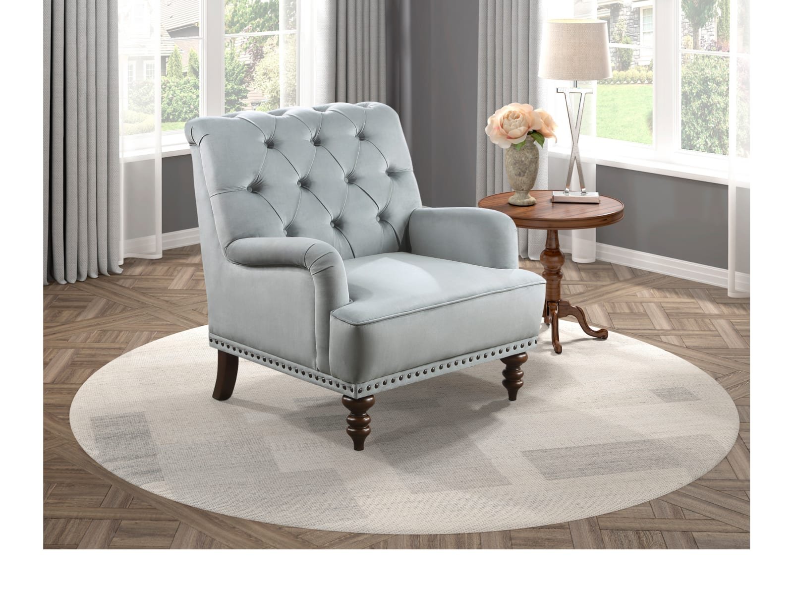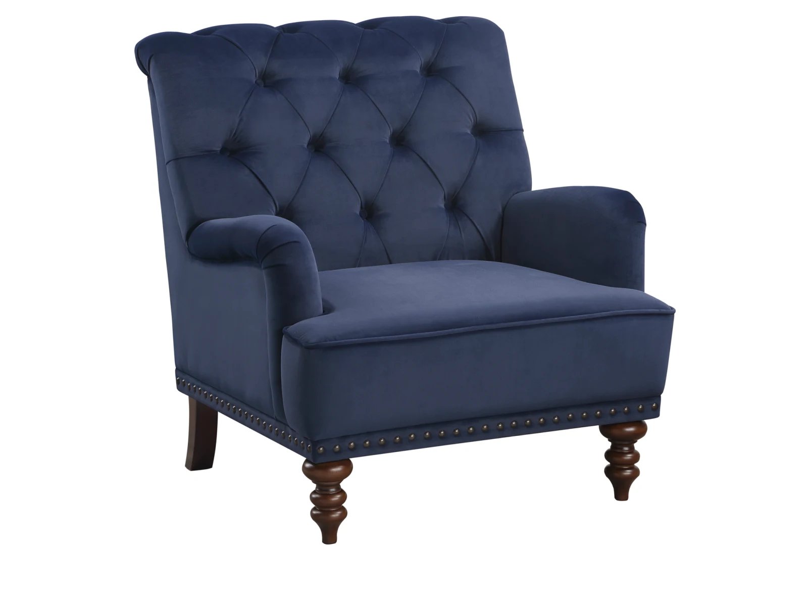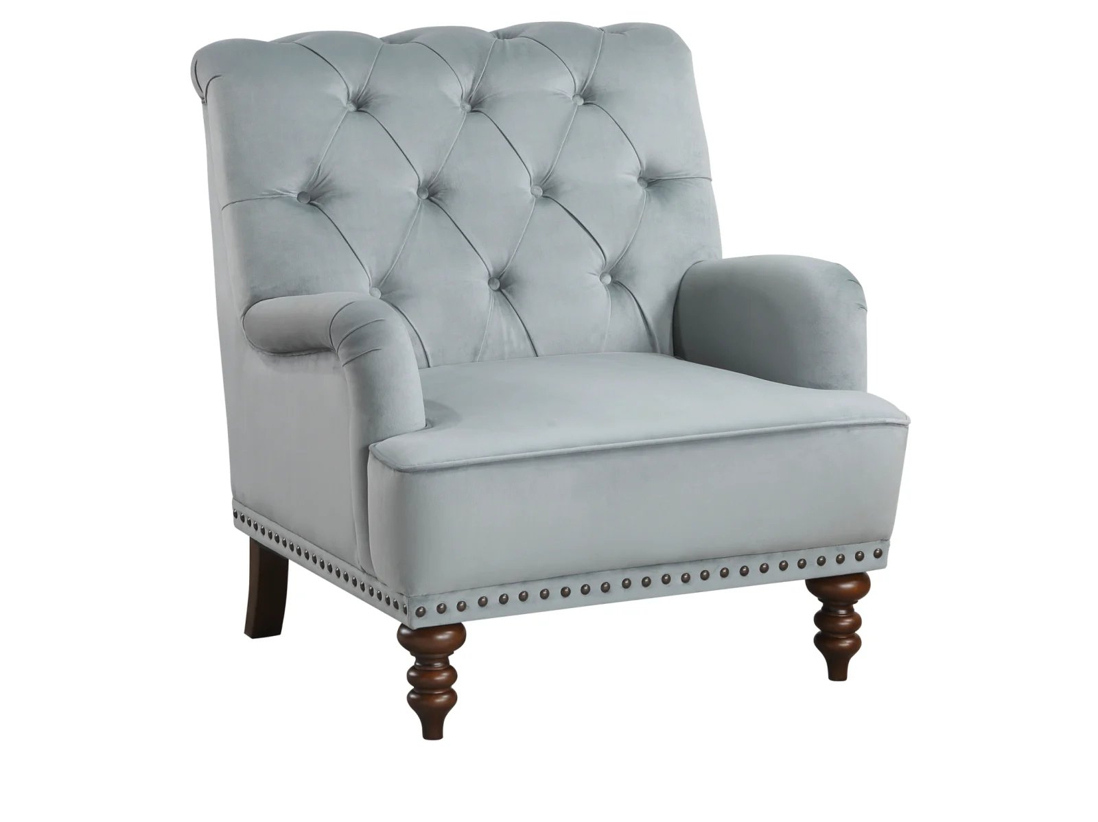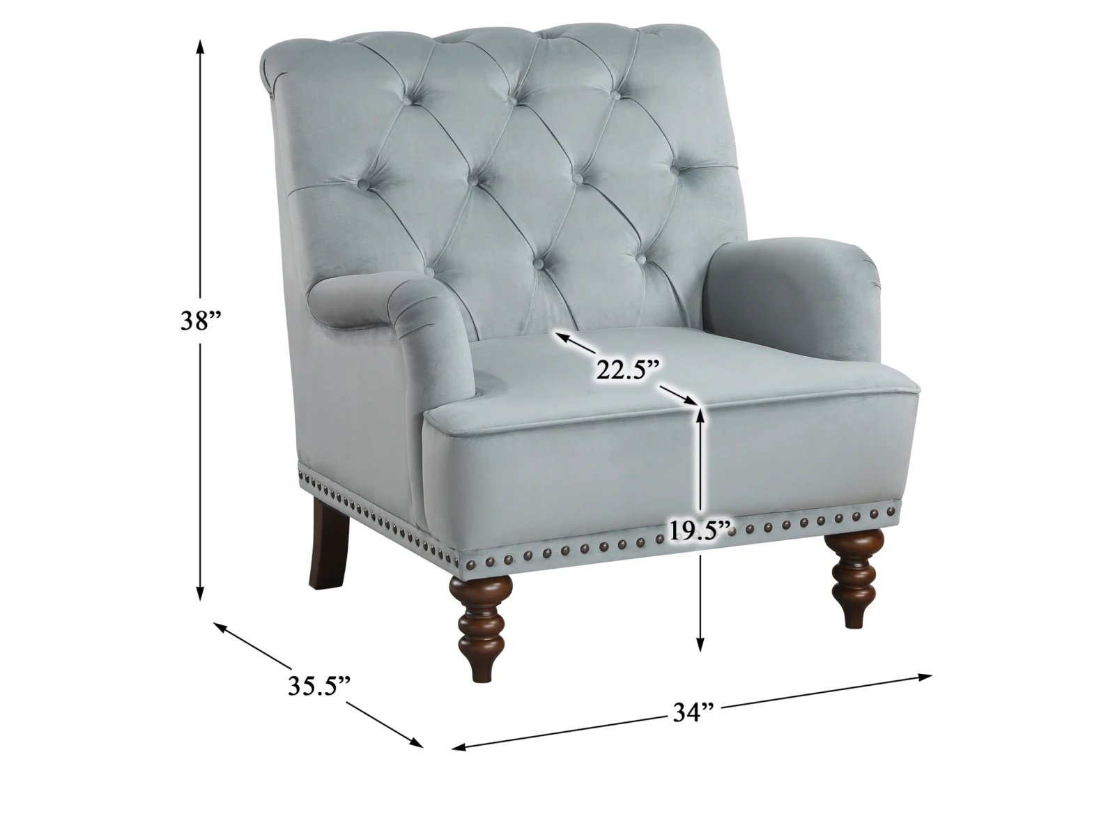 & Free ShippingAn air of refined tradition lends its elegance to the design of the Bellmead Collection. Tailored to enhance the graceful curves of the chair’s profile, classic accenting in the form of turned legs and button tufting further the timeless look of the piece. Dark blue or gray velvet upholstery covers the chair, its rich hue a perfect complement to your space.