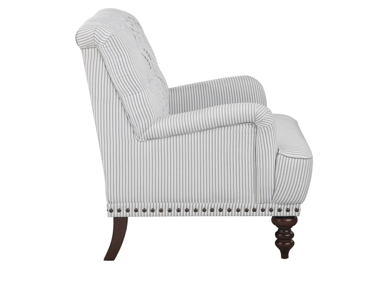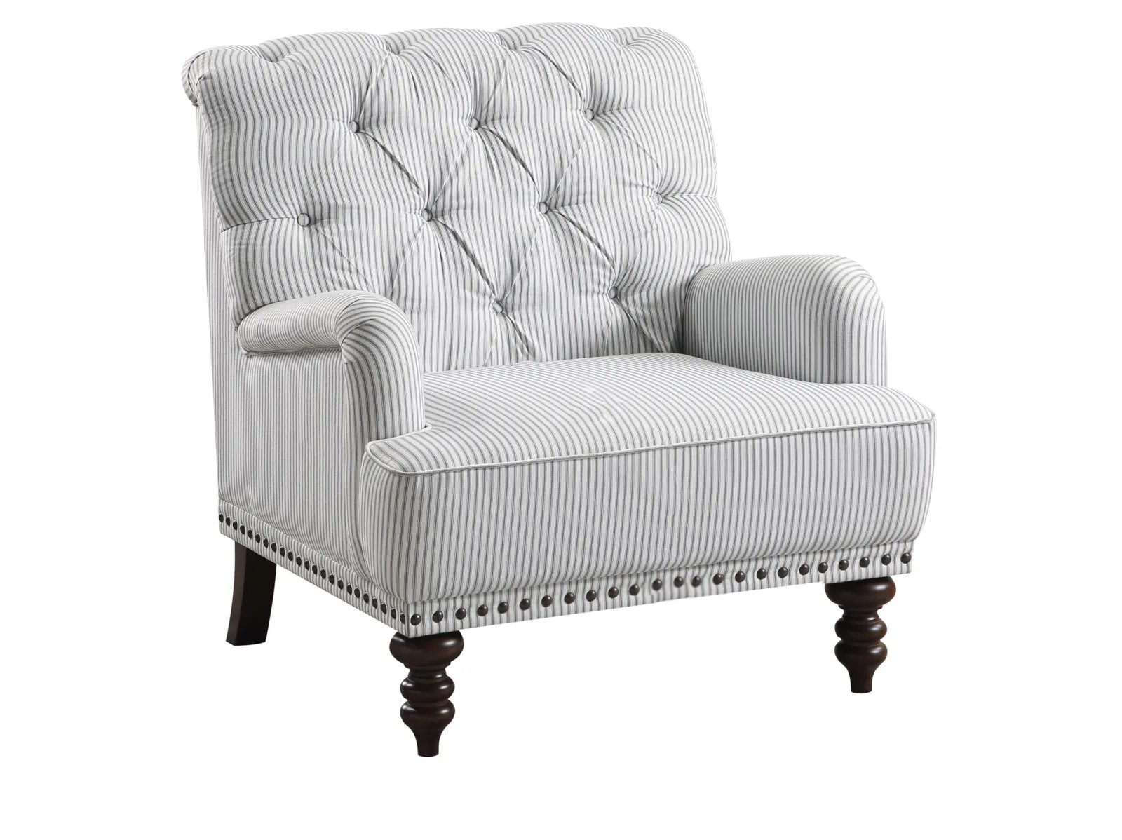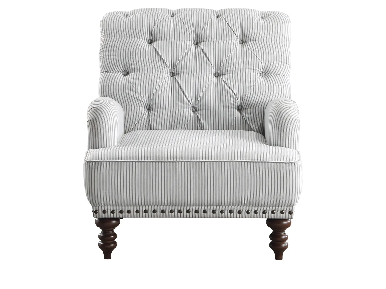 & Free ShippingAn air of refined tradition lends its elegance to the design of the Bellmead II Collection. Tailored to enhance the graceful curves of the chair’s profile, classic accenting in the form of turned legs and button tufting further the timeless look of the piece. Gray and white striped fabric upholstery covers the chair, its neutral hue a perfect complement to your space.