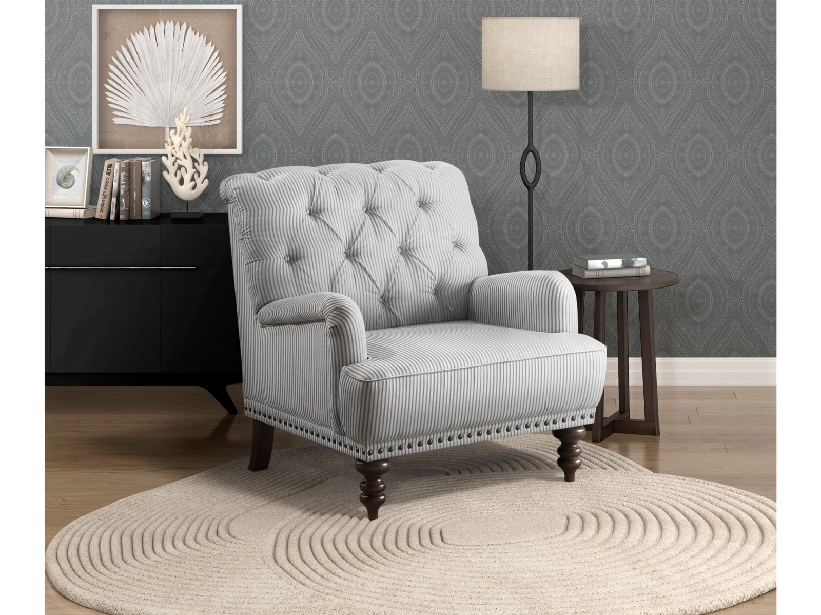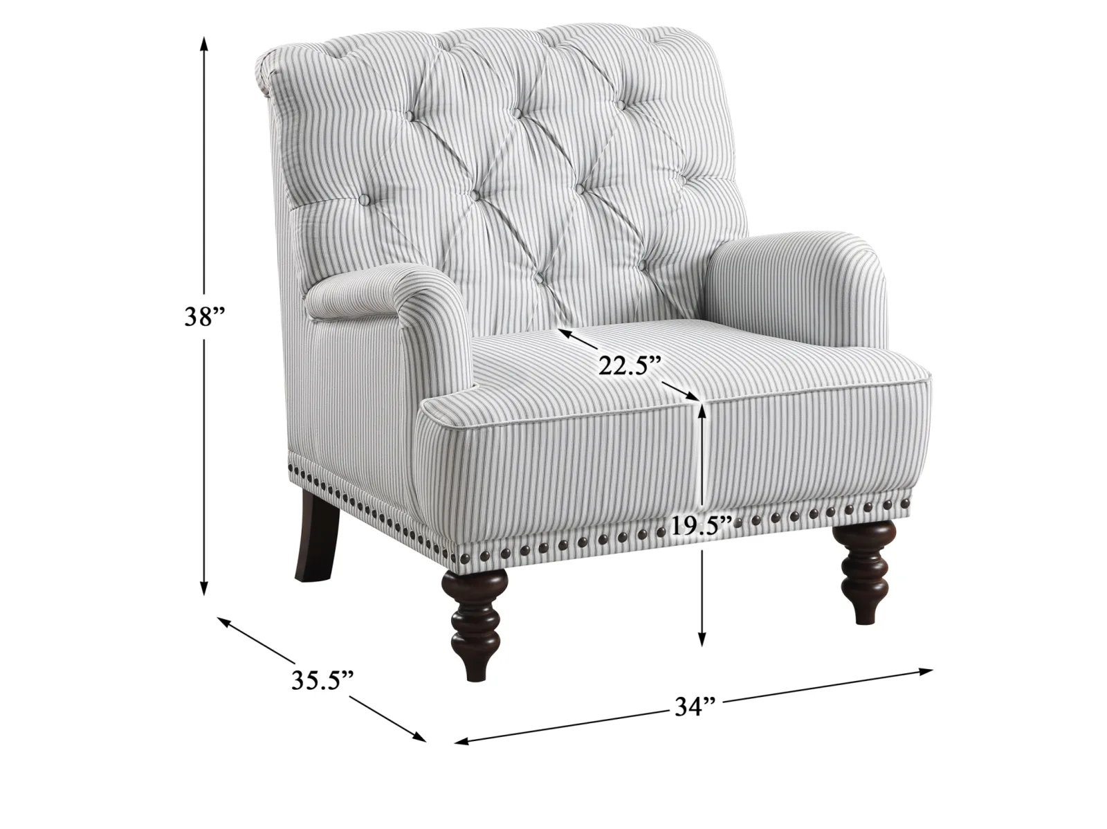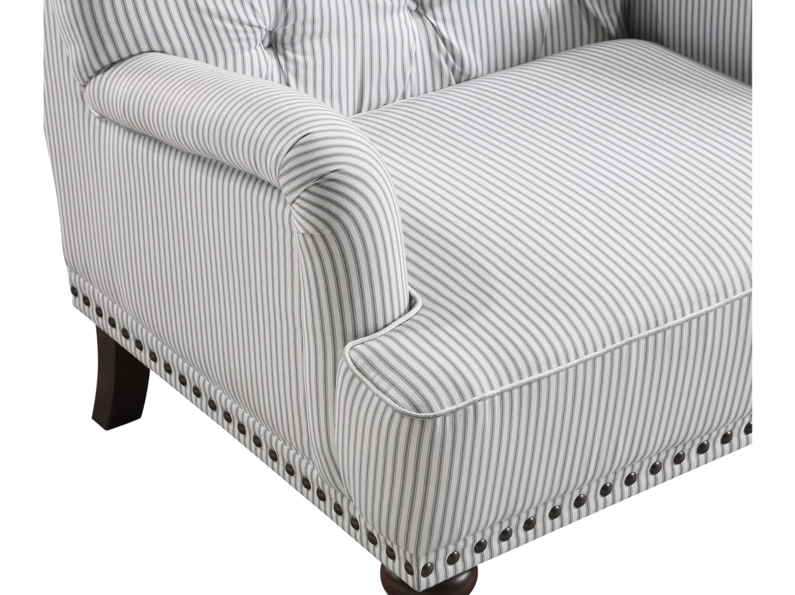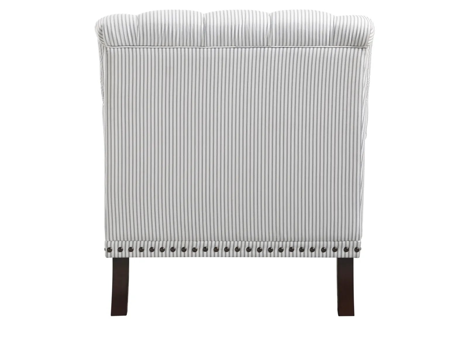 & Free ShippingAn air of refined tradition lends its elegance to the design of the Bellmead II Collection. Tailored to enhance the graceful curves of the chair’s profile, classic accenting in the form of turned legs and button tufting further the timeless look of the piece. Gray and white striped fabric upholstery covers the chair, its neutral hue a perfect complement to your space.