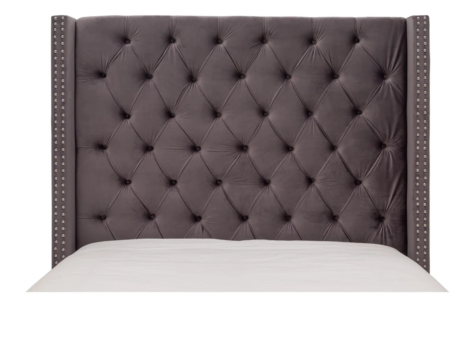 Create an unforgettable bedroom aesthetic with the one-of-a-kind Bennett Upholstered Bed. This stylish bed makes a sophisticated statement in any space thanks to its stunning winged headboard, and every inch of it is wrapped in a luxurious gray velvet fabric that’s perfect for today’s interiors. To perfect its upscale look, the Bennett showcases diamond-patterned button tufting, and its metal feet showcase a glamorous chrome finish which is a beautiful compliment to the chrome nailhead detailing running along each of its inviting wings. You’re going to love redefining your bedroom with the Bennett Upholstered Bed.