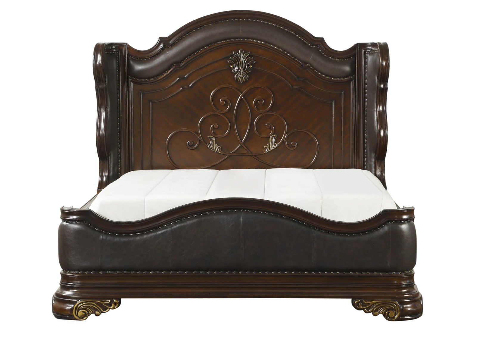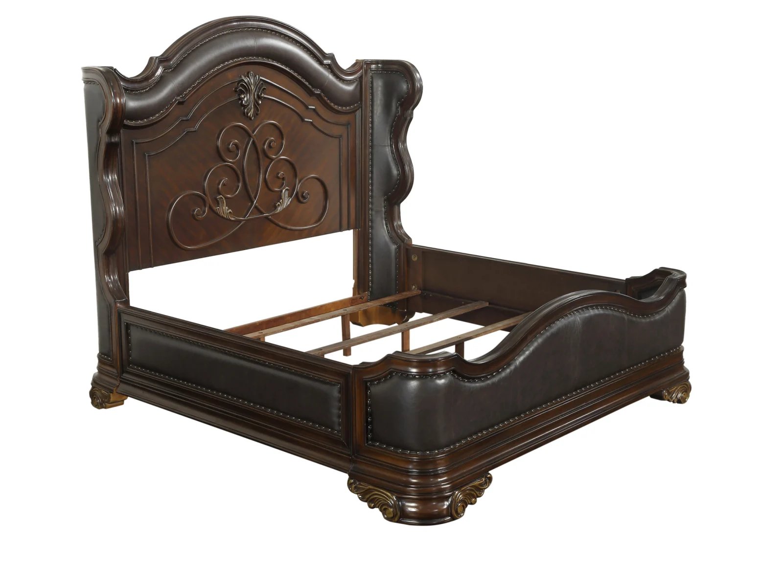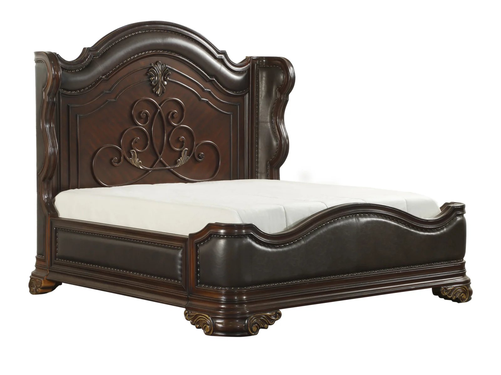 Grandly styled for the traditional home is the Bernard Collection. Prominent decorative scrolling adorns the headboard while heavier, carved scrolling accents the pilasters and feet of each piece in the collection. The substantial wood framing of the bed creates a distinct serpentine profile that carries into the design of the case pieces. Brown bi-cast vinyl provides complementing contrast to the rich cherry finish. Traditional cherry and birch veneers accenting furthers the elegant presentation of the Bernard Collection.