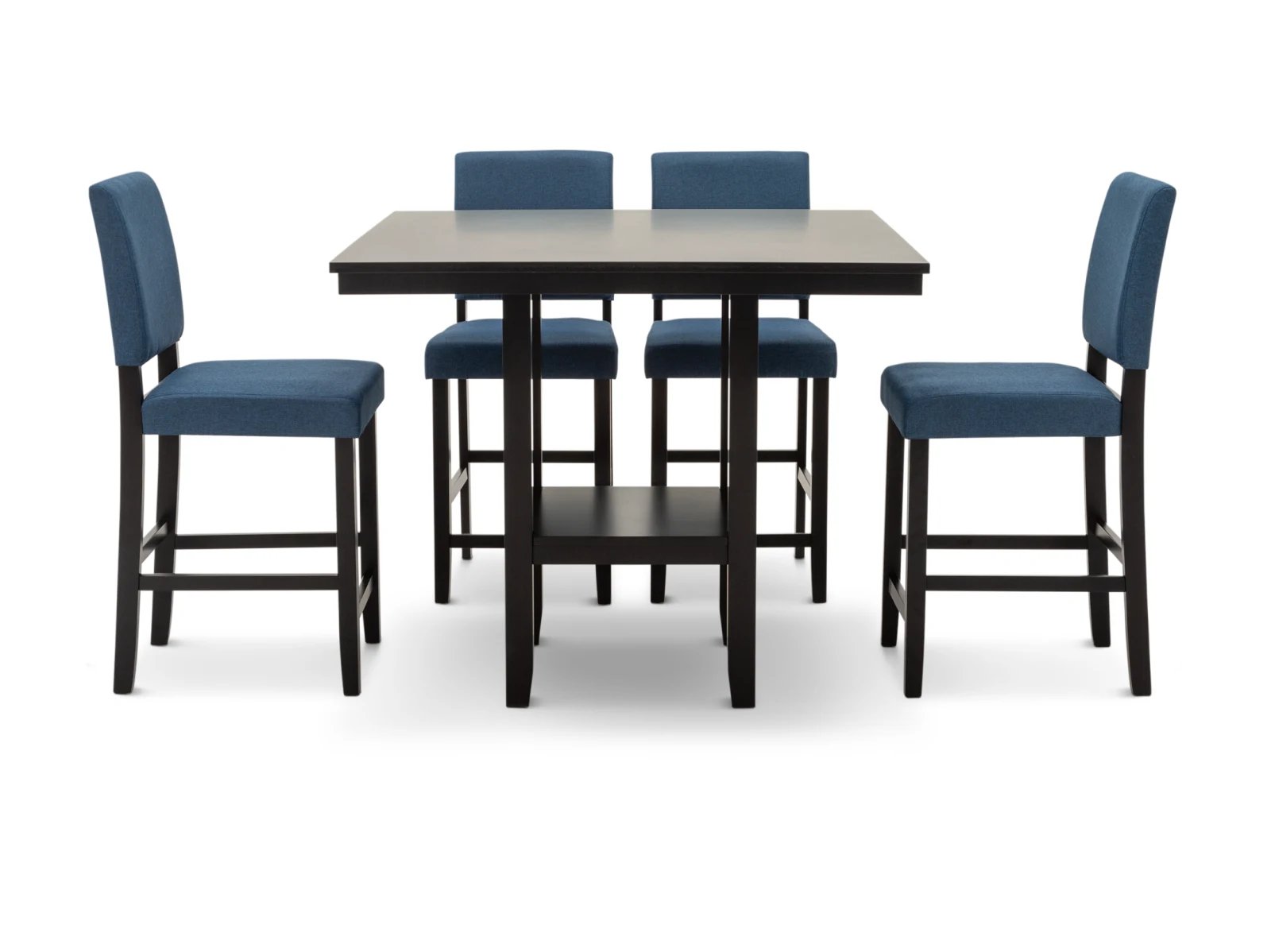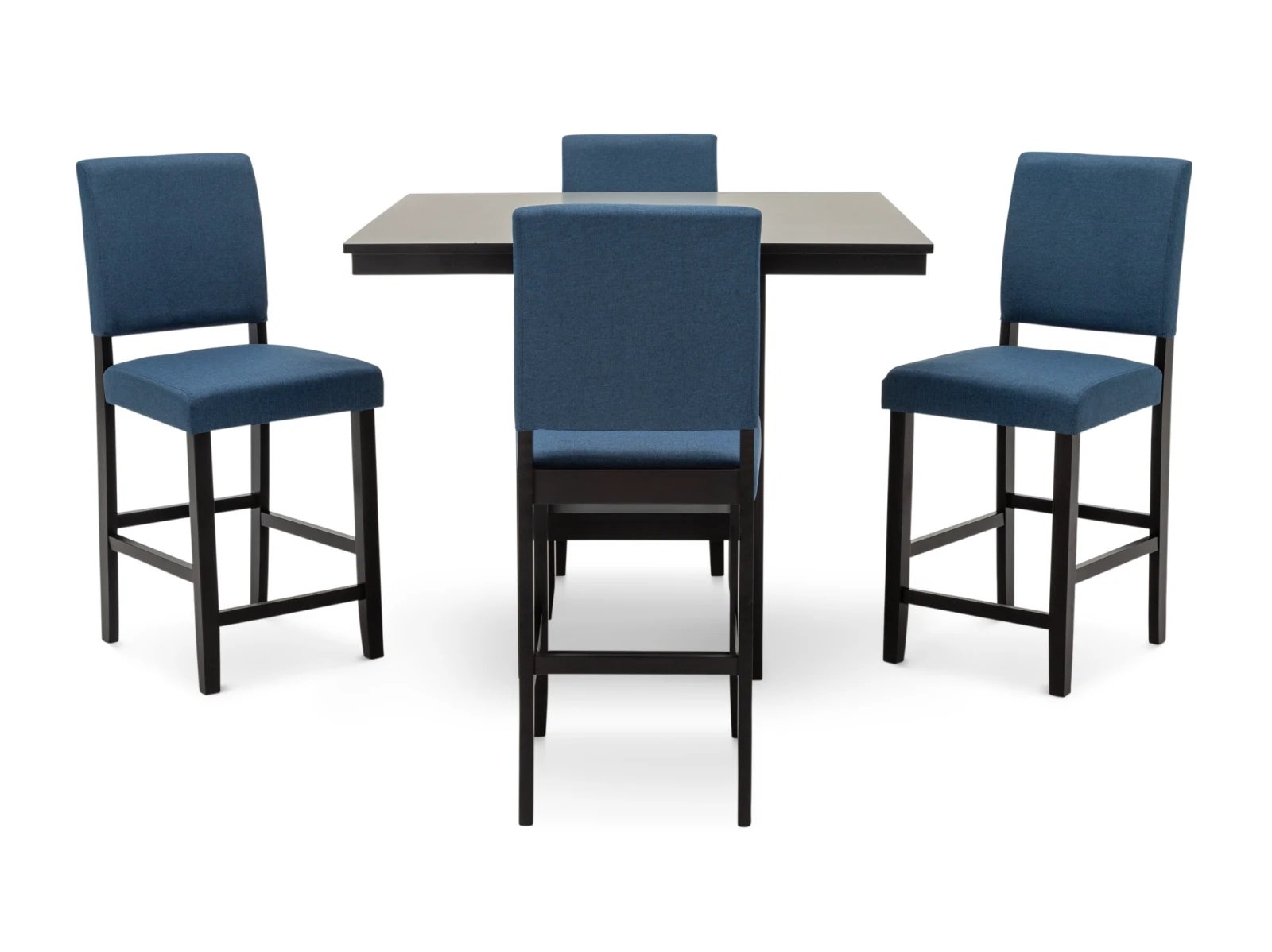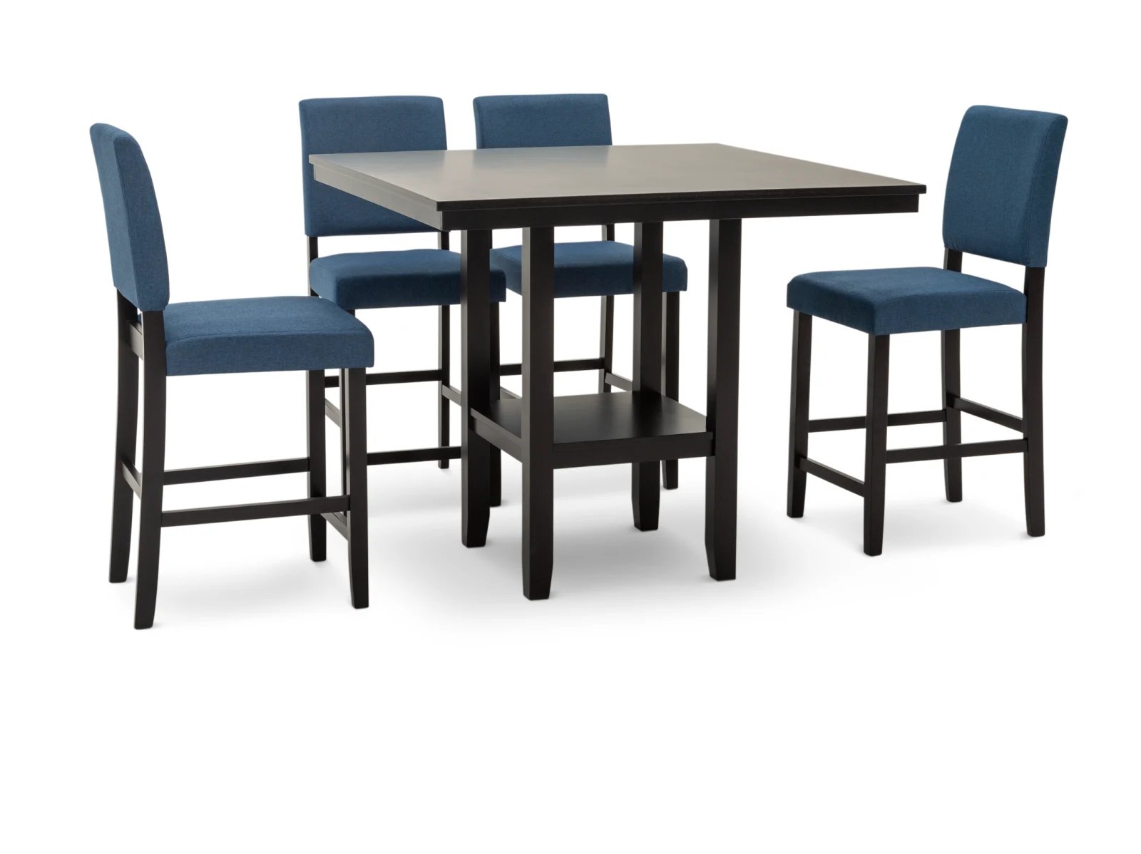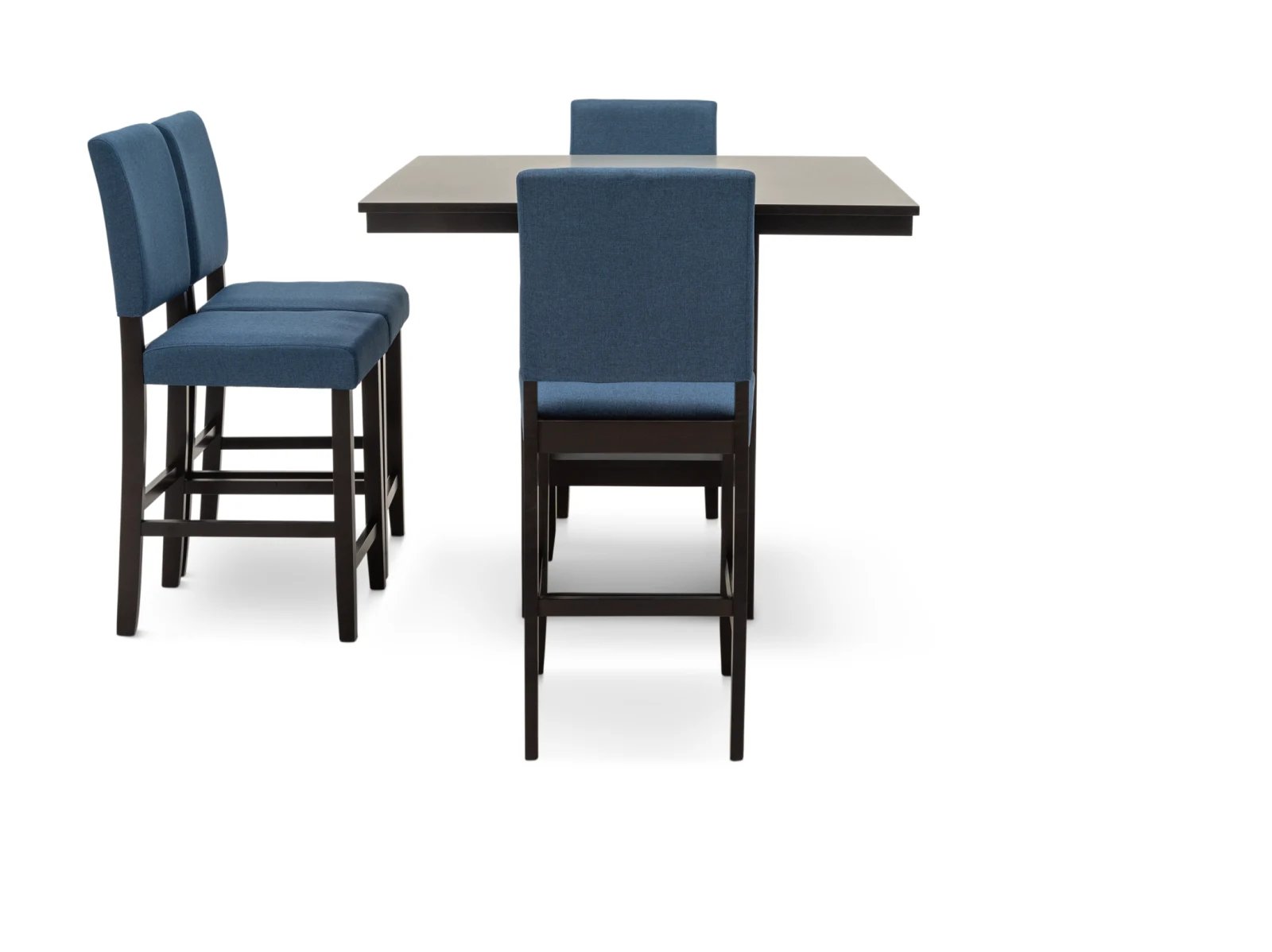 Create a sophisticated, modern dining space in your home with the Big Sur 5 Pc. Counter Height Dining Set. Displaying a versatile espresso finish, the dining table of this enticing set features a thick-cut square top that’s perfect for intimate conversations, and it also offers a convenient display shelf between its four square post legs. To complete the look, the accompanying Big Sur Barstools boast low-profile backrests, straight-lined legs with sturdy stretchers, and they feature comfy cushioned seats upholstered with a blue, linen-like fabric that’s durable and easy to clean.
