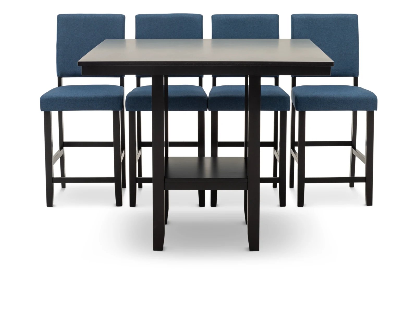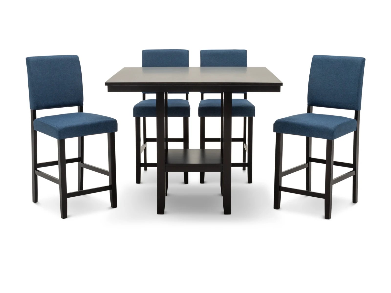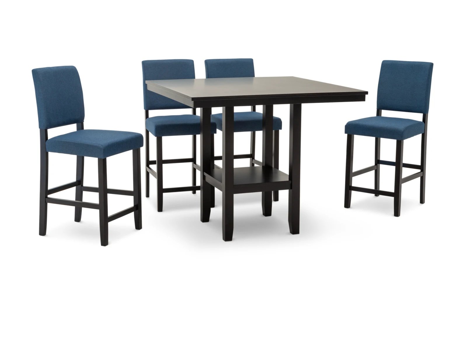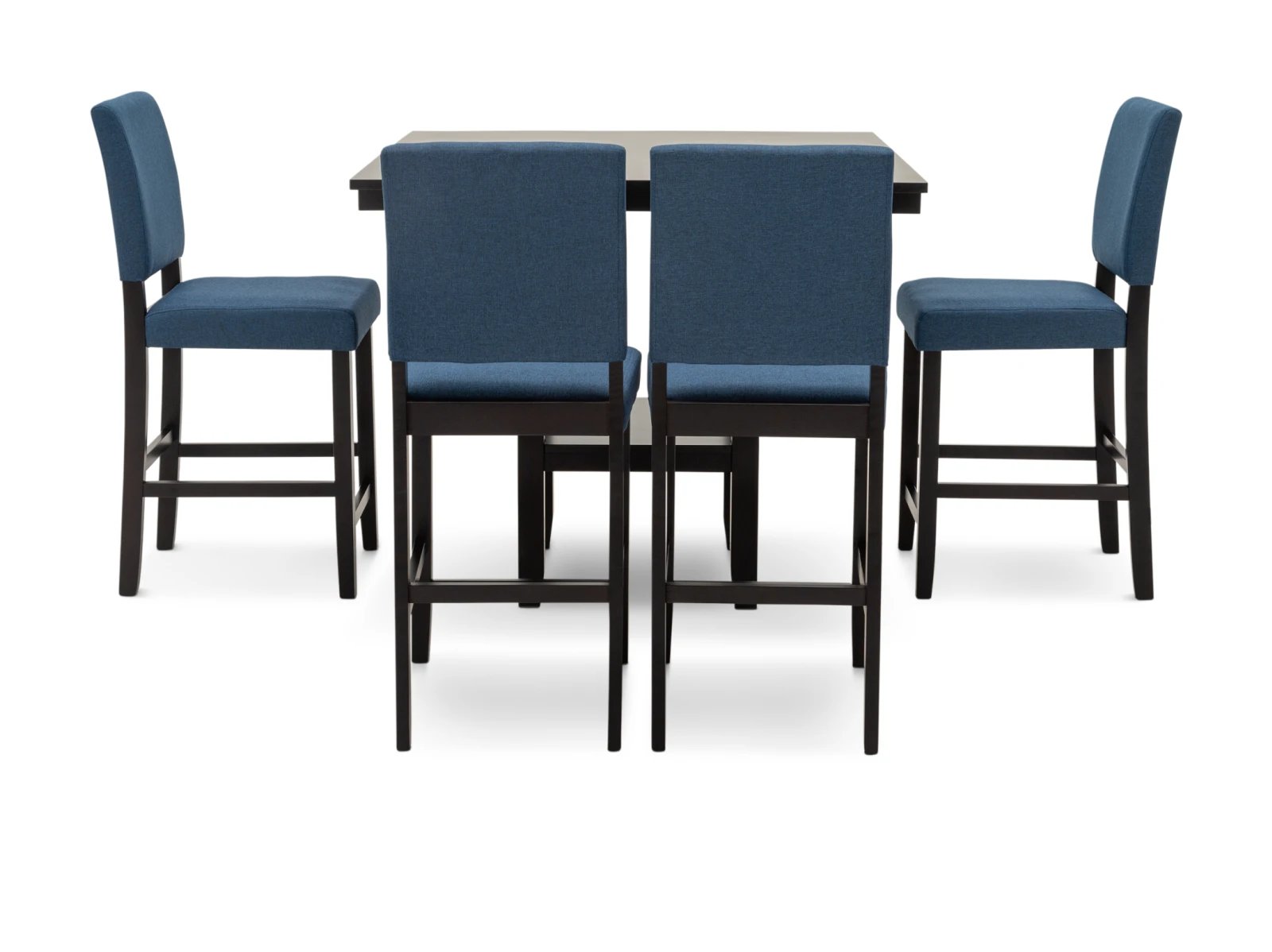 Create a sophisticated, modern dining space in your home with the Big Sur 5 Pc. Counter Height Dining Set. Displaying a versatile espresso finish, the dining table of this enticing set features a thick-cut square top that’s perfect for intimate conversations, and it also offers a convenient display shelf between its four square post legs. To complete the look, the accompanying Big Sur Barstools boast low-profile backrests, straight-lined legs with sturdy stretchers, and they feature comfy cushioned seats upholstered with a blue, linen-like fabric that’s durable and easy to clean.