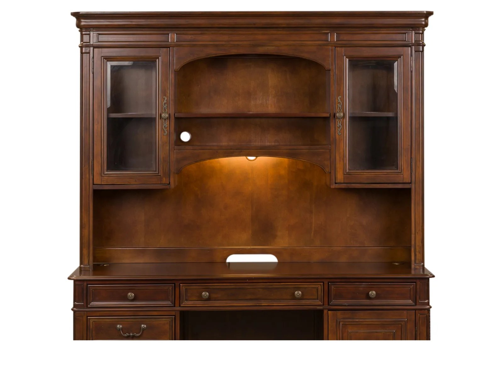 Create a classic look with a casual feel with the Birmingham Credenza and hutch. Crafted with pine solids with cathedral white oak tops and pine veneer fronts, this piece features bottom case dust proofing, a wire brushed white finish with planked charcoal tops, a flip-down keyboard tray, and an open design concept. Touch lighting illuminates the wood framed glass doors and planked back panel on the hutch. Storage abounds with fully stained full extension drawers, a locking file drawer, and adjustable shelves located in the hutch. With today’s modern technology in mind, users can enjoy the convenience of the built-in wire management provisions.