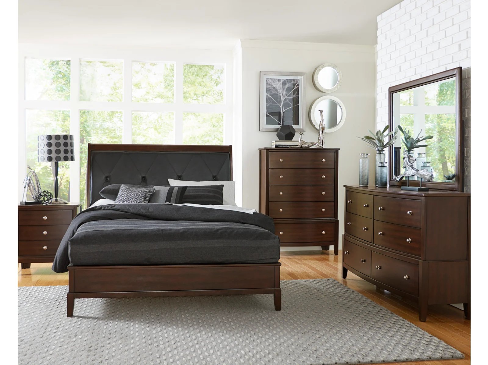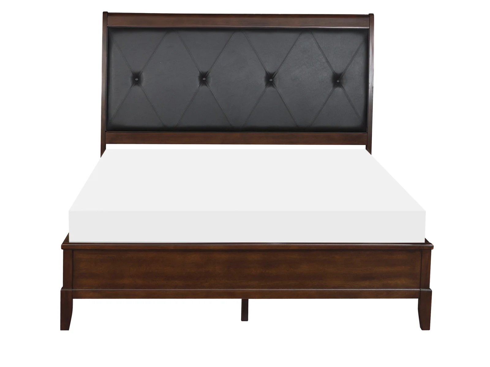 With transitional styling that is at home in a number of decorative environments, the Blake II Upholstered Bed will be a versatile addition to your home. The versatile, on-trend gray or cherry finish on pine solids and birch veneers dramatically enhances the wood grain. The upholstered headboard features vinyl insert with X-stitching and button tufting, while tapered feet add a modern design touch. You will love the Blake II in your home. This bed is available in full, queen, king and California king sizes.