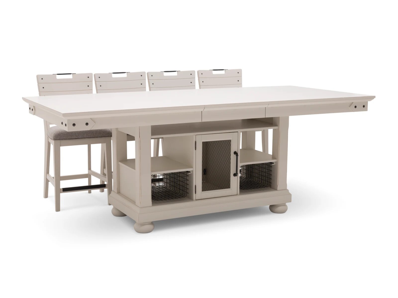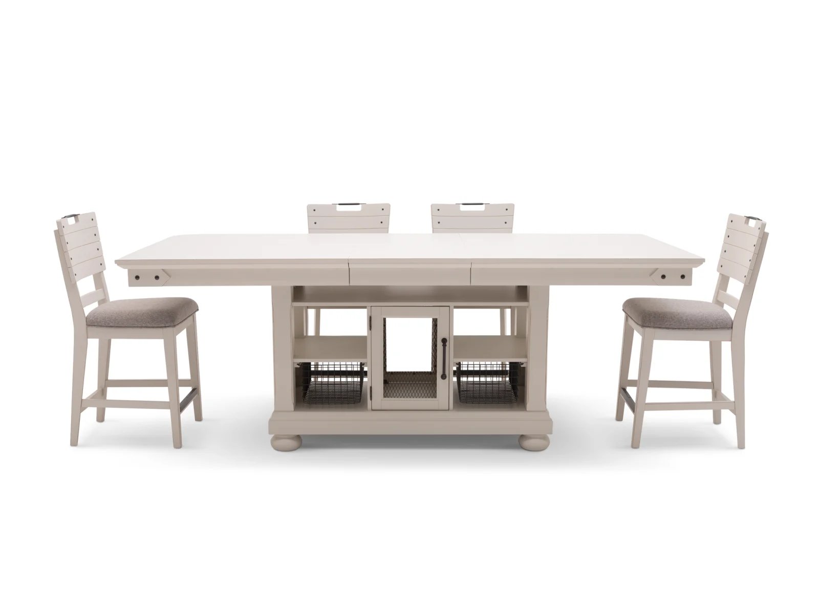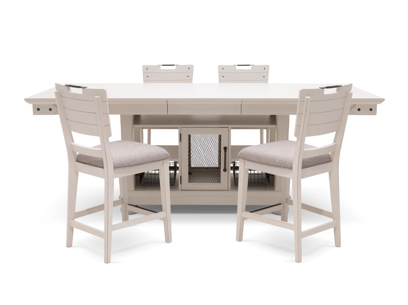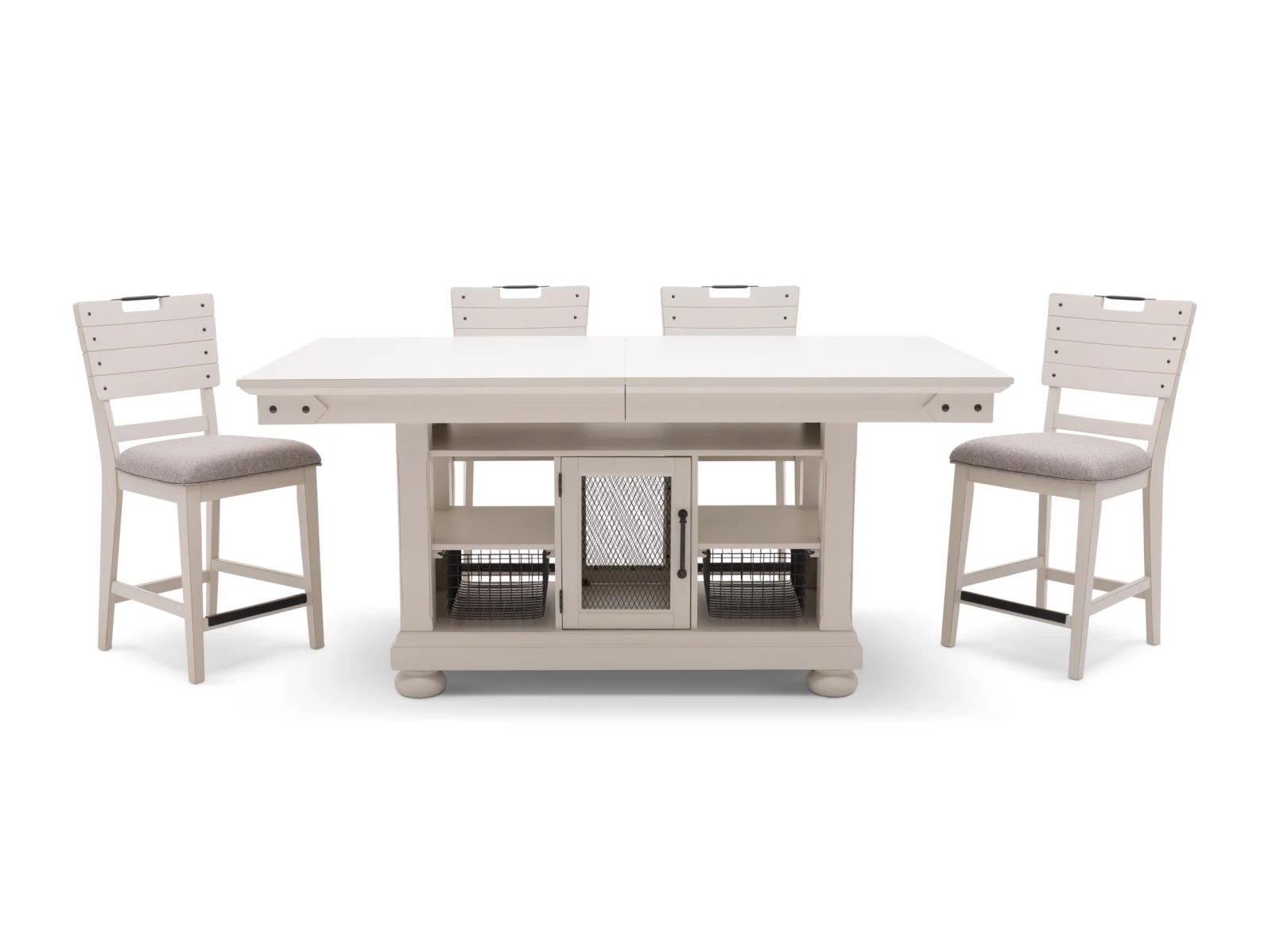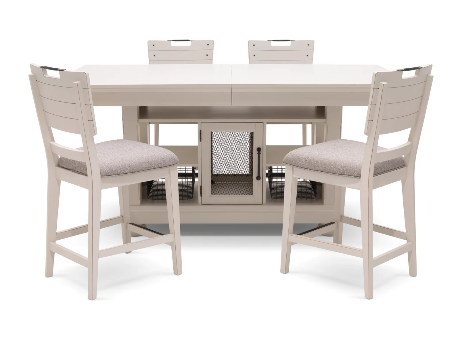 & Free ShippingThe Blanco Peak Counter Height Dining Set showcases uncommon design with hints of industrial influence to provide a style that is as intriguing as it is approachable. The items in this set are built from solid hardwood and clad in birch veneers finished in a clean white color. The supremely functional counter height island table features a butterfly leaf top paired with an attractive storage base outfitted with bun feet, storage shelves, cabinet space, and rustic pipe hardware which beautifully accents the ivory finish. The four flanking barstools display shiplap style backs, light grey seat fabric, and matching black metal accents. Add some personality to your dining space with the fabulous Blanco Peak 5 Pc. Counter Height Dining Set.