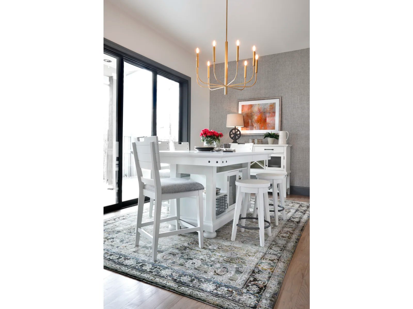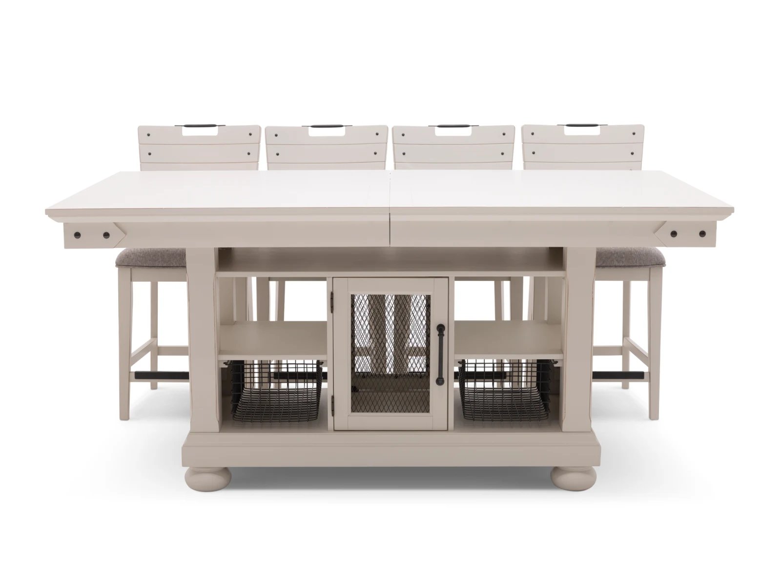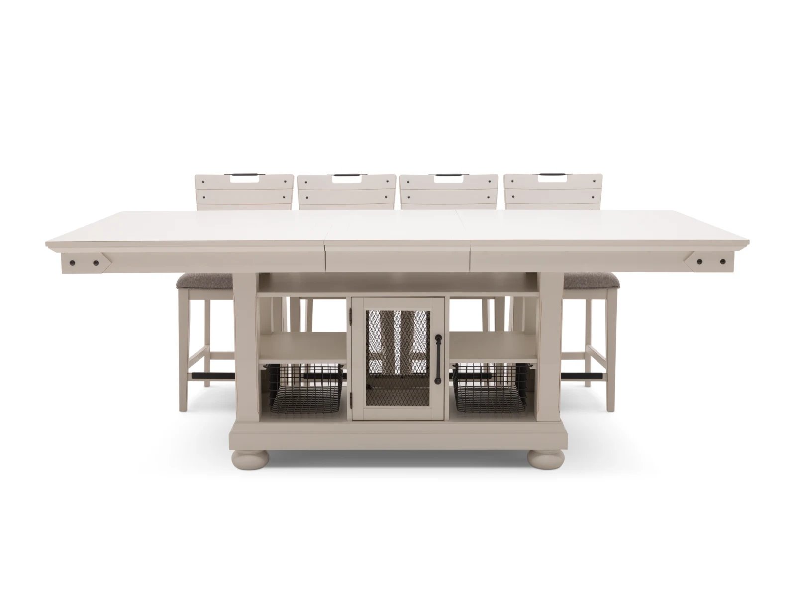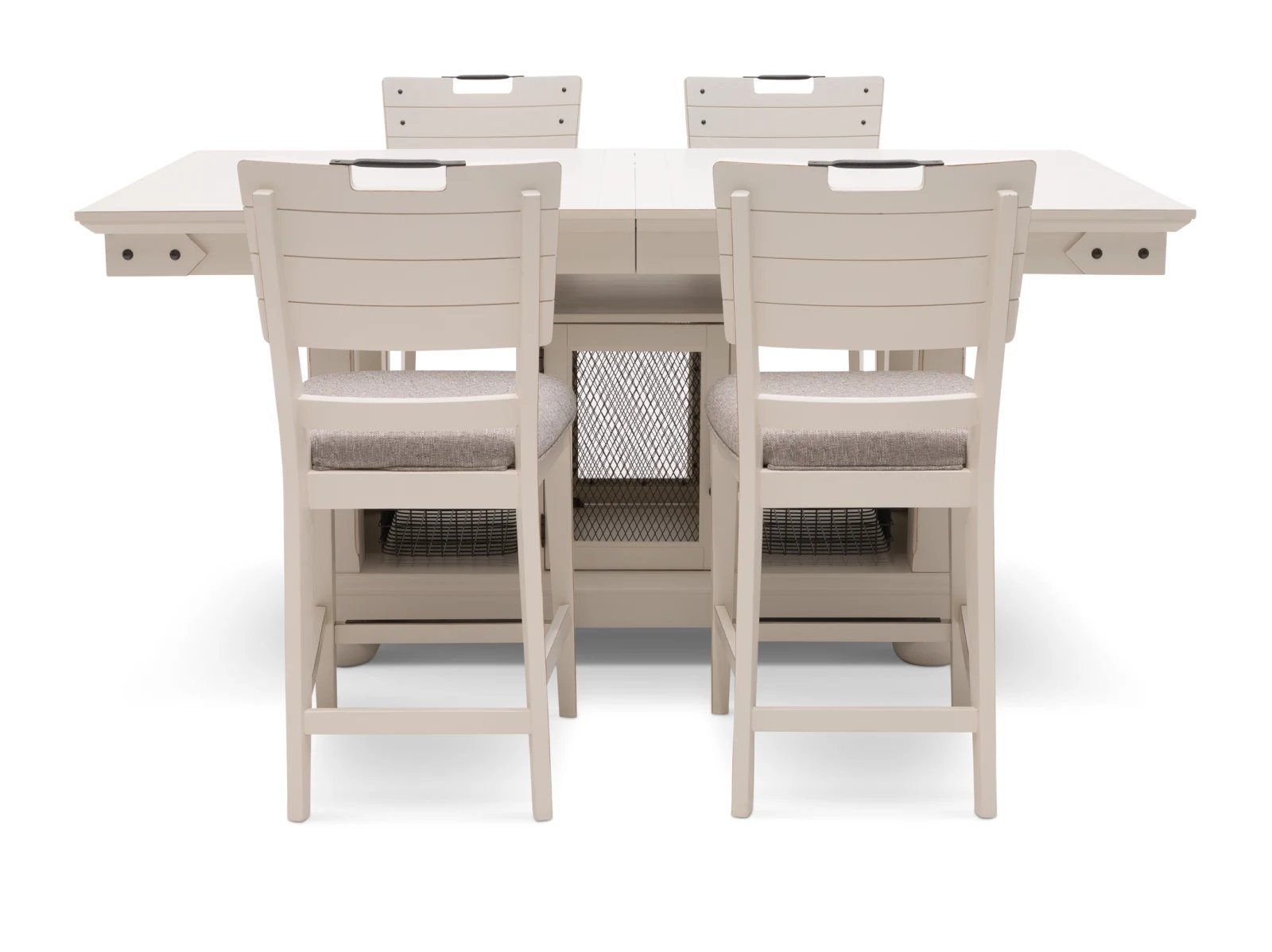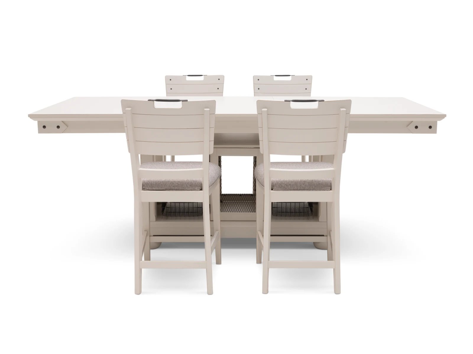 & Free ShippingThe Blanco Peak Counter Height Dining Set showcases uncommon design with hints of industrial influence to provide a style that is as intriguing as it is approachable. The items in this set are built from solid hardwood and clad in birch veneers finished in a clean white color. The supremely functional counter height island table features a butterfly leaf top paired with an attractive storage base outfitted with bun feet, storage shelves, cabinet space, and rustic pipe hardware which beautifully accents the ivory finish. The four flanking barstools display shiplap style backs, light grey seat fabric, and matching black metal accents. Add some personality to your dining space with the fabulous Blanco Peak 5 Pc. Counter Height Dining Set.