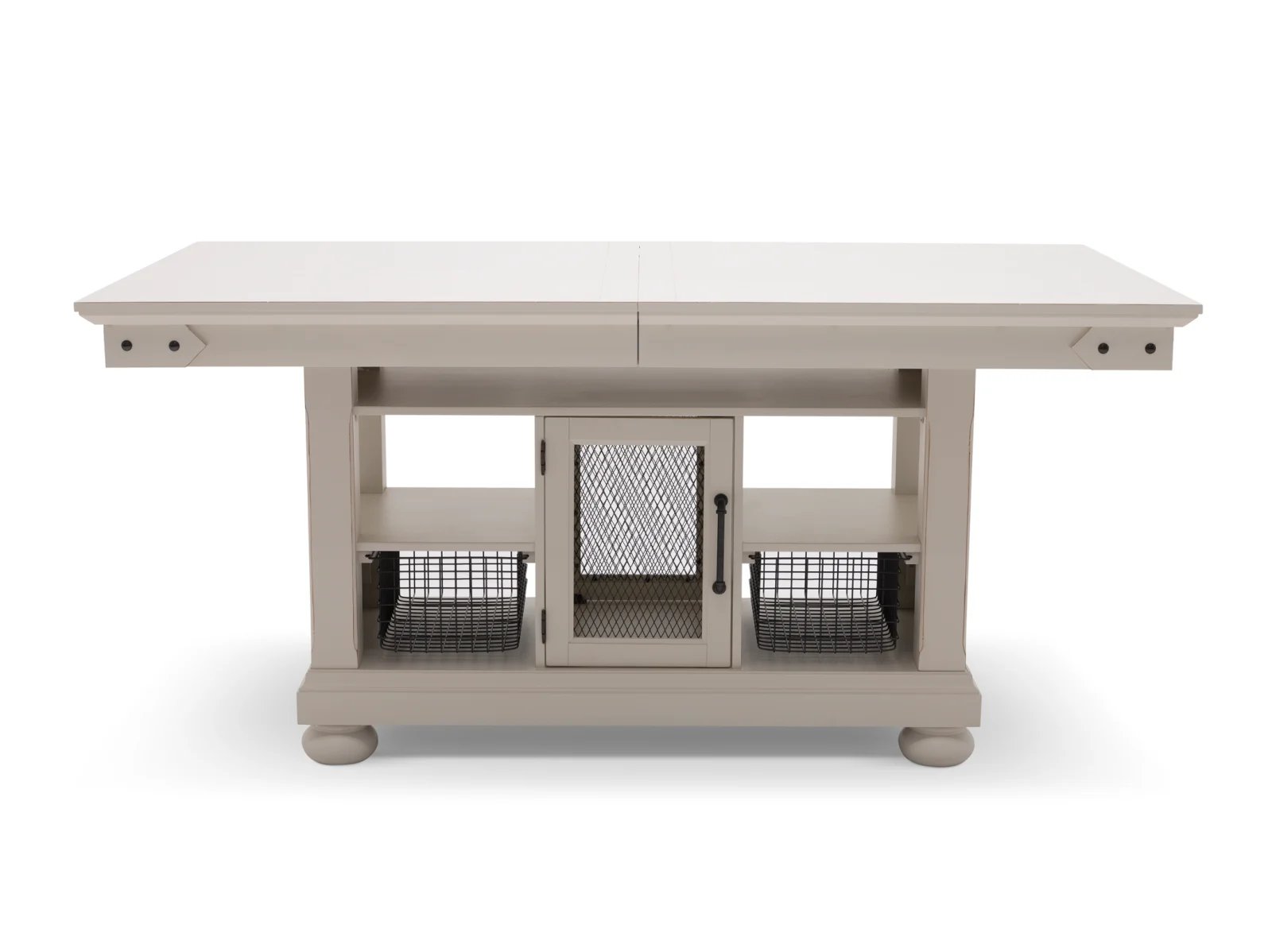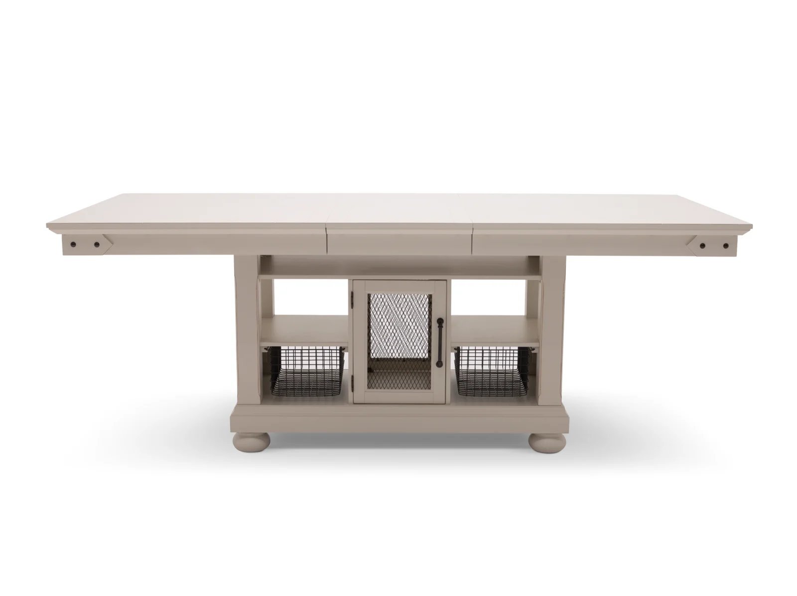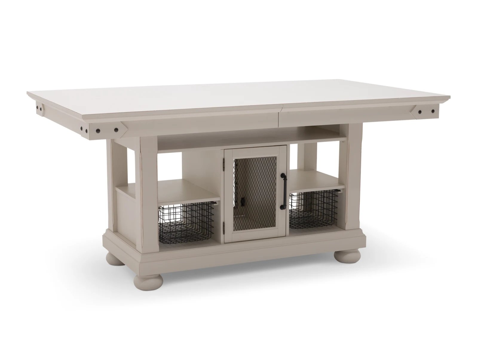 & Free ShippingThe Blanco Peak Counter Height Island Table is supremely functional and delivers an attractive, uncommon aesthetic. Built from hardwood solids with birch veneers in a lightly distressed white finish, the Blanco Peak’s butterfly leaf table top allows it to expand with ease. Underneath this inviting top you’ll find a storage base which is packed with a variety of shelves around a central cabinet space. The Blanco Peak rests on round bun feet, and it showcases black metal pipe hardware which bestows a hint of industrial influence while expertly contrasting the surrounding pure white finish. Take home the Blanco Peak Counter Height Island Table today, and be sure to consider the complementary options in the Blanco Peak Dining Collection.