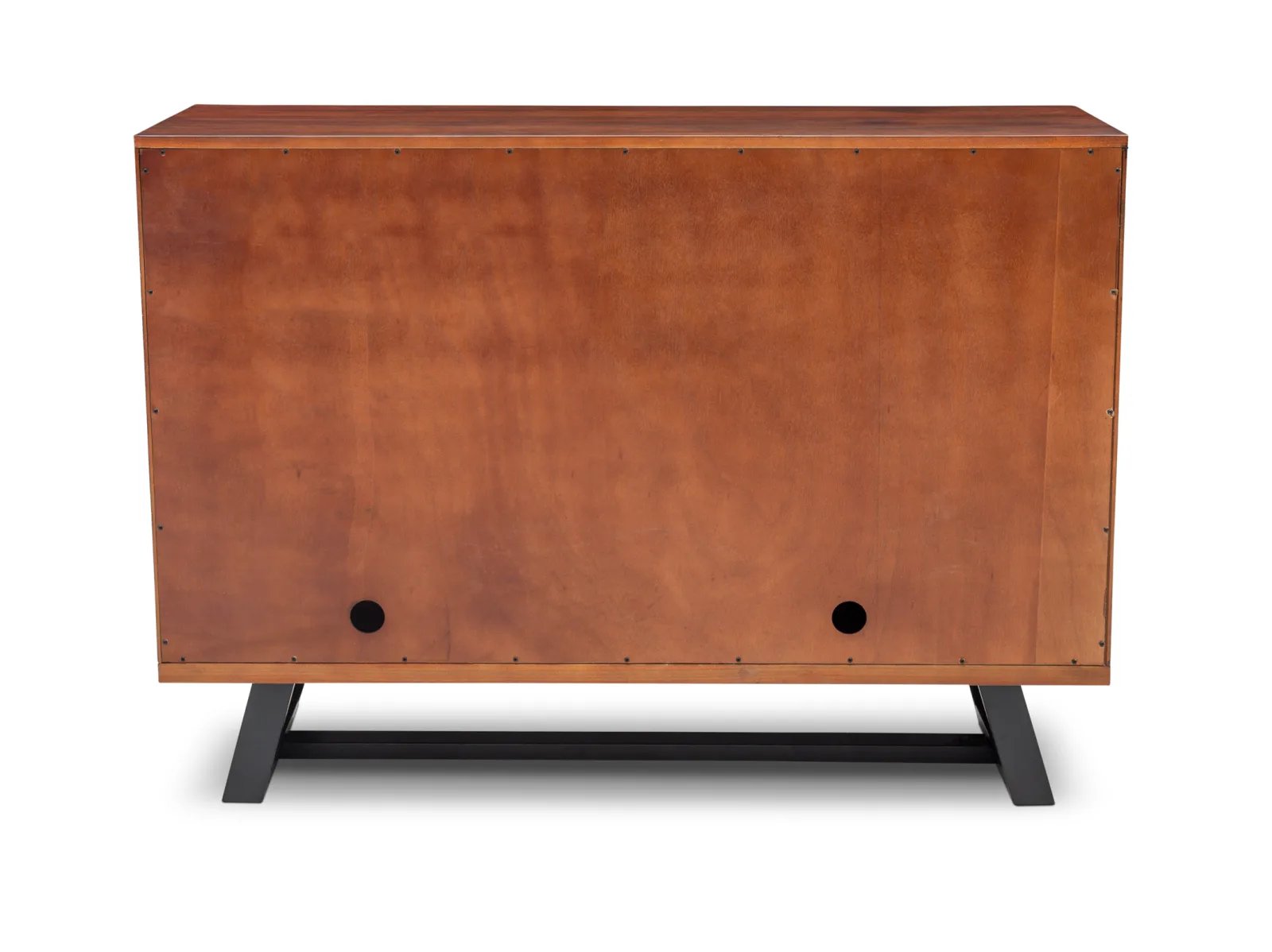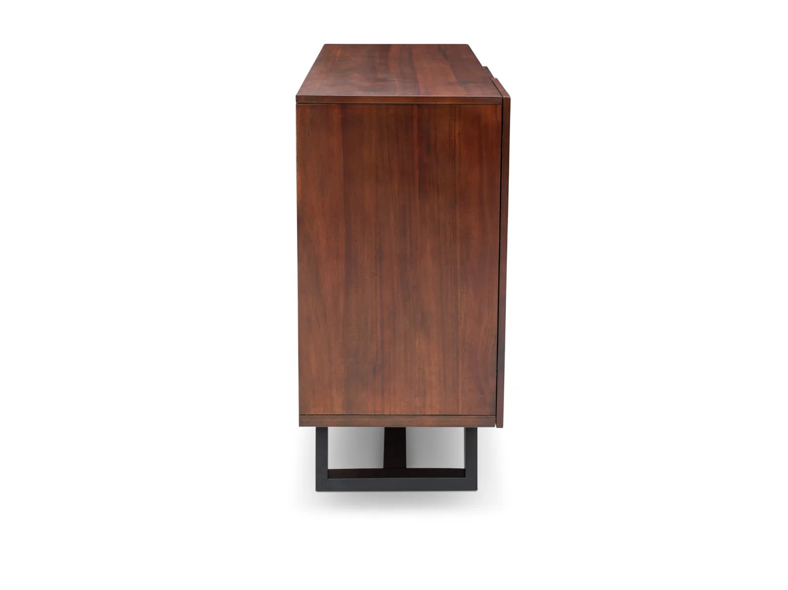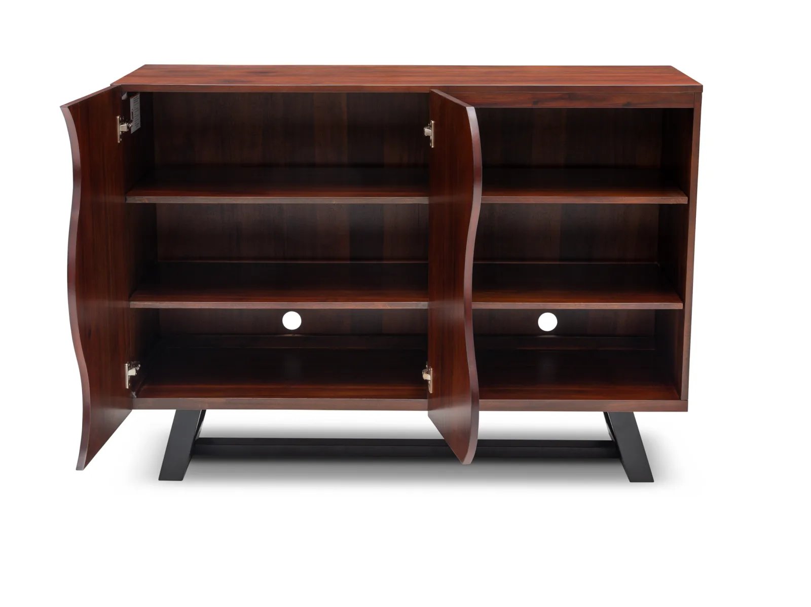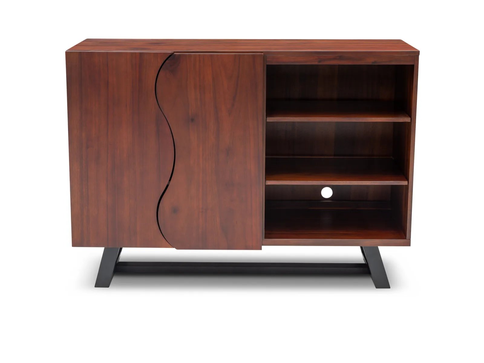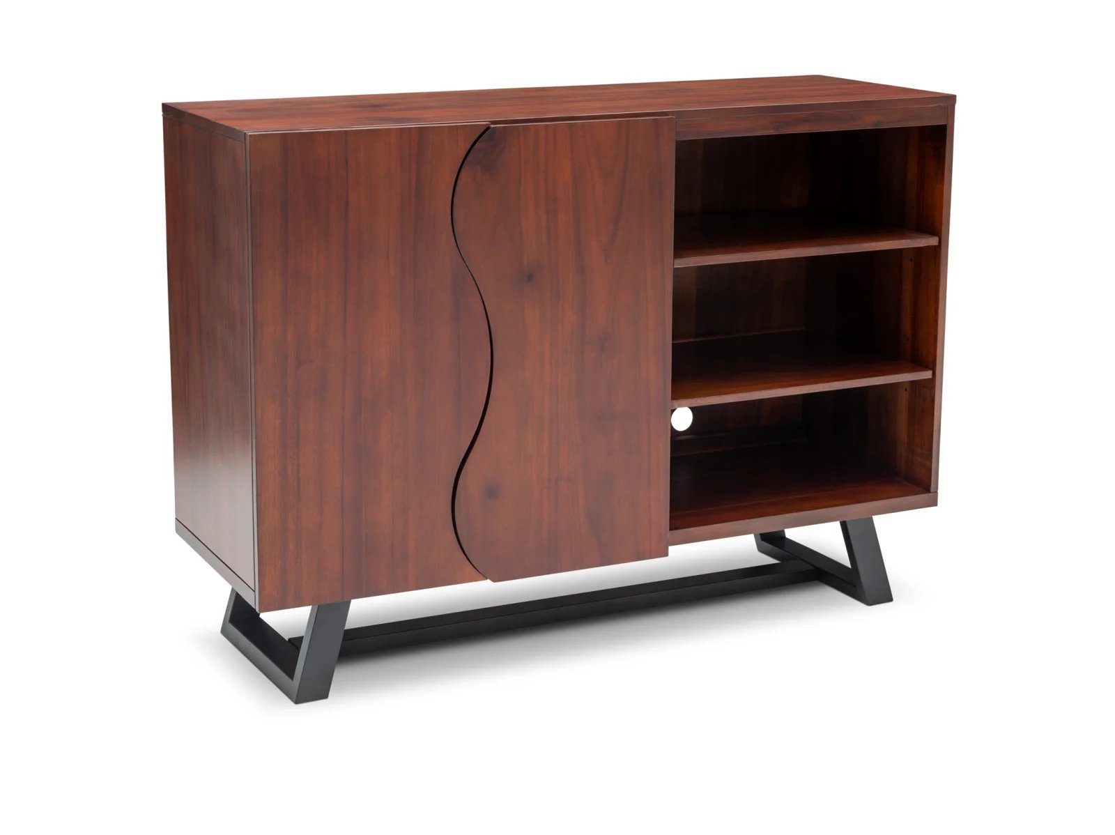 The Boundary Server combines rustic and industrial design elements into one stylish storage solution. Made from acacia with acacia veneers in a natural finish, this server features three open storage shelves as well as a roomy closed cabinet space for all your dining essentials. The Boundary rests atop angular metal legs in a matte black finish to instill a hint of industrial style, and it showcases curved cabinet doors which perfect its distinctive look while complementing the live-edge accents found in the rest of the Boundary Dining Collection. Add this charming server to your collection today.