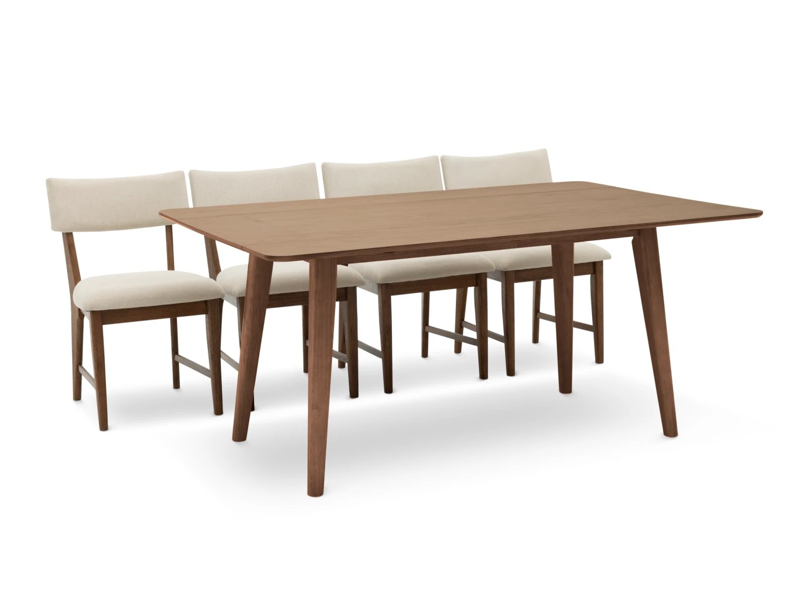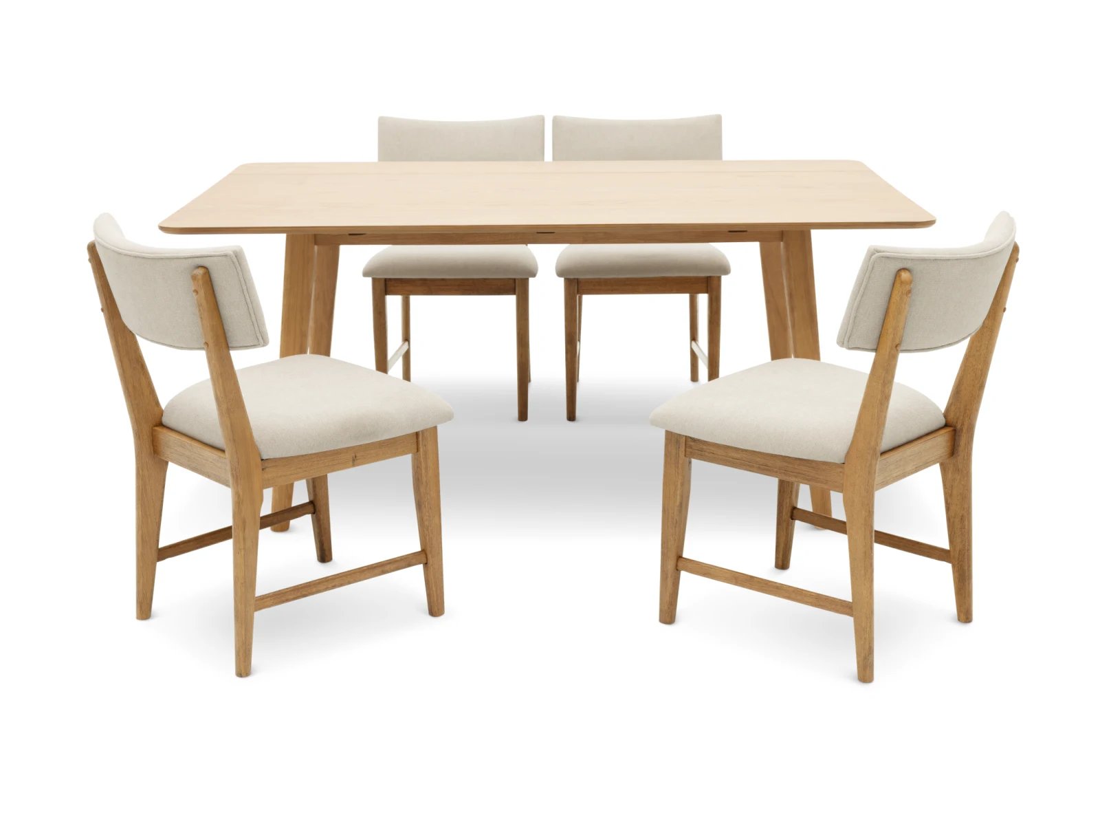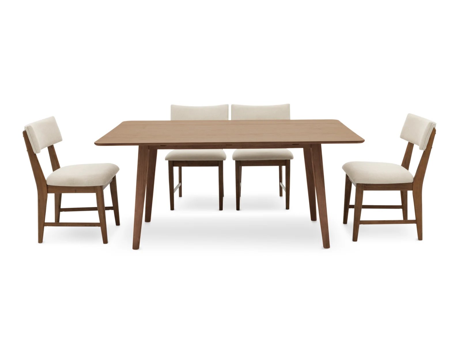 Blending an organic modern edge with approachable comfort, the Bowie Harvest 5 Pc. Dining Set brings fresh style to your dining space. The set includes a rectangular table with space-saving drop leaves and four dining chairs, all crafted from sturdy rubberwood solids and high-quality American oak veneers in your choice of natural or chestnut finishes. Chunky and tapered legs, paired with a wire-brushed surface, lend rich texture and visual depth to each piece, while white upholstered seats and backs ensure the chairs are as inviting as they are stylish. Make everyday eating an indulgent affair with the Bowie Harvest 5 Pc. Dining Set.