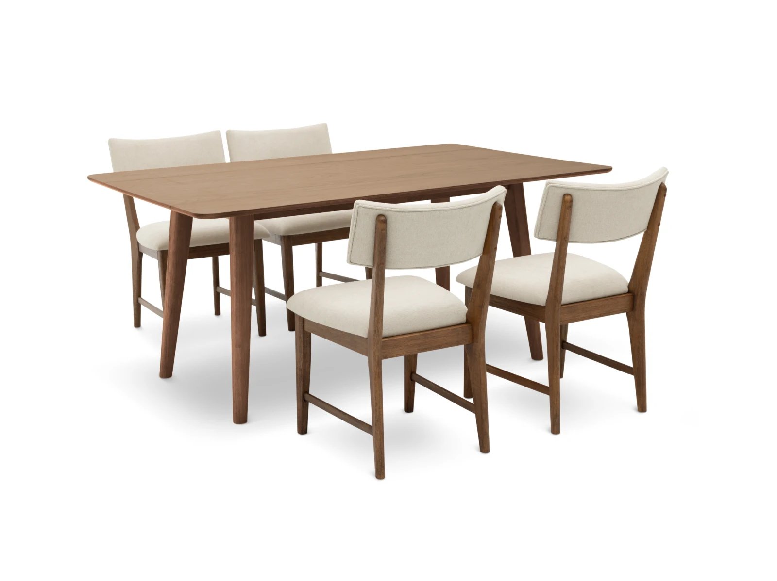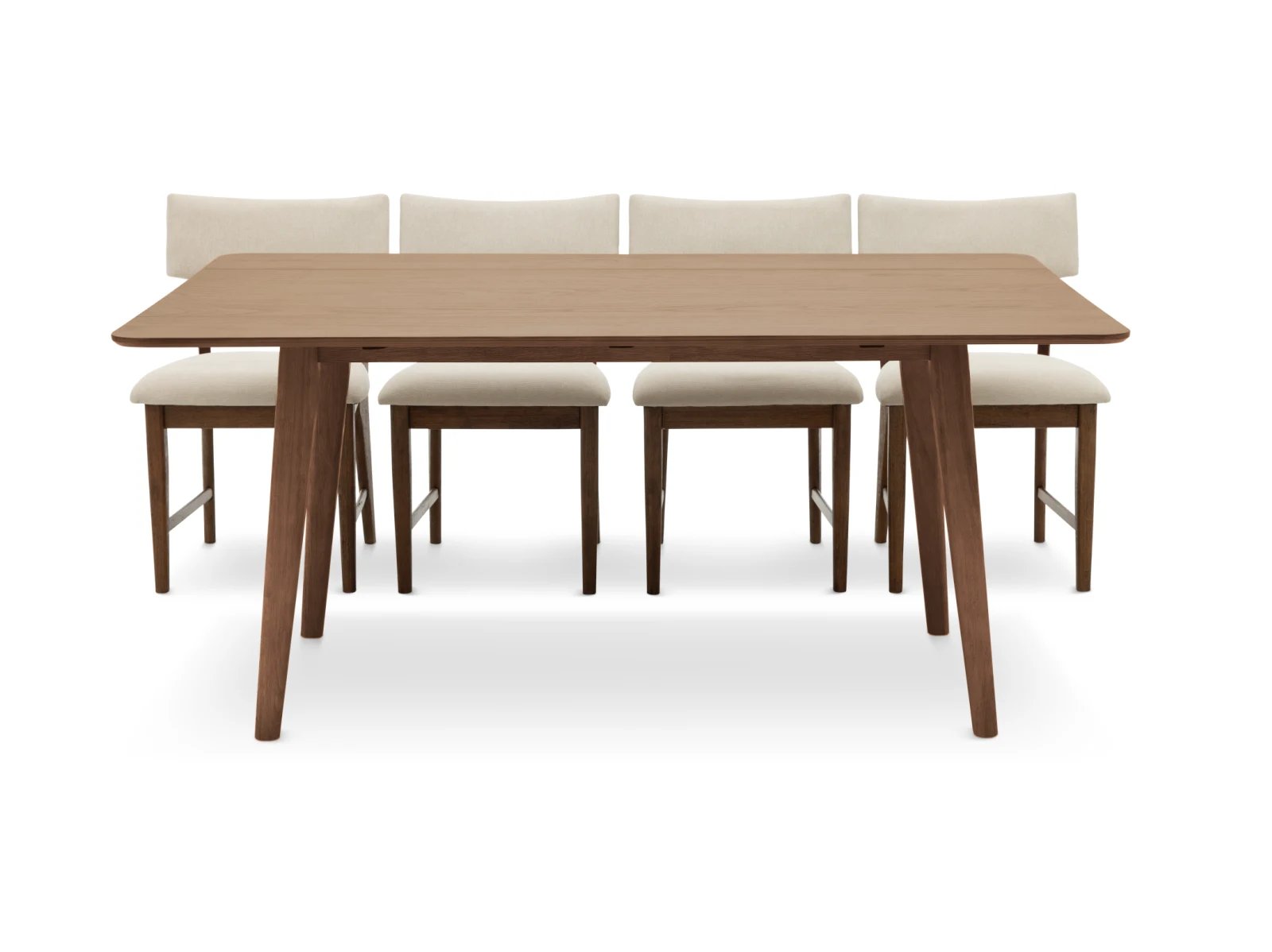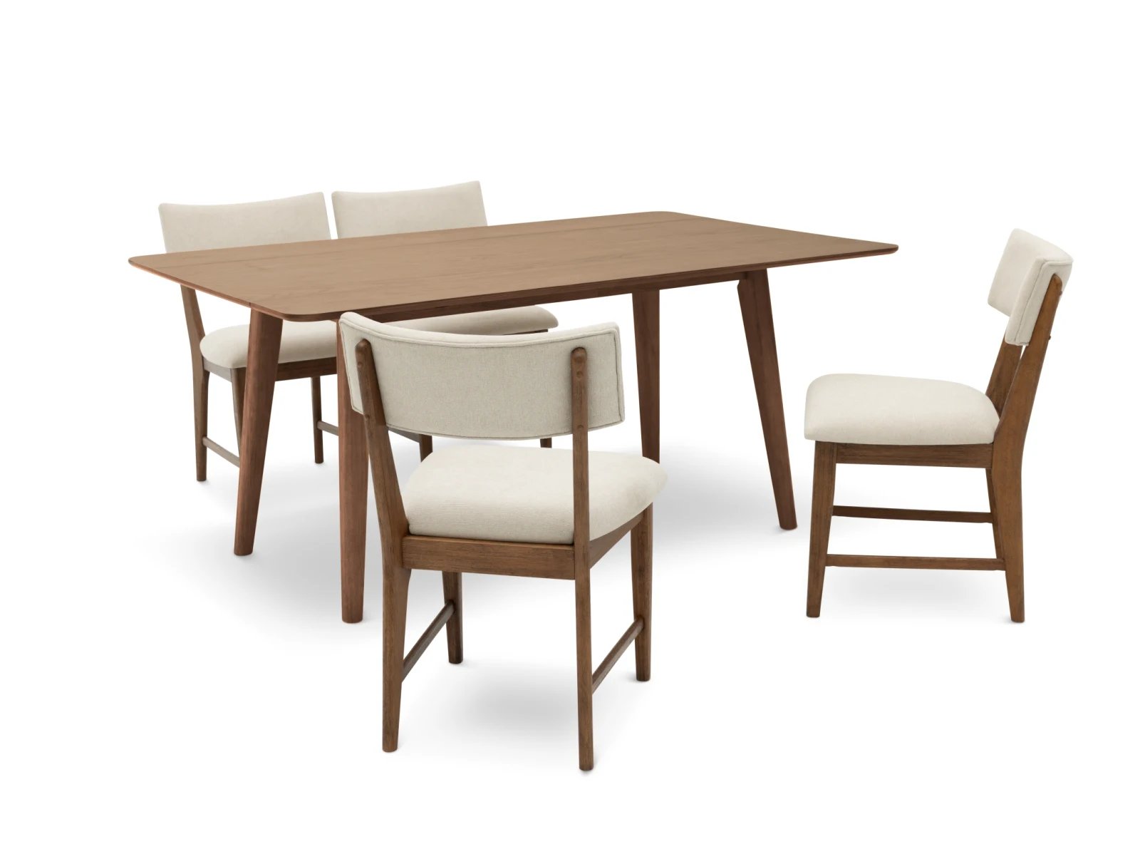 Blending an organic modern edge with approachable comfort, the Bowie Harvest 5 Pc. Dining Set brings fresh style to your dining space. The set includes a rectangular table with space-saving drop leaves and four dining chairs, all crafted from sturdy rubberwood solids and high-quality American oak veneers in your choice of natural or chestnut finishes. Chunky and tapered legs, paired with a wire-brushed surface, lend rich texture and visual depth to each piece, while white upholstered seats and backs ensure the chairs are as inviting as they are stylish. Make everyday eating an indulgent affair with the Bowie Harvest 5 Pc. Dining Set.