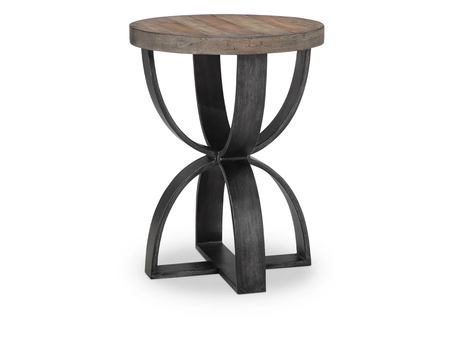 With echoes of equestrian inspired fashion, Brazen extends rustic hospitality with upscale appeal. Distressed iron has been artfully forged into a stirrup like 'U' shape and rests inside squared bases to uniquely support aged looking Rustic Honey wood tops on the rectangular end table, cocktail table and sofa table. Mirror image interlocking 'U's' create the exceptionally striking round accent table base to complete a great room with that perfect accessory piece.