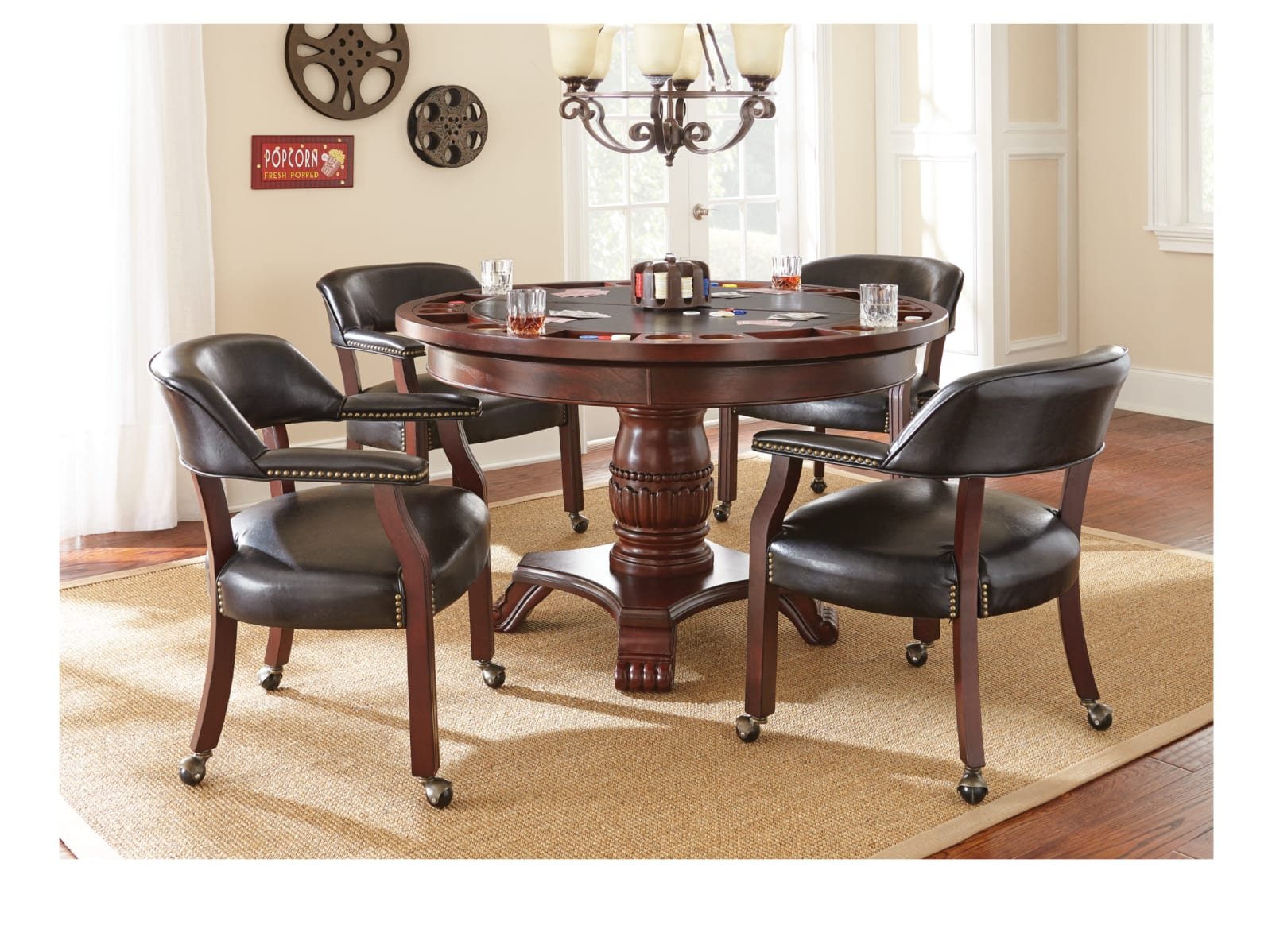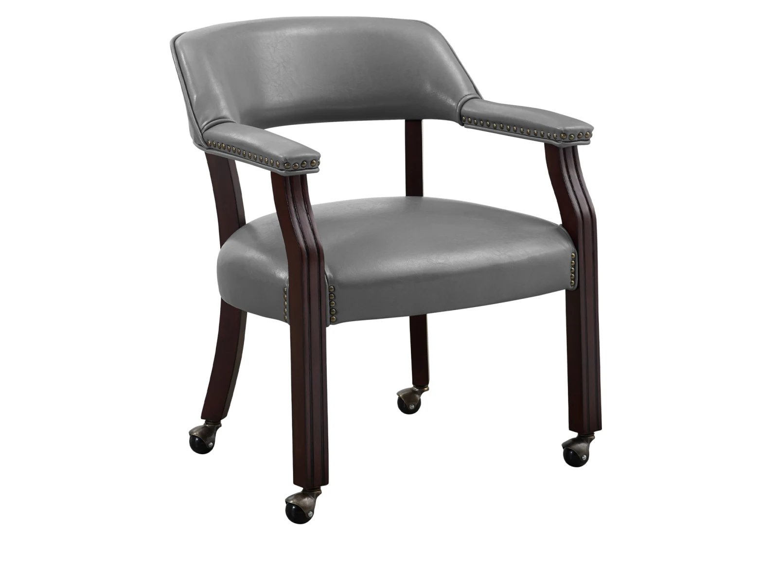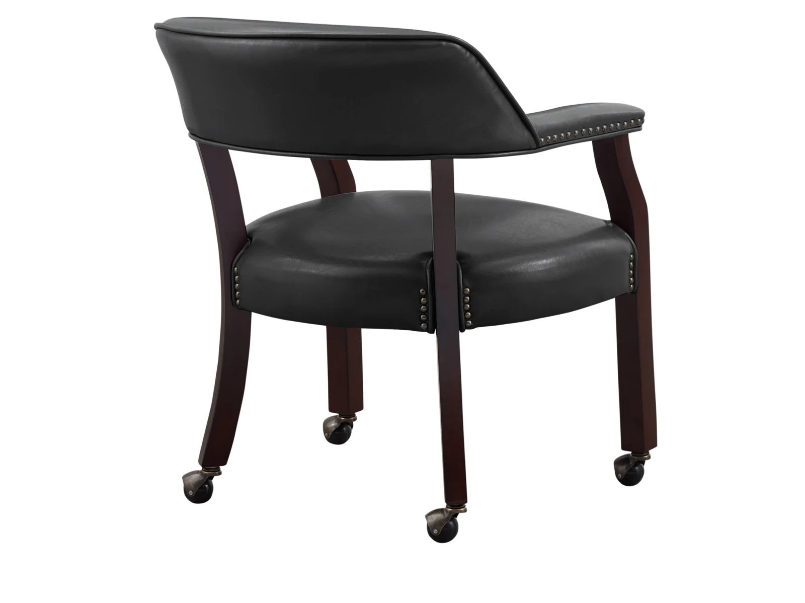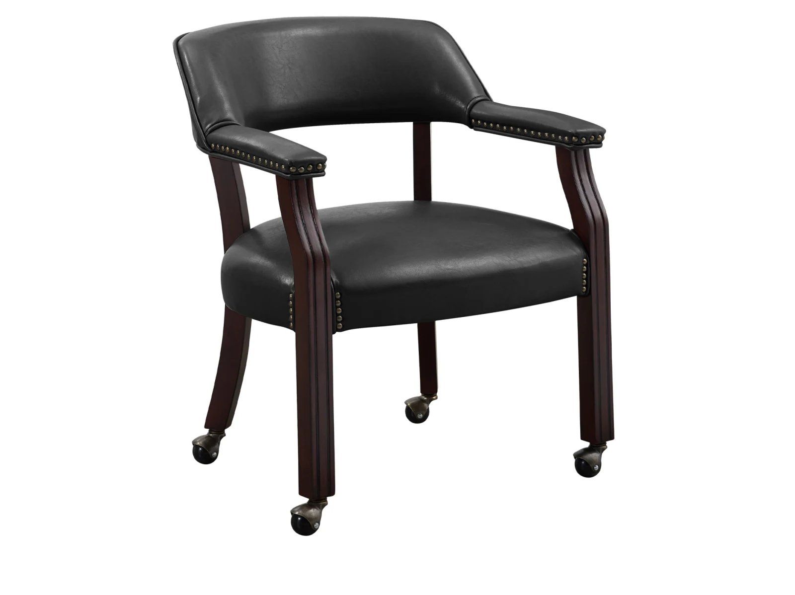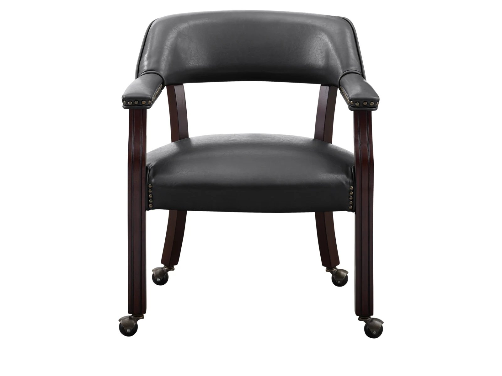 & Free ShippingEnjoy both game night and dining night with this dual-purpose dining and game chair. This upholstered captain’s chair is castered for easy mobility and comes in 5 colors available. The chair features nailhead trim and rich colored finish to work well on game night or for dining.  Upholstered in vinyl, this Captain’s Chair is easy-to-clean and extremely comfortable.
